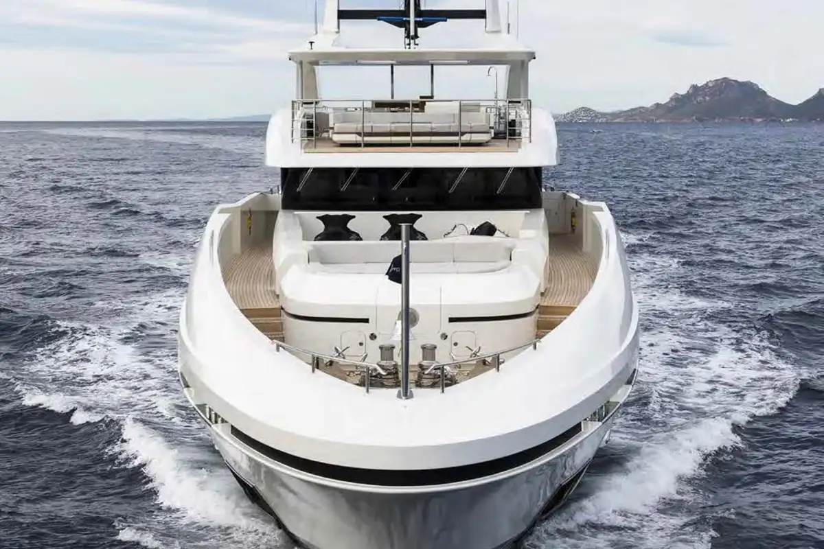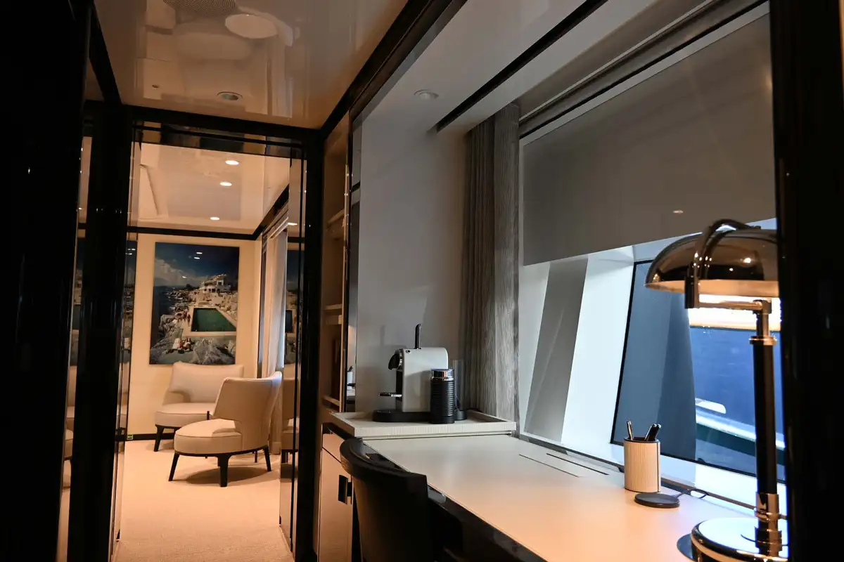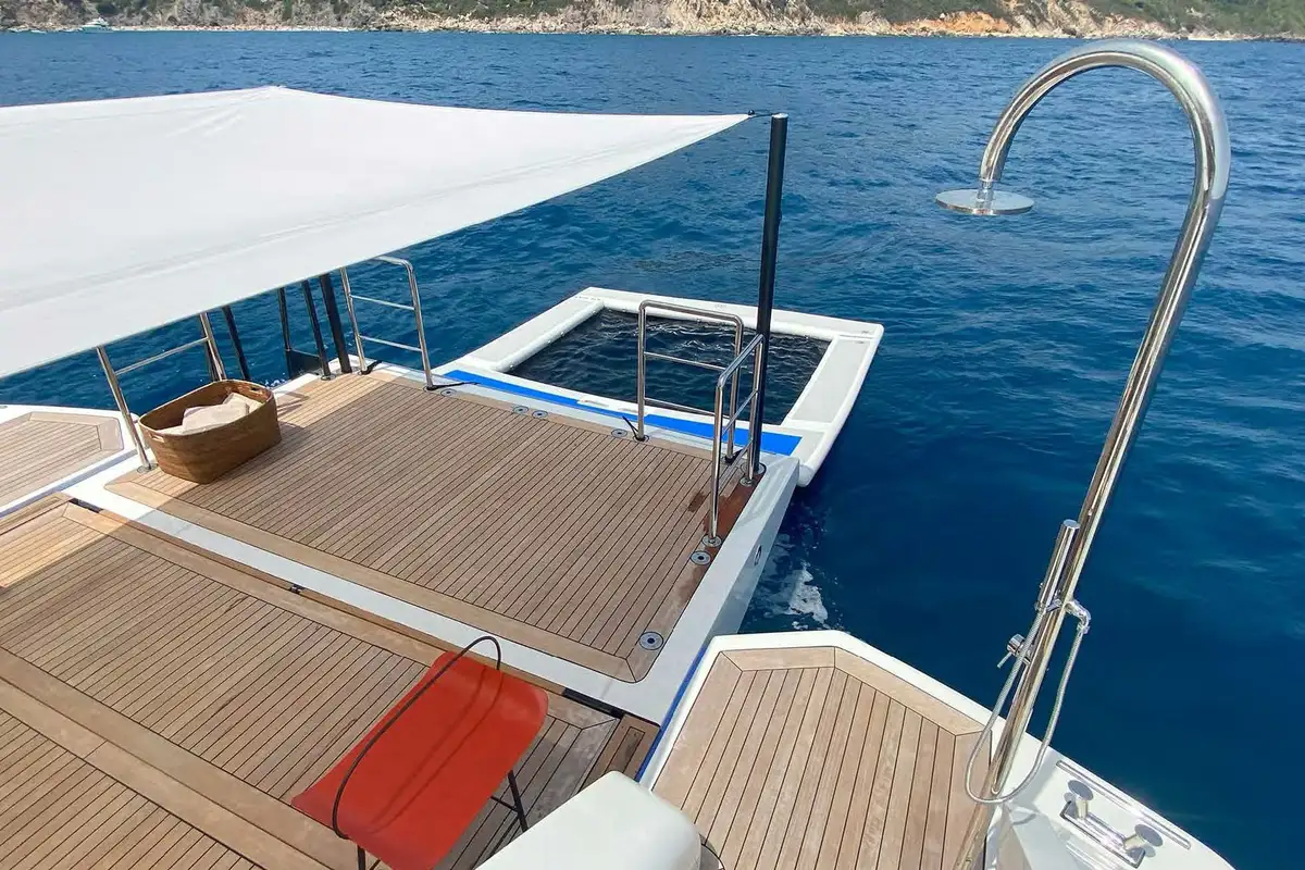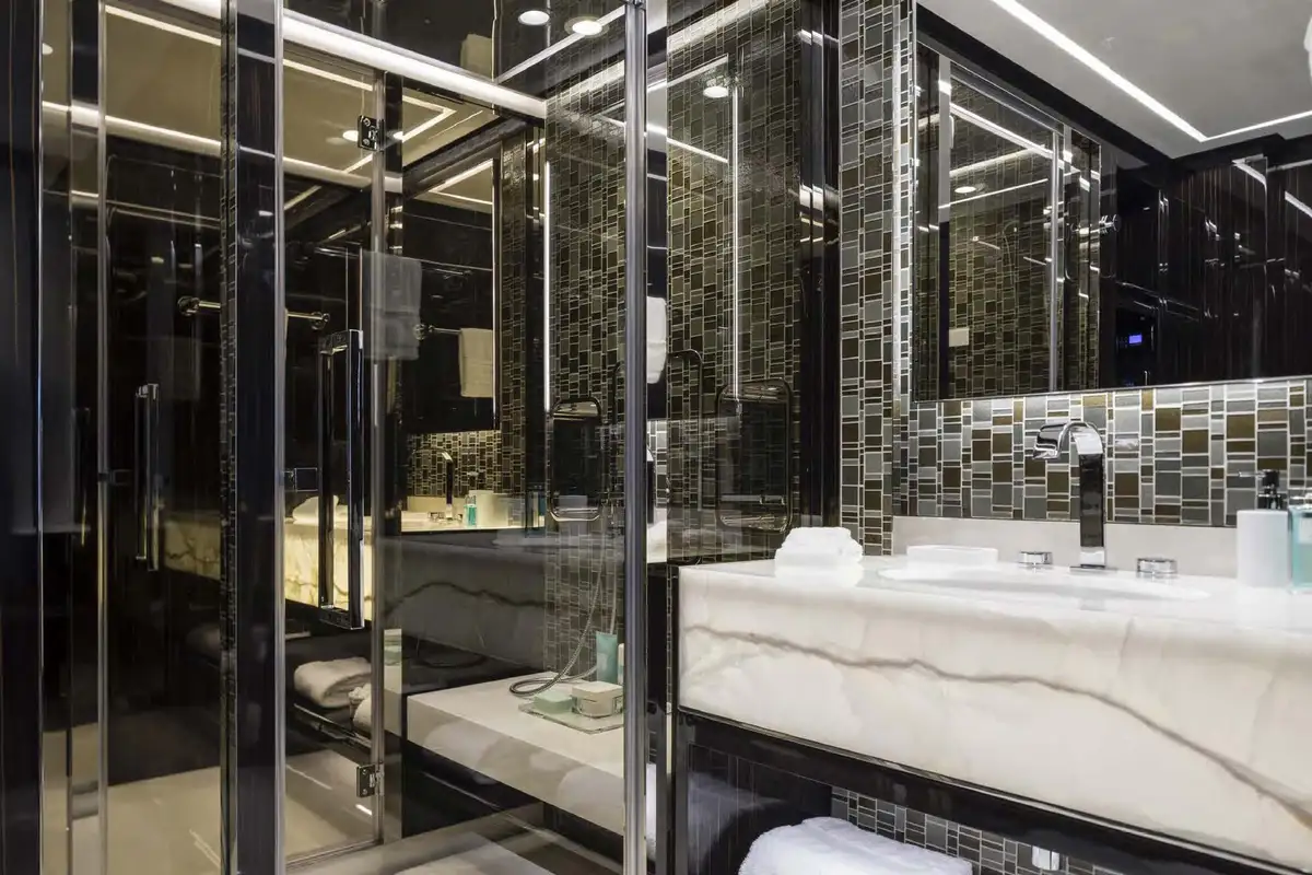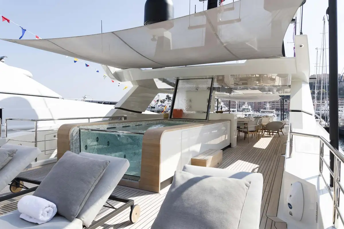 ANDIAMO’s standout feature is surely her infinity pool with its innovative waterfall effect. It enjoys elevated views from its position on the sun deck, where there’s also a bar counter, an expanse of cushioned sun pads, and space to dine alfresco.