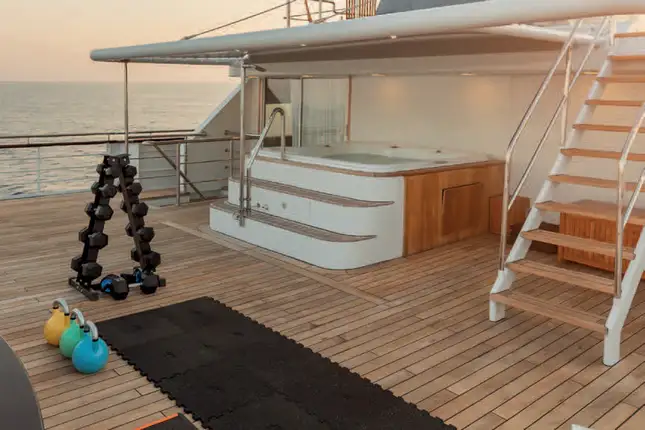 Just a few steps down, the oversized jacuzzi faces aft and benefits from the shade of a bimini structure. Raised, plush daybeds for sunbathing and perhaps even a snooze can also be found on this deck, or, if you are feeling more energetic, work up a sweat with the exercise equipment.