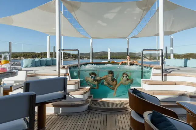 • Oversized jacuzzi for 12 guests on sun deck with bar and lounging area
