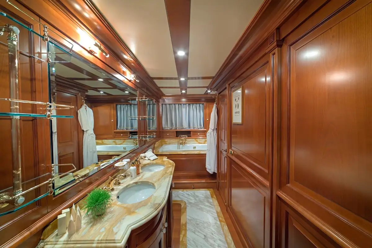 The main deck master suite is a sumptuous private sanctuary tailored to relaxation. Featuring a writing desk, sofa seating and a stunning en suite bathroom – with his and hers sinks and a spa bath – it will fulfil all your guests’ needs. A second master suite is located on the lower deck, and benefiting from the full beam of AQUILA, this suite offers more space. It features a sofa, desk space and spacious full-beam en suite bathroom with his and hers sinks and a spa bath. Also, on the lower deck, there is a double VIP suite and two twin-berth suites, each with an additional pullman berth. This offers your party a variety of sleeping arrangements, whether you’re cruising with friends, children or relatives of any age.