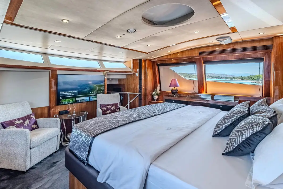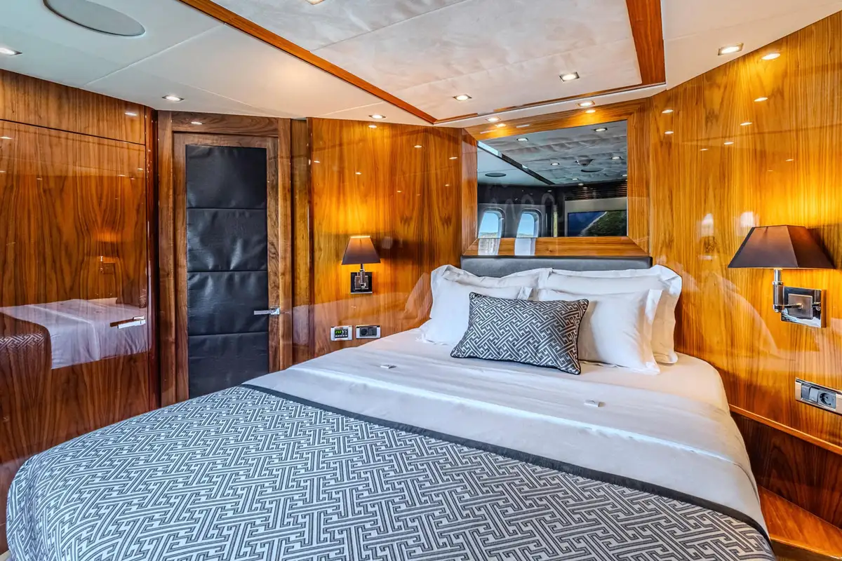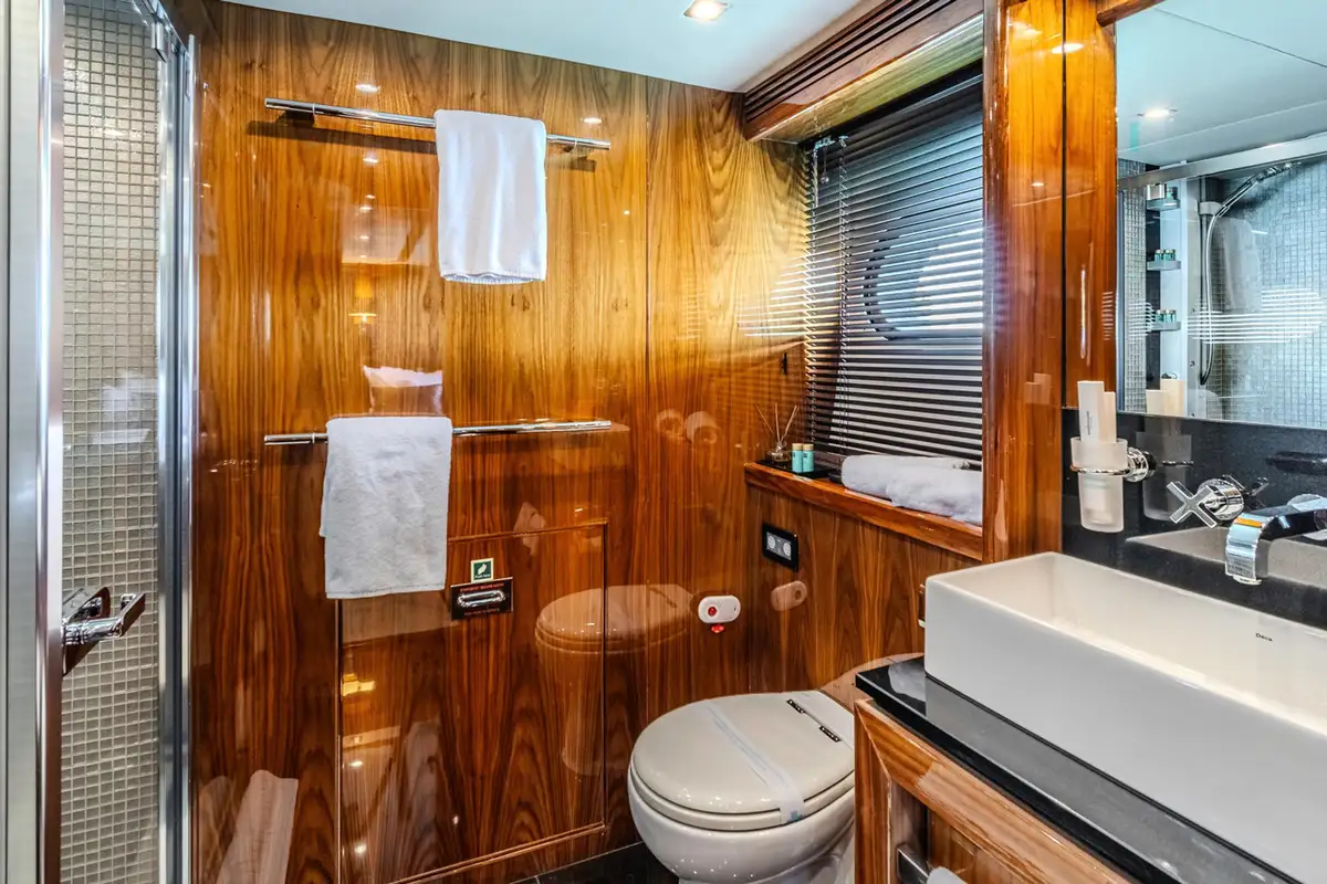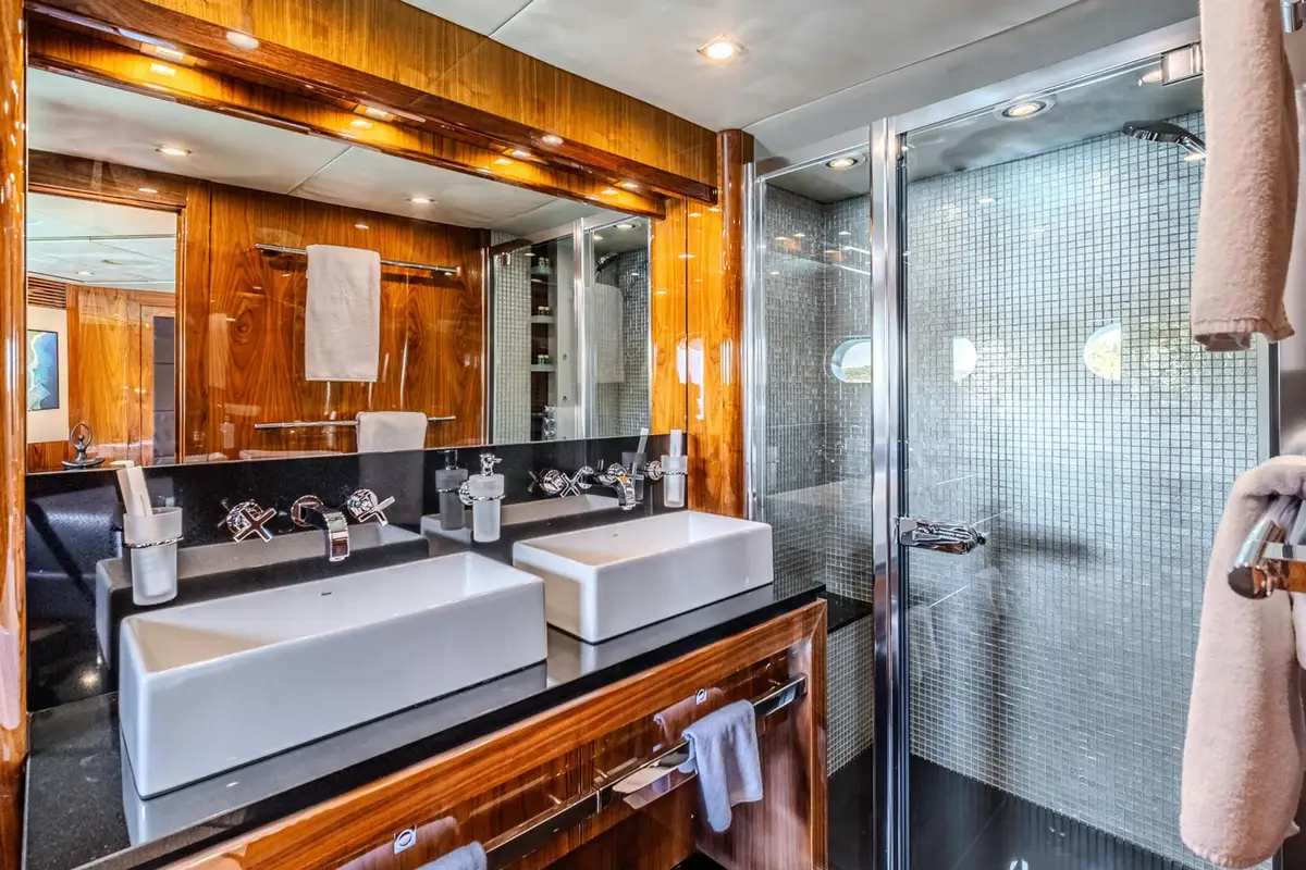 The spacious main deck master cabin gives 180-degree visibility with a walk-in wardrobe on the main deck. Stairs then lead forward to a private en suite bathroom with twin wash basins, bath and separate shower cubicle.