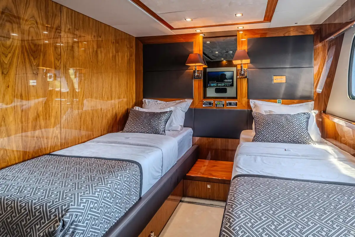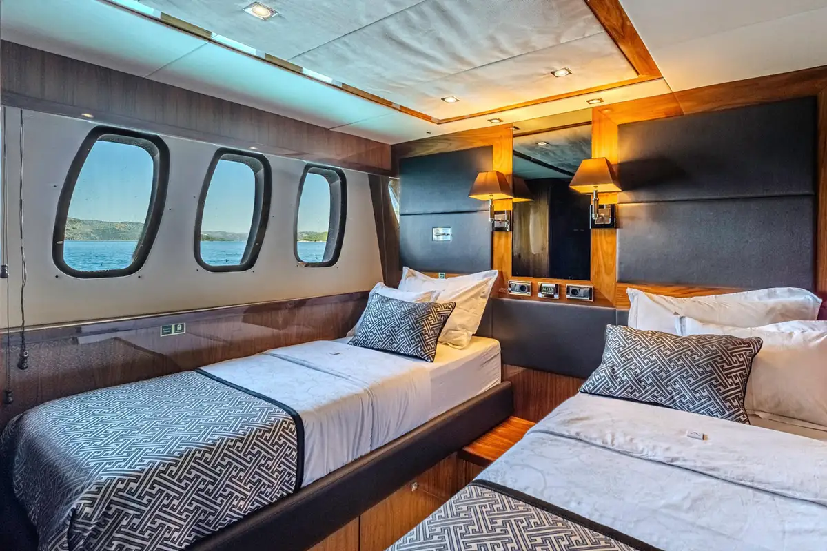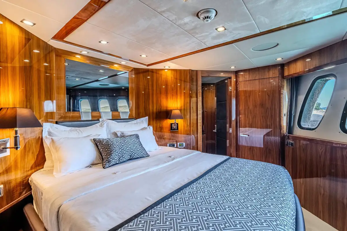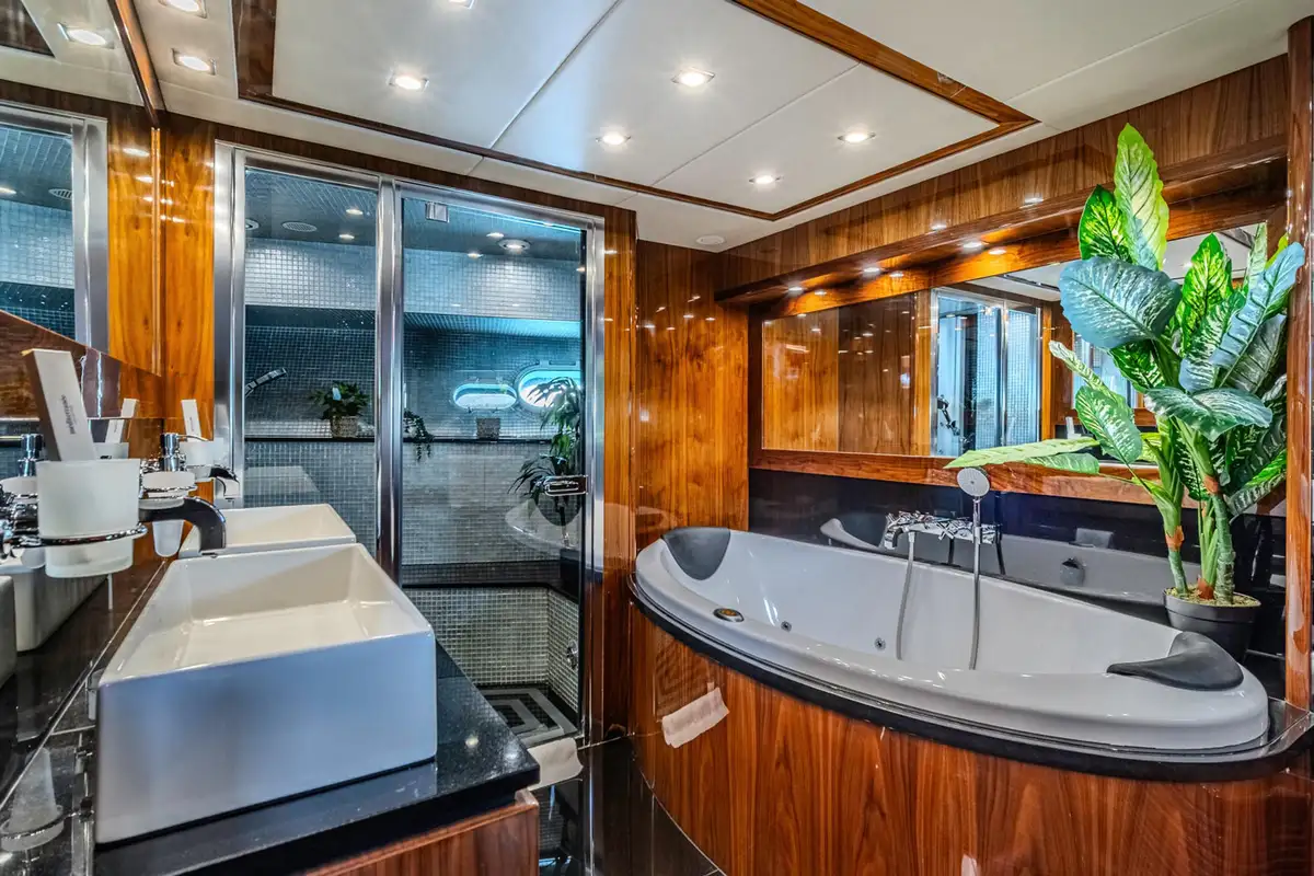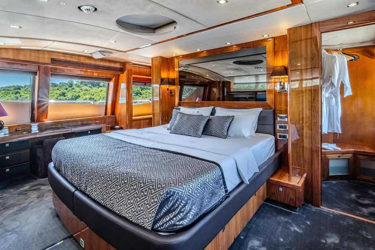 The spacious main deck master cabin gives 180-degree visibility with a walk-in wardrobe on the main deck. Stairs then lead forward to a private en suite bathroom with twin wash basins, bath and separate shower cubicle.