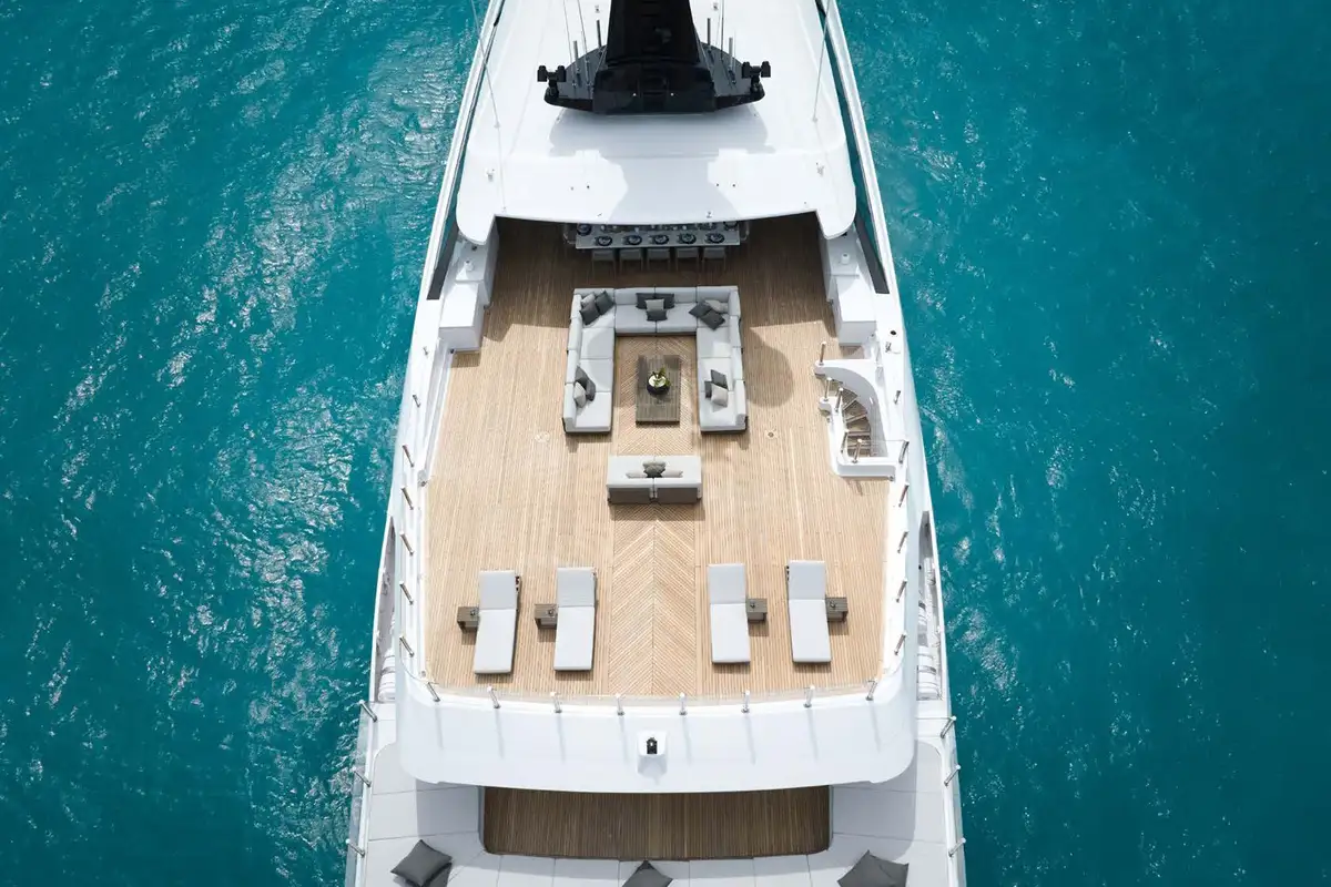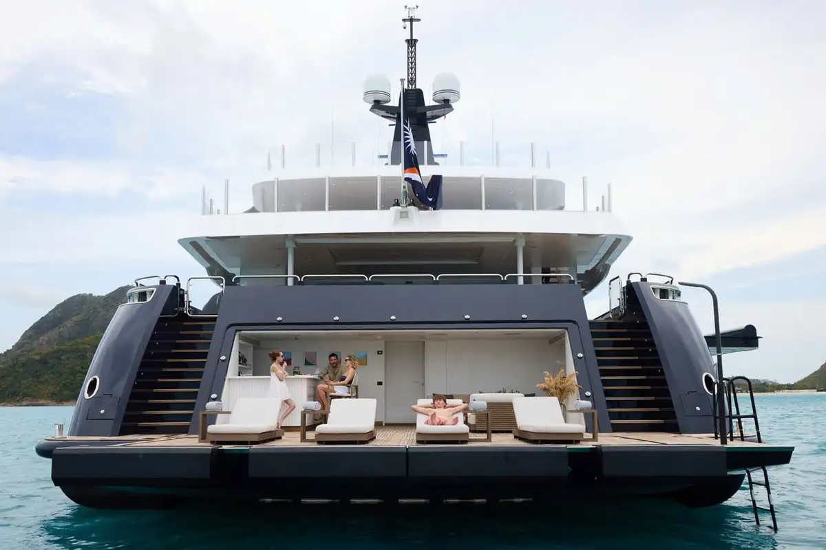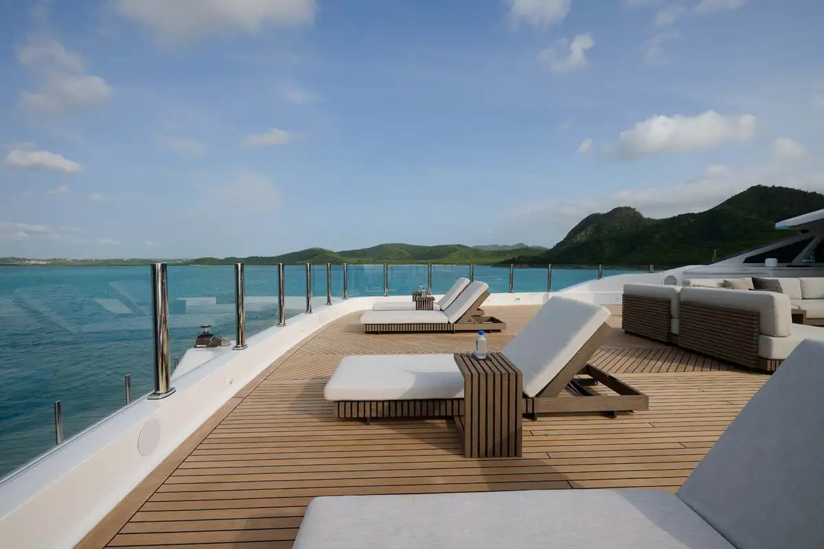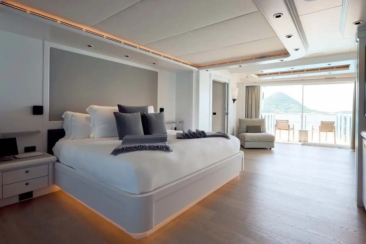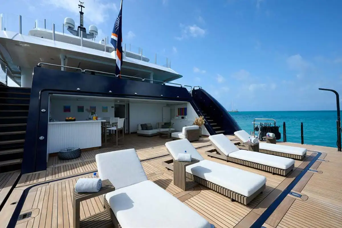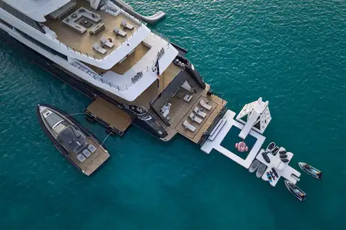 Take the elevator up to a huge sundeck, for a spectacular al fresco breakfast. You can soak in the jacuzzi, bathe in the sun lounge aft or take the inflatable slide down to water level and swim round to the beach club’s bar and lounge. The crew can’t wait to help you make the most of the toy selection. E-foils, e-surfs, SeaBobs, Sea-Doos, SUPs, kayaks, scuba, snorkel, tows and inflatables – even beach club golf with biodegradable balls.