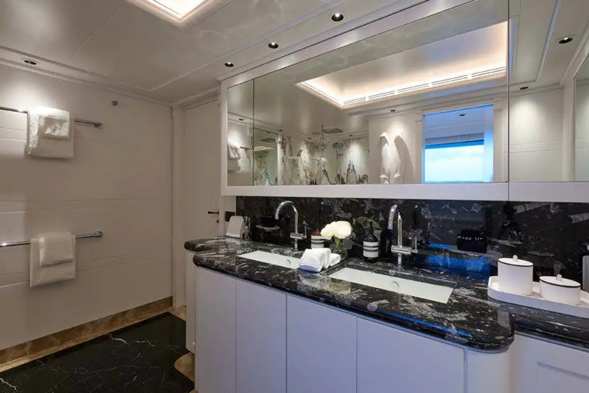 Start the day in the vast master suite, which is forward on the main deck. As well as his and hers en suites and walk-in wardrobes, there’s a private TV lounge and a massage room as well as a fold-down balcony, where you can sit and enjoy your coffee in the morning sun as you look forward to the day ahead. With 23 crew to keep you and your 12 guests delighted all day, you’ll want for nothing.