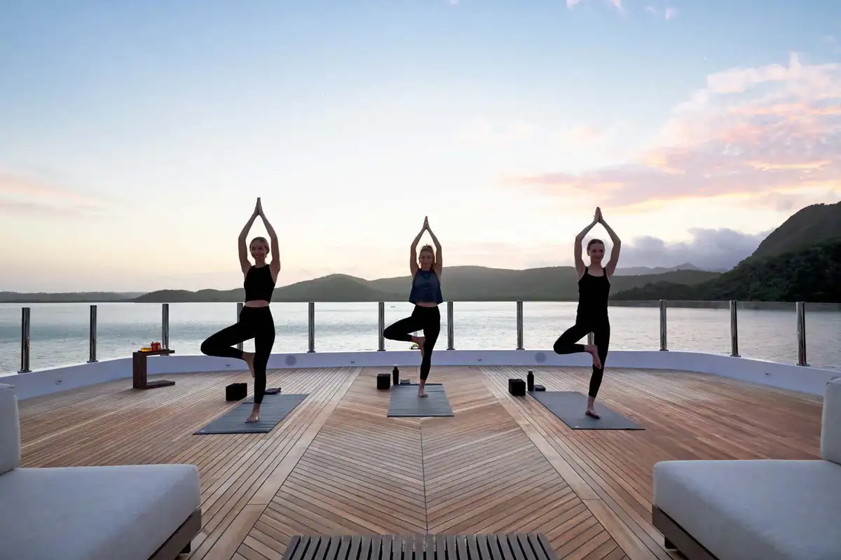 For lunch, you have a range of options. As well as the sundeck, there is a second outside dining option on the upper deck aft with drinks from the sky lounge bar. Perhaps you’d rather head for shore and play beach volleyball while the crew organises a beach BBQ?