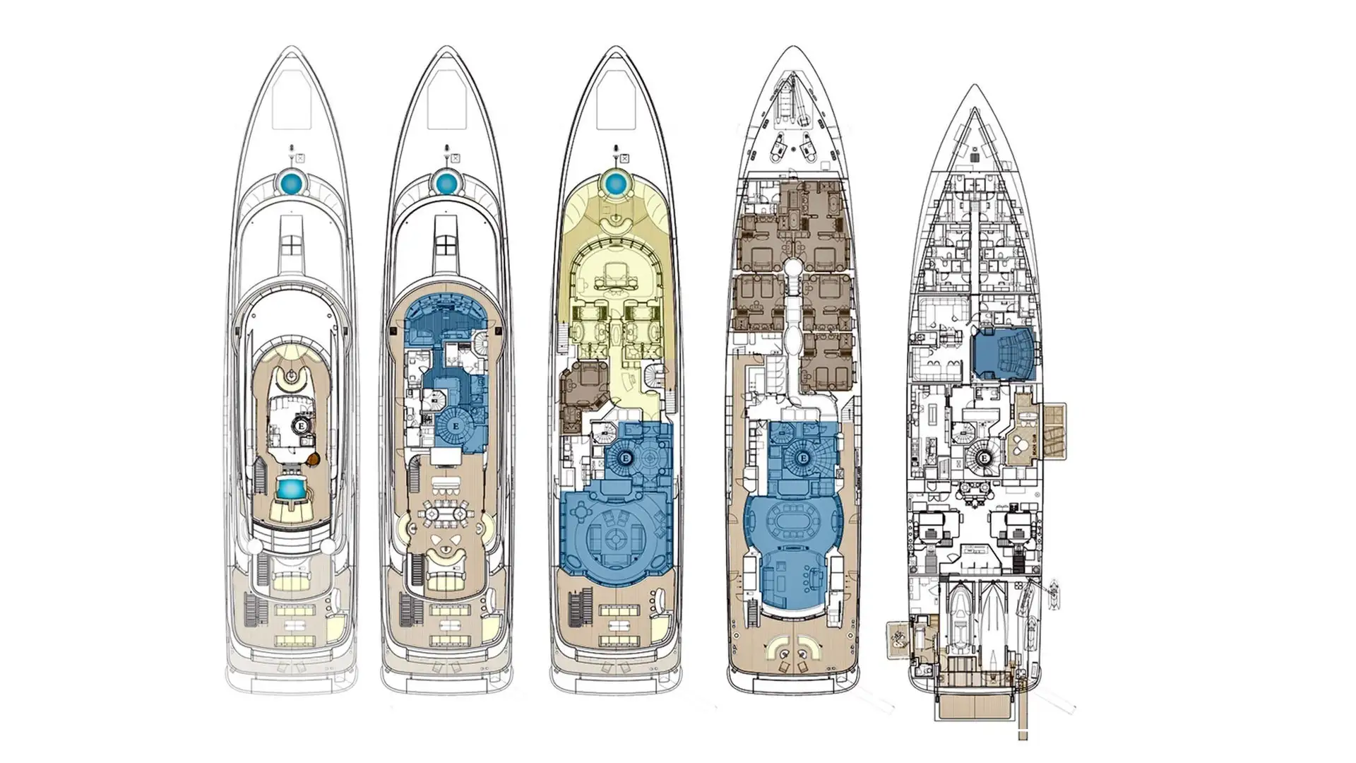 Accommodating guests in 7 cabins - 3 double and 2 twin cabins on the main deck, with the Master Suite and the 7th cabin on the owner's deck above, she is able to carry 12 guests and 2 staff. On the lower deck, there is a full cinema with reclining chairs, an open waterside gym and separate bar / spa lounging. On the main deck, in addition to the guests cabins, there is a welcoming bar and lounge area, interior dining room and welcoming half-moon exterior seating. On the Owner's deck, travelling forward through the private office with the 7th cabin to the port side is the Master suite with a 180-degree view and large private deck with seating and jacuzzi, his and her bathrooms (with bath and shower). To the aft of the Owner's deck, is a large and welcoming lounge with card table and opens onto the exterior deck where there is a bar and sofas. The bridge deck is all about the exterior with a large buffet for serving, dining table for 12 with wrap-around windbreaks to protect from the elements and cosy seating. On the sundeck is the spa pool with waterfall and forward seating area. All decks are connected by the central circular lift.