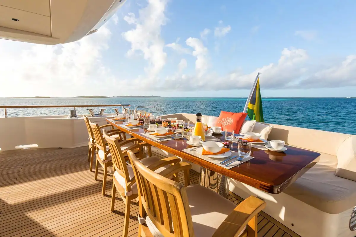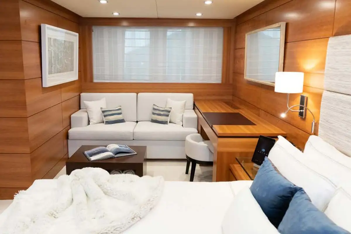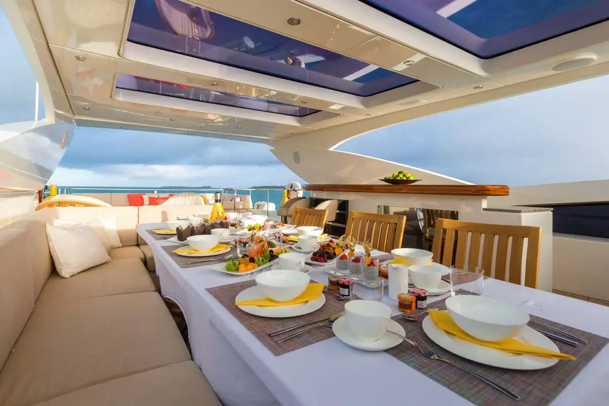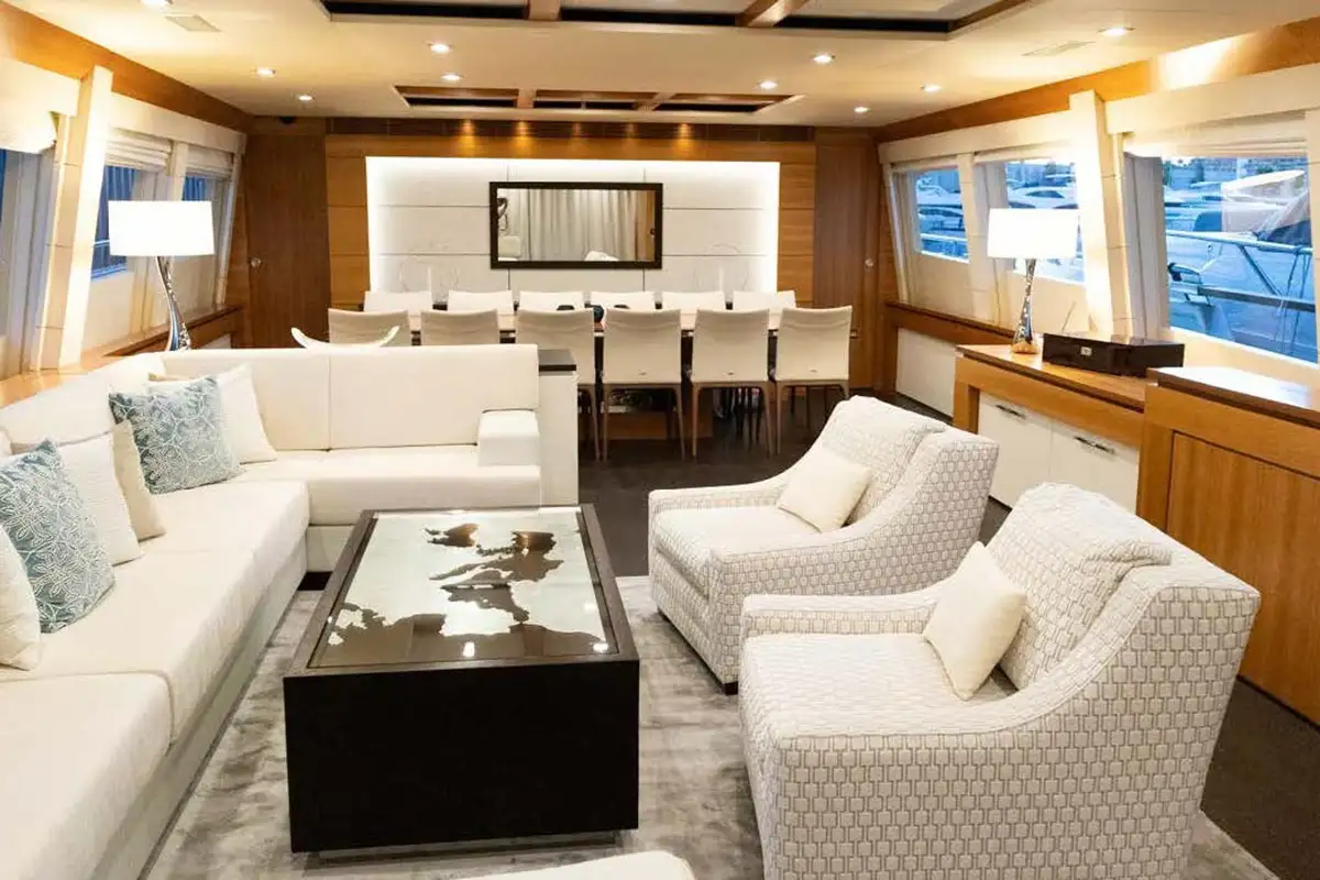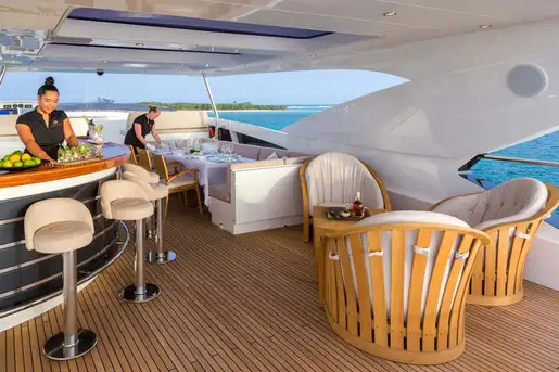The aft deck offers a very large rectangular dining table with seating for up to ten and a second dining area with hard-top shade and skylight is located on the sun deck above. The perfect area for relaxation or entertaining, the sun deck’s walk up full bar, sunbathing area aft and three oversized chairs are sure to keep guests happy all day long.