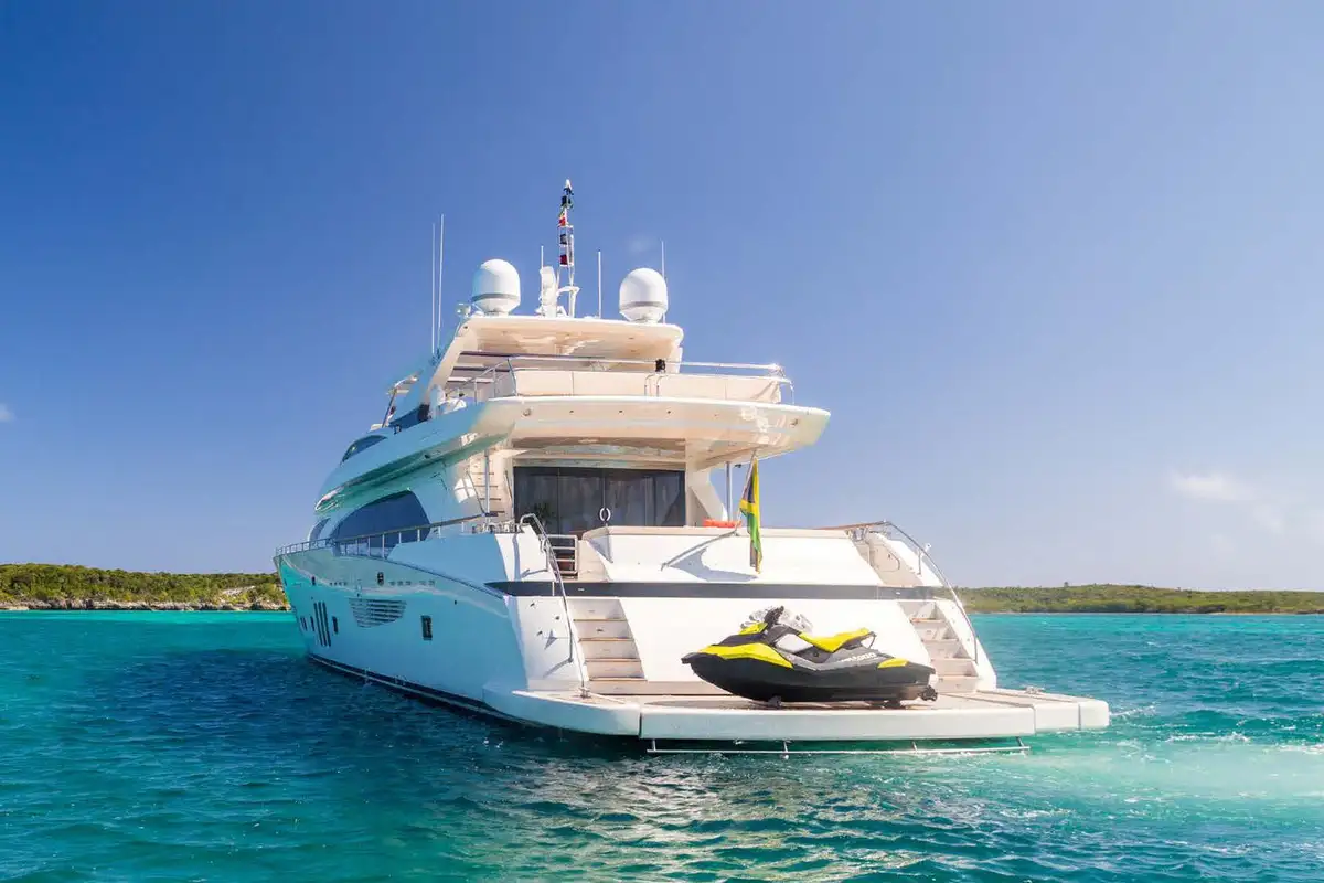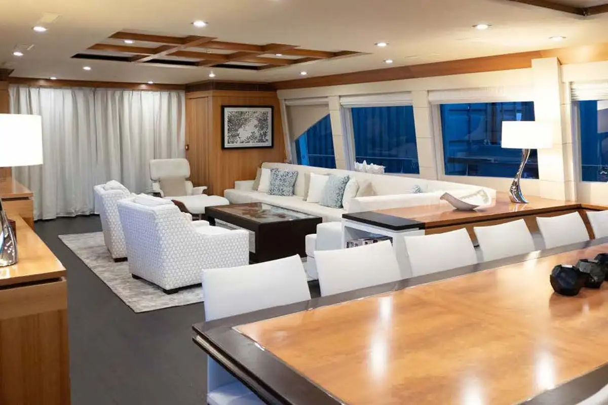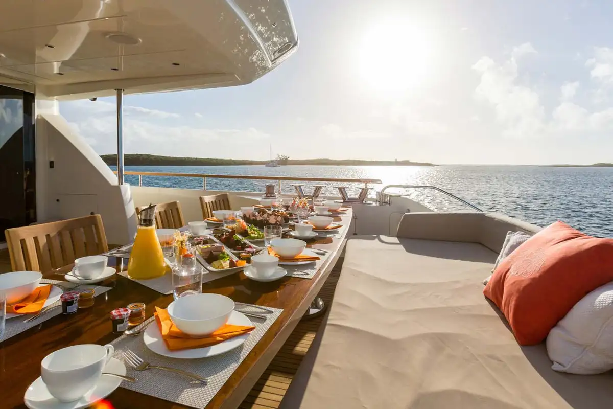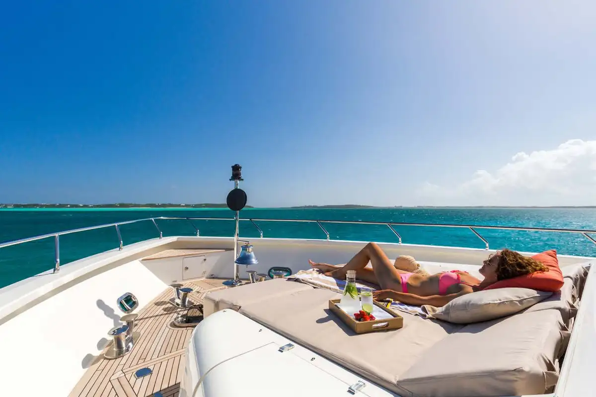 The aft deck offers a very large rectangular dining table with seating for up to ten and a second dining area with hard-top shade and skylight is located on the sun deck above. The perfect area for relaxation or entertaining, the sun deck’s walk up full bar, sunbathing area aft and three oversized chairs are sure to keep guests happy all day long.