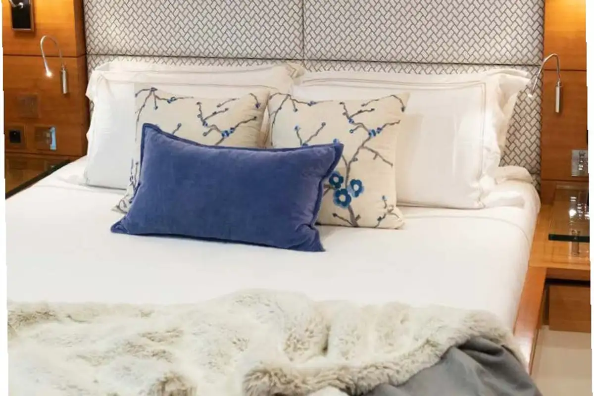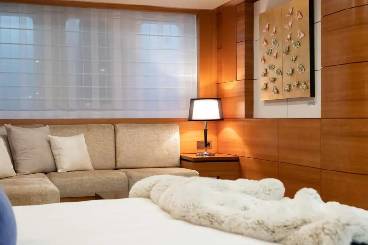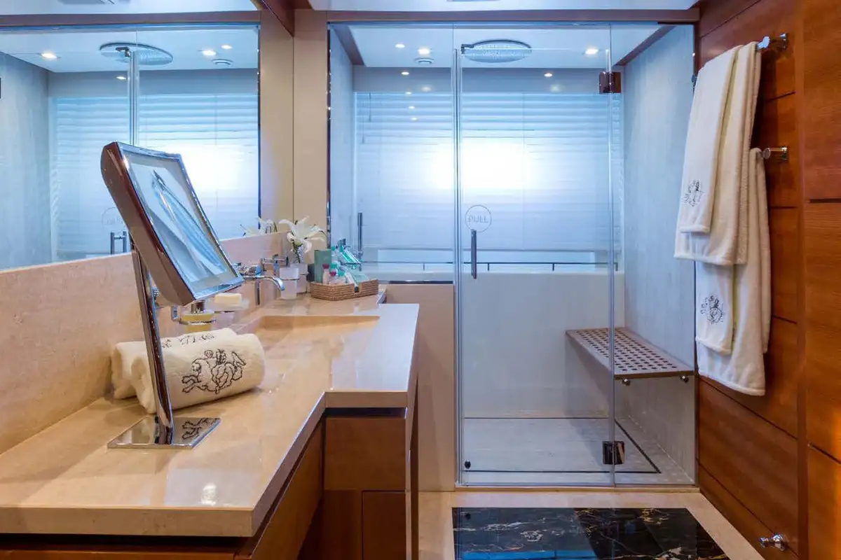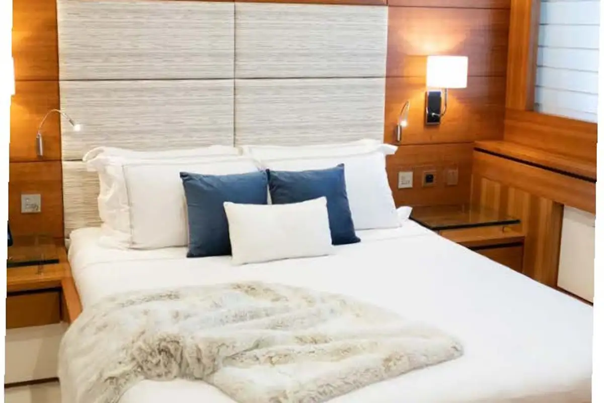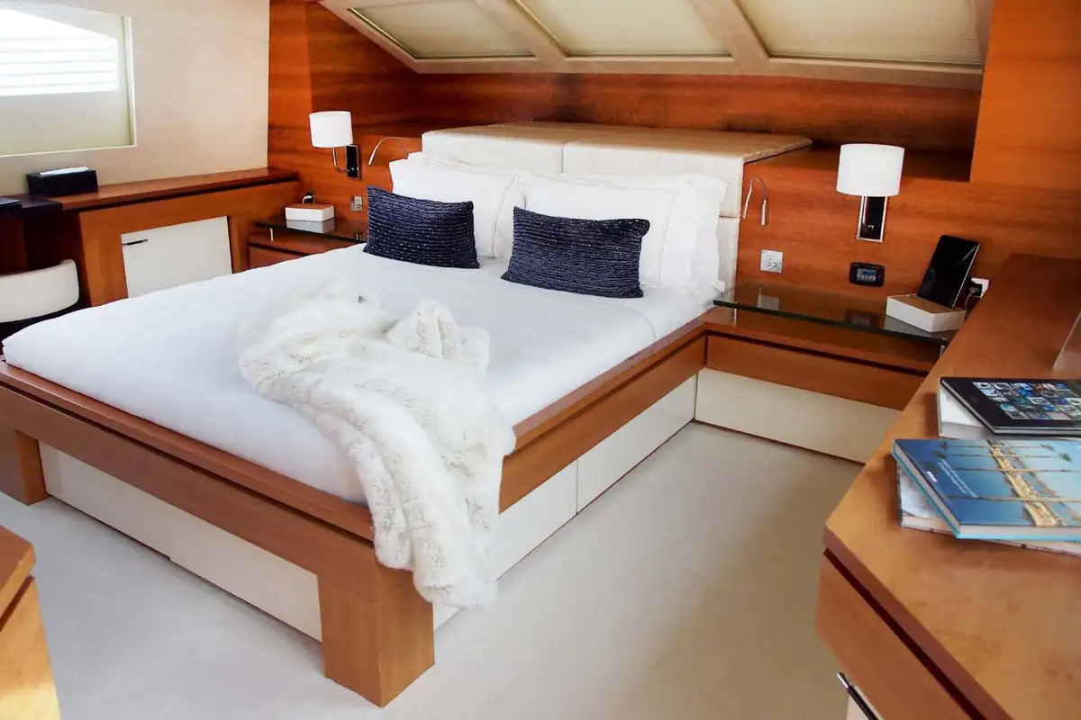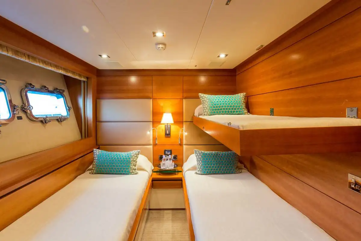 On the lower deck you will find the master suite. Once again, the light and views are superb through two extended windows on either side. The two VIP cabins and one twin cabin with additional pullman bunk for children are located on the main deck and below deck. These four cabins can accommodate up to nine guests in total.