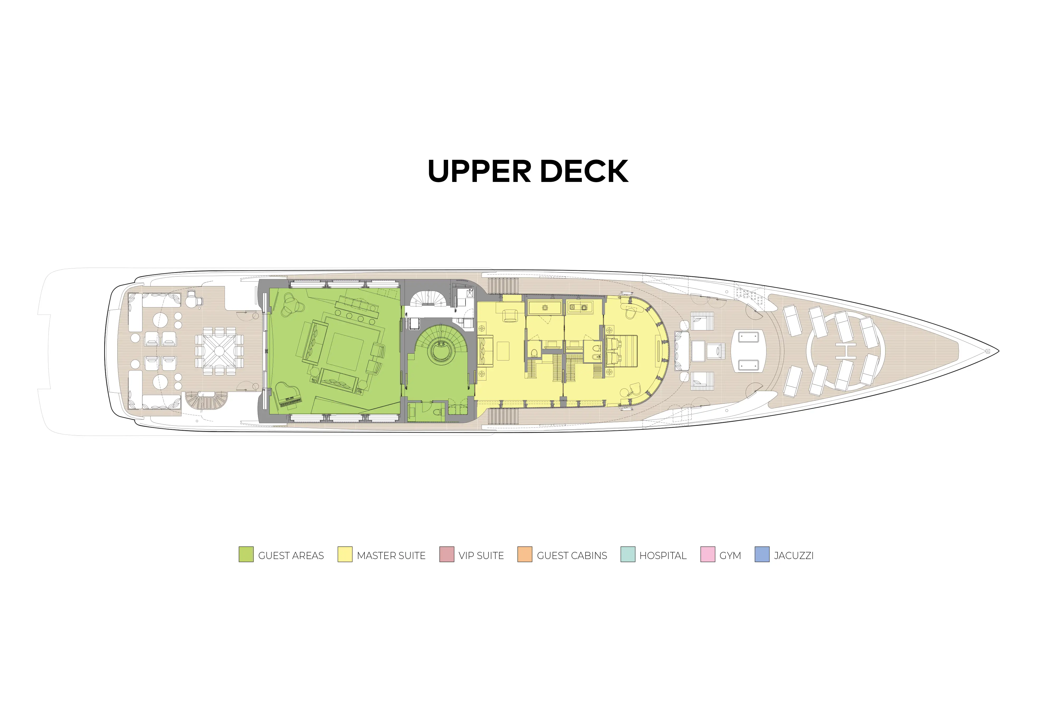 The master cabin is huge – 160sqm – with an office and lounge area, two dressing rooms, two interconnected bathrooms and a spectacular sweep of forward-facing windows with a 180-degree panoramic view. The forward bed looks out over a large private bow terrace with seating and sunpads up front.