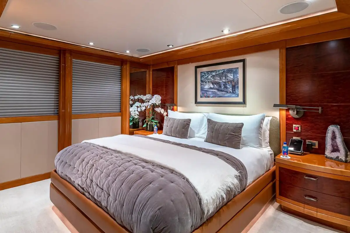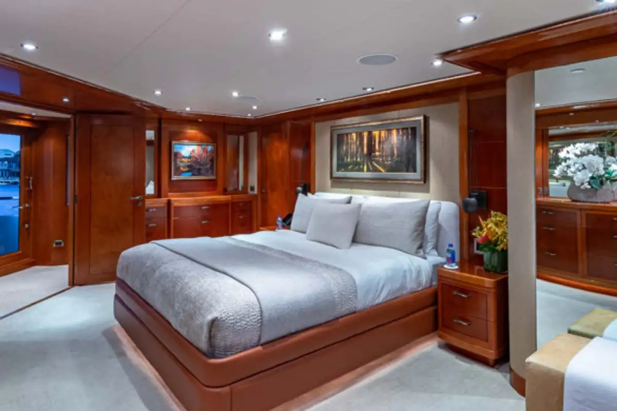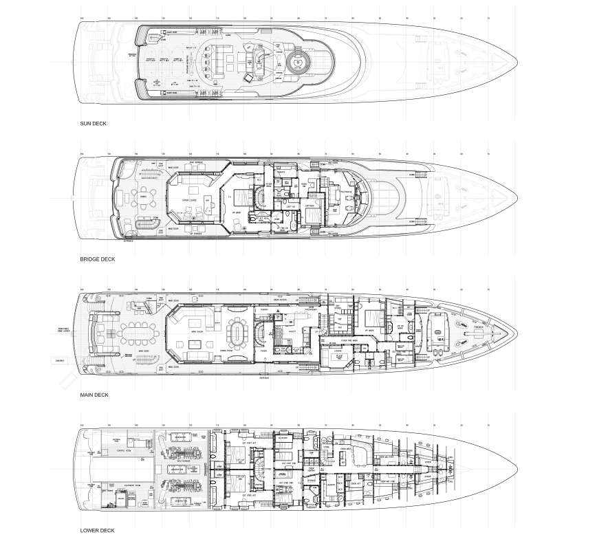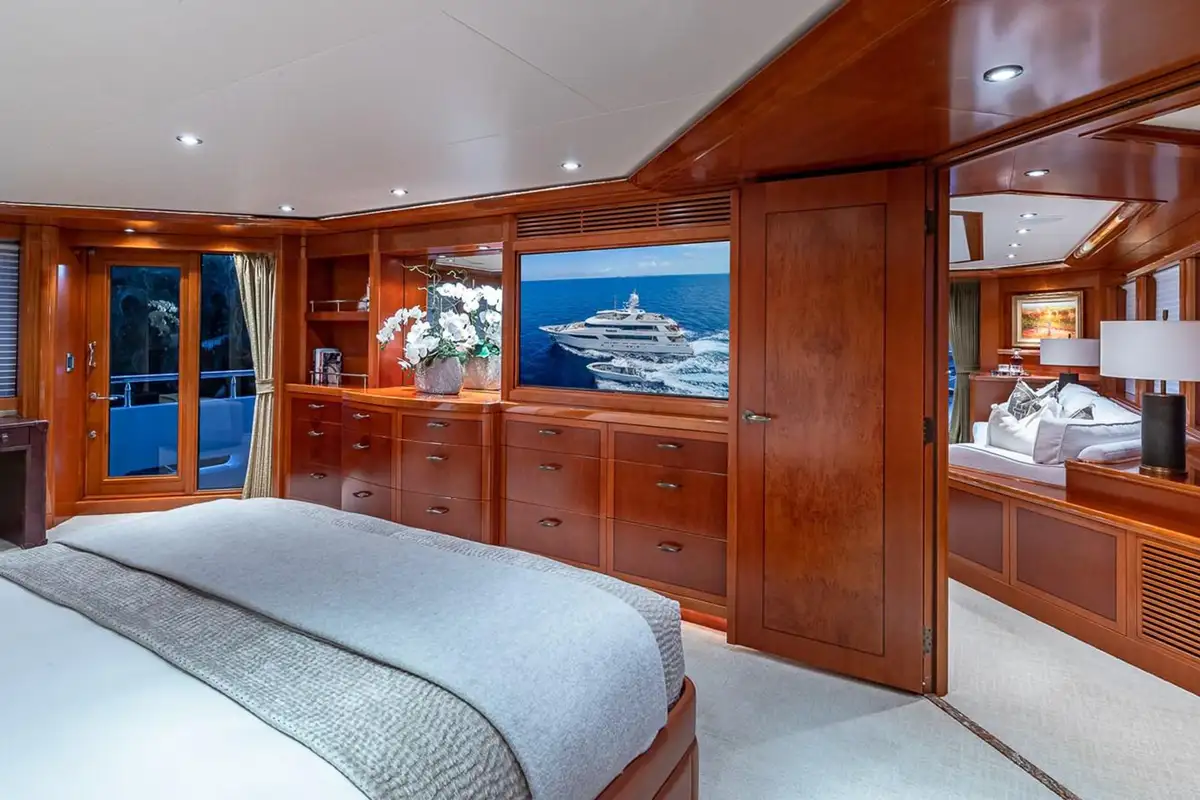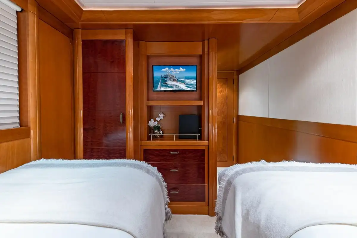 Guest cabins comprise of one double cabin with a large en suite, one twin cabin on the main deck and two double cabins on the lower deck. The bathrooms feature exceptionally crafted marble. The sixth cabin is a double cabin with a single bed plus a pullman for children. While the bridge deck gym is perfectly set up for training with a lowered floor for the treadmill, there is a single bed and a pullman berth for young children, to provide an additional cabin when required. The main deck library can also be converted for use as a massage or spa area with en suite.