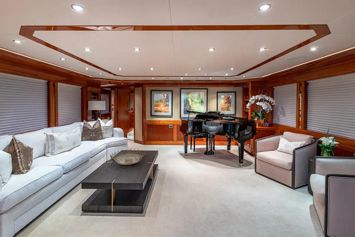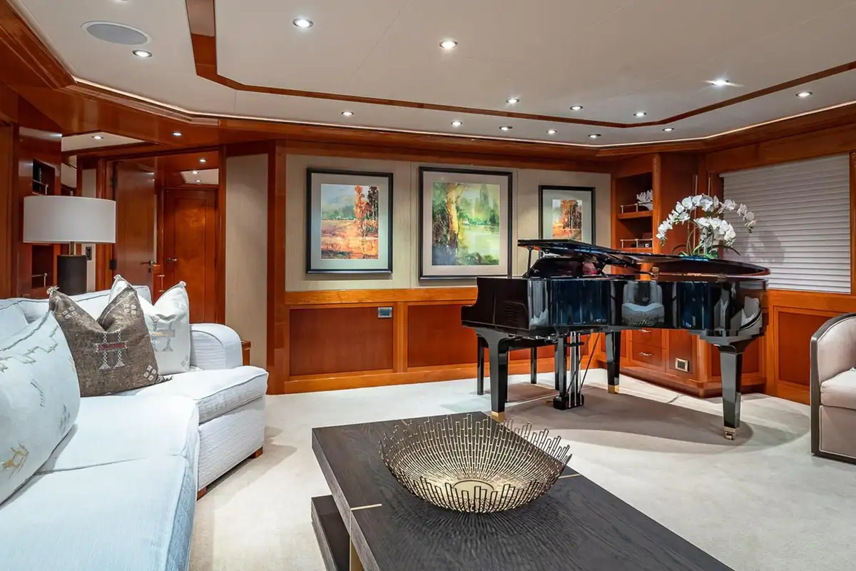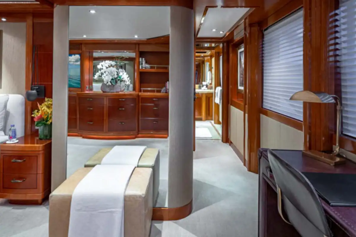 The bridge deck master suite features walk in wardrobe, his and hers bathroom with marble shower and a private balcony with outdoor seating. Aft is the sky lounge with grand piano and fireplace and this can be used as a private lounge or as a more social guest area.