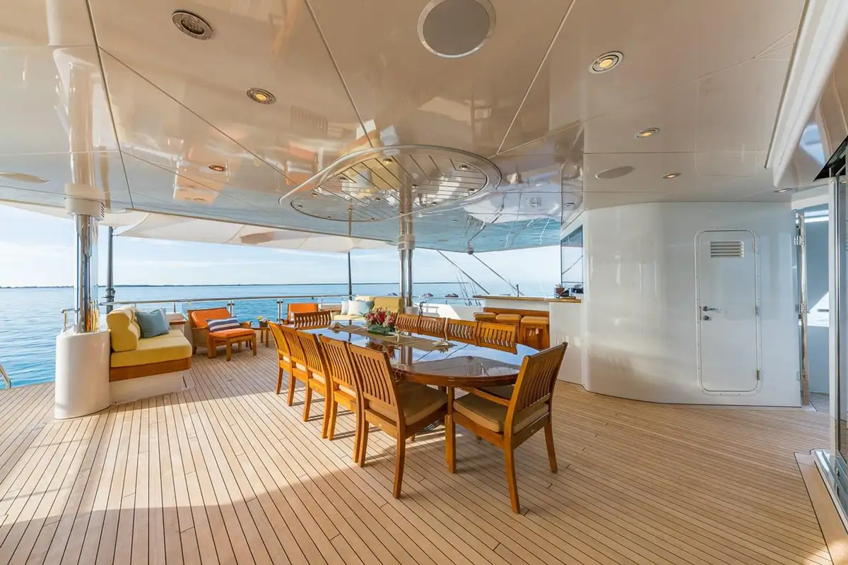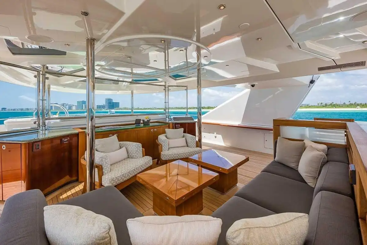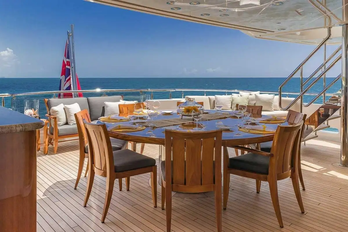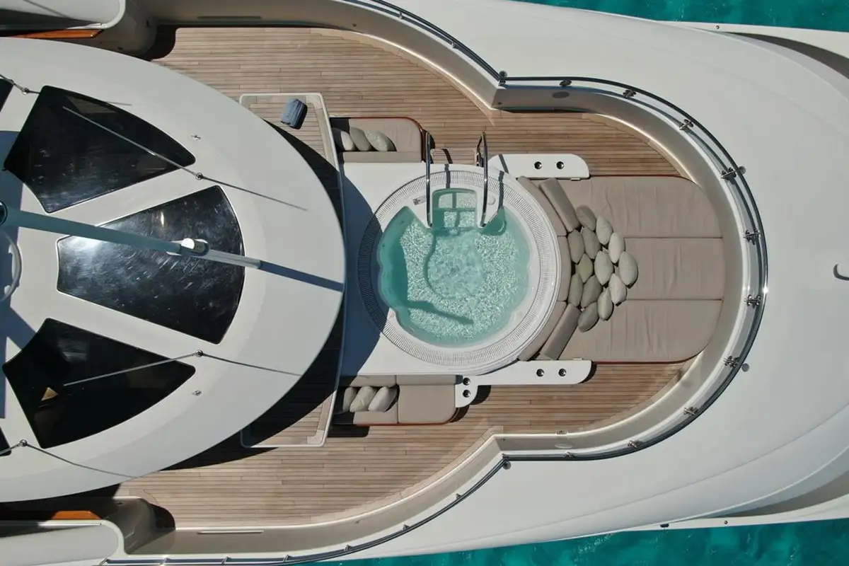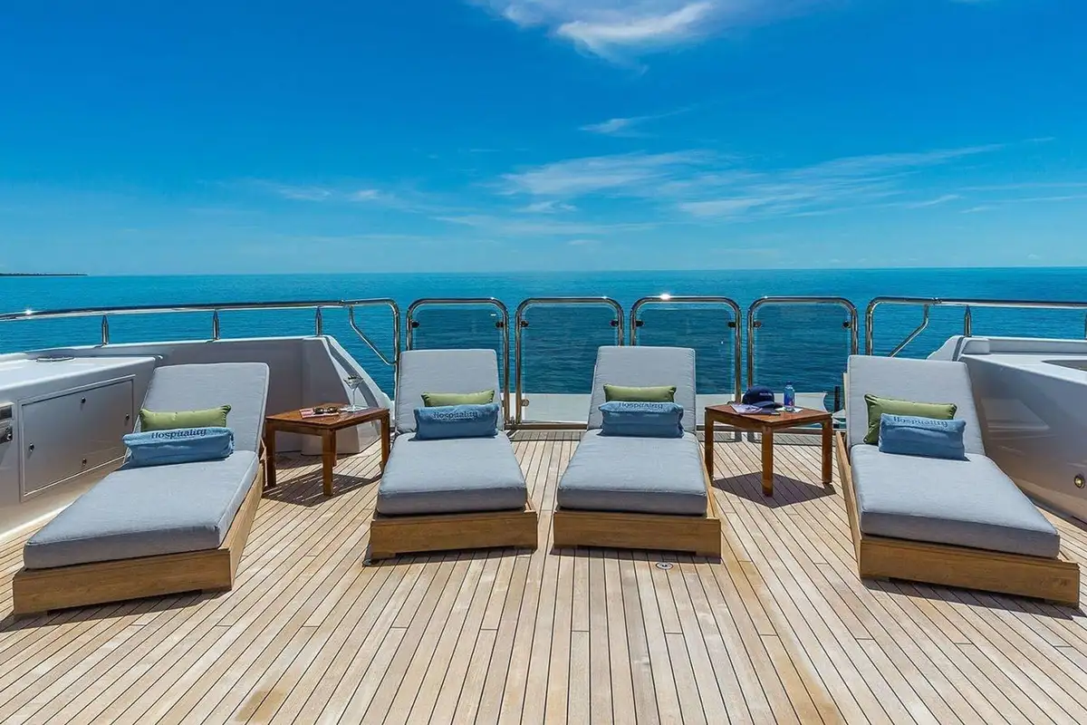 The spacious sun deck is a great social area offering a bar with stools, BBQ, cocktail tables, sun loungers and armchairs for relaxing. Forward is a large jacuzzi with wraparound sun pads for guests to soak up the sun.
