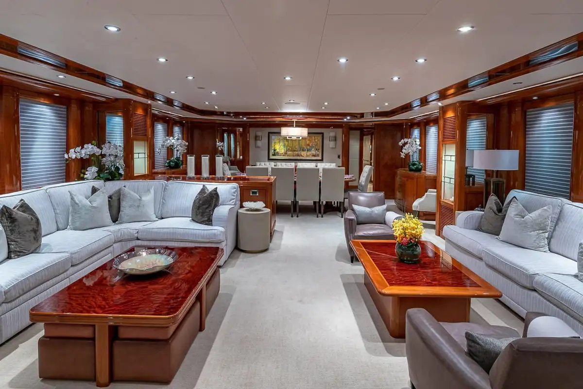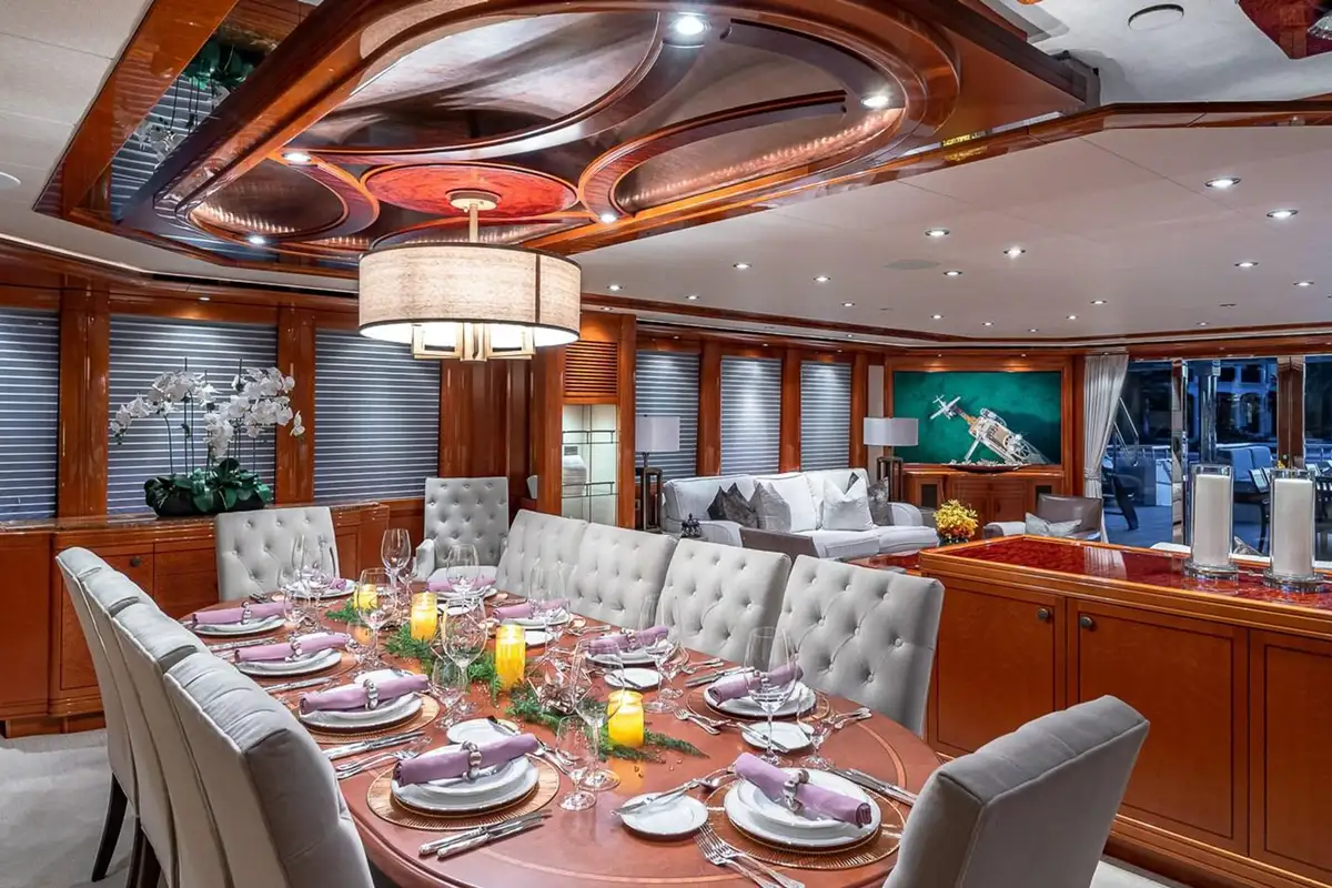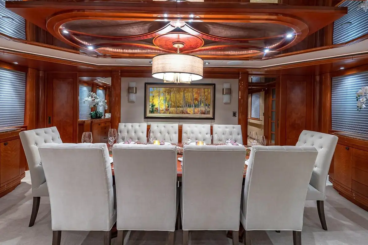 AS YOU WISH’s main deck aft holds a large dining table capable of seating up to 16 guests and a full service bar with stools and TV. Leading through into the main lounge, her Donald Starkey styled interior offers honey-coloured cabinetry. Volume being a plus on this yacht, there is flexible and generous seating with more seating arrangements. Moving forward, the interior dining area can seat 12 guests.