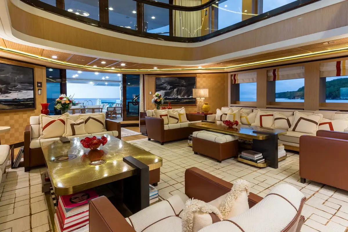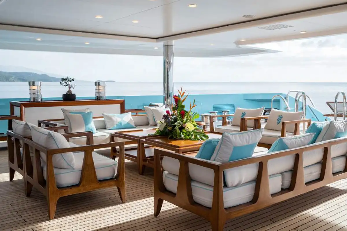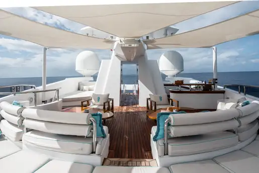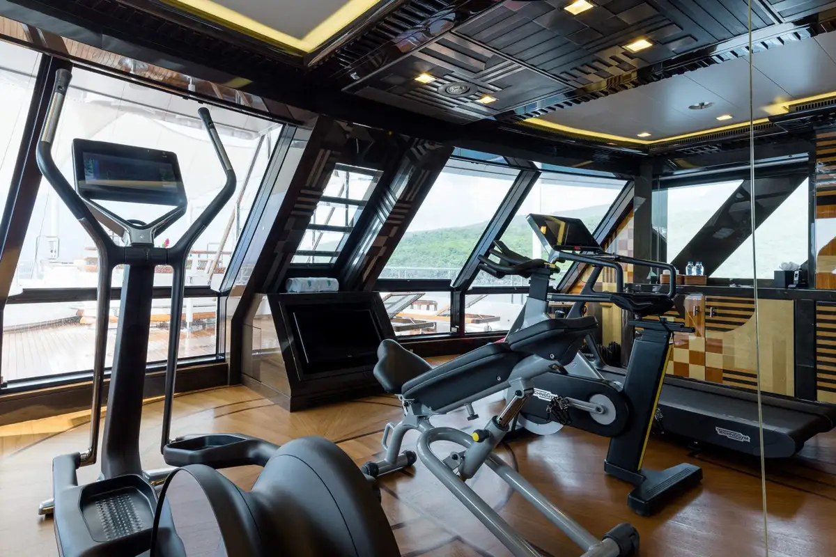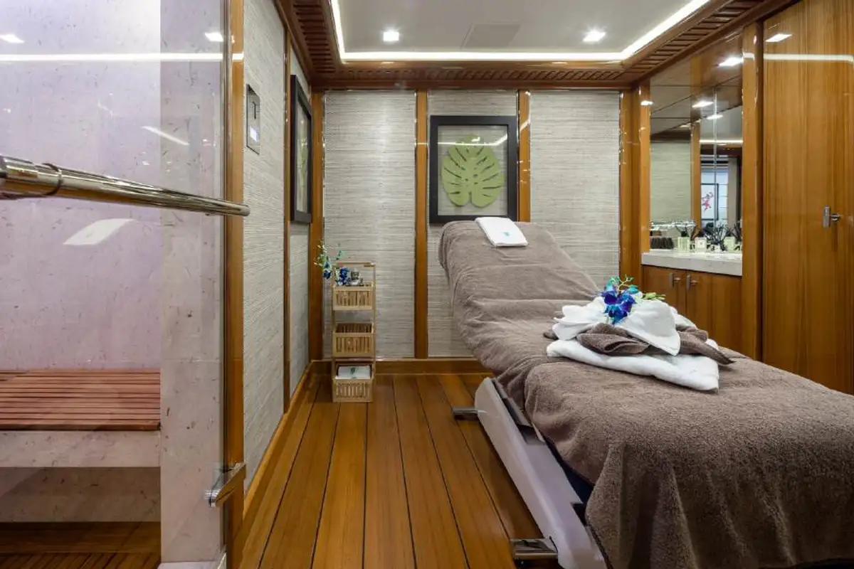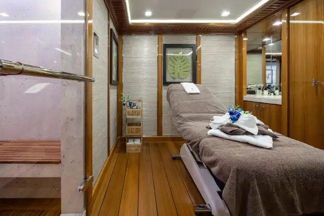 It's difficult to know what impresses most about this yacht as she has so many amazing features. Up on the sun deck there are daybeds and lounge seating, complete with bar and BBQ so you can toast the sunset and a light dinner. Steps lead down to the bridge deck with a jacuzzi surrounded by sun pads and a bar that is both swim up and walk up. Also on the bridge deck are the spa with steam and massage rooms and a fully equipped gym for a day full of wellness.