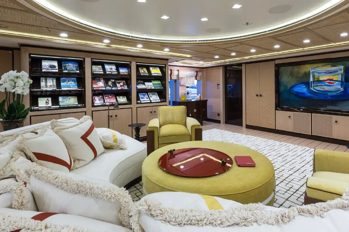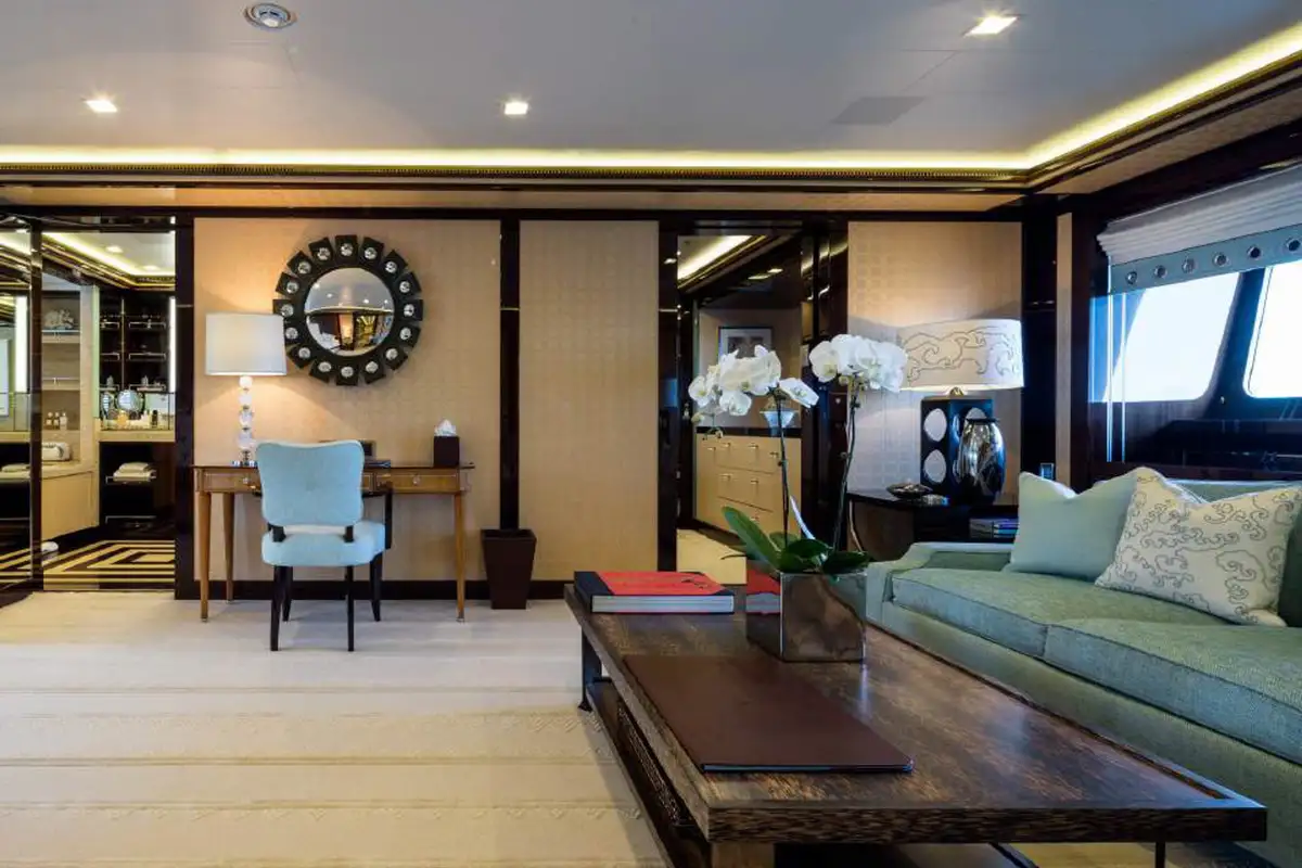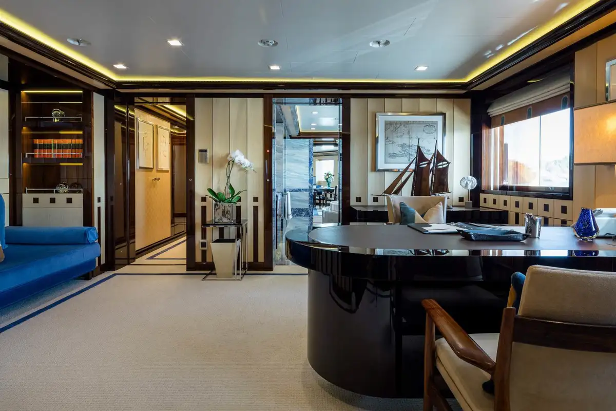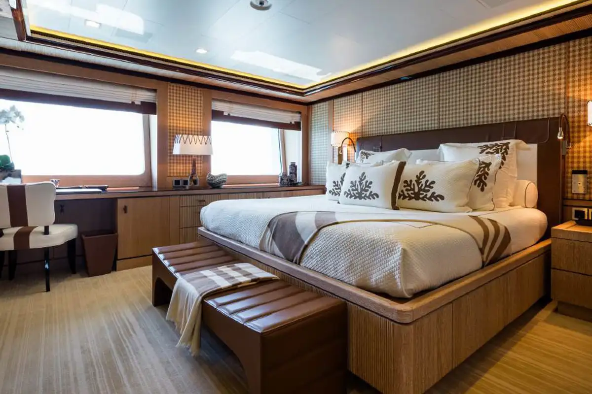 It's difficult to know what impresses most about this yacht as she has so many amazing features. Up on the sun deck there are daybeds and lounge seating, complete with bar and BBQ so you can toast the sunset and a light dinner. Steps lead down to the bridge deck with a jacuzzi surrounded by sun pads and a bar that is both swim up and walk up. Also on the bridge deck are the spa with steam and massage rooms and a fully equipped gym for a day full of wellness.