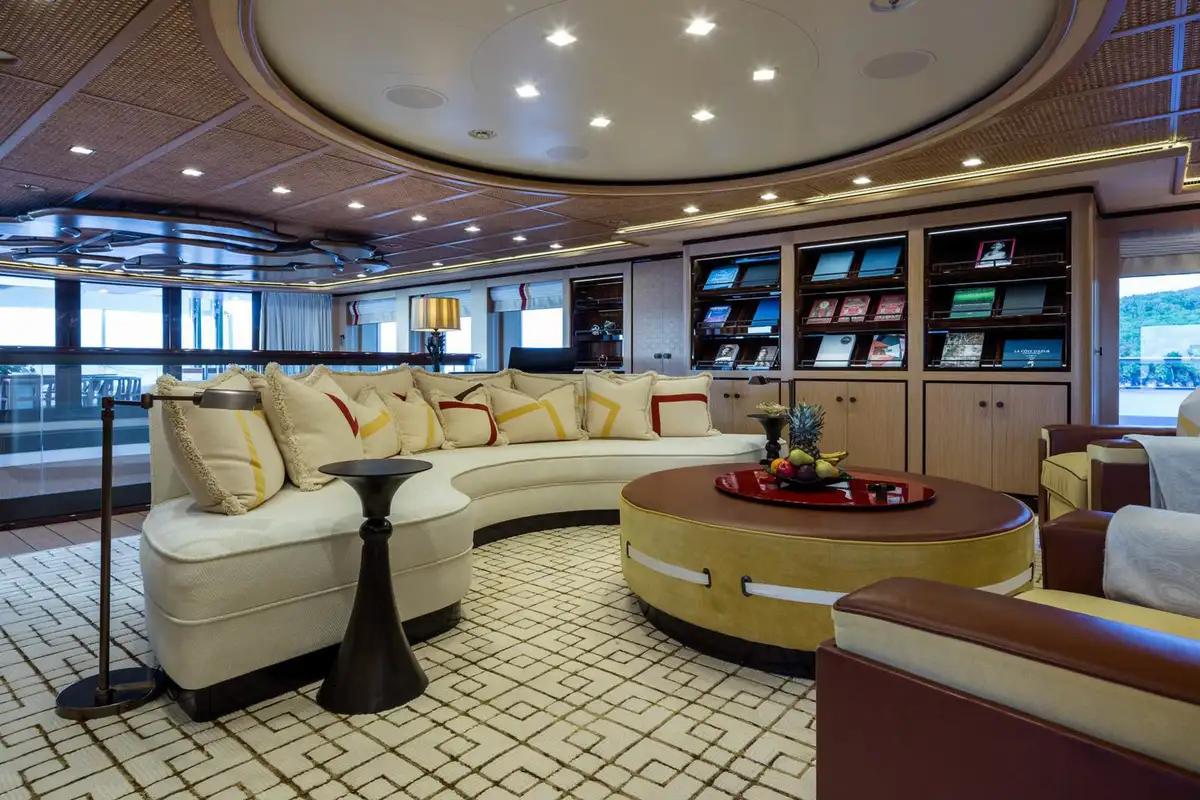 Below is the private master deck with a private terrace forward accessible from the bedroom, with skylight overhead, and overlooked by no-one. Aft there is a library room, then the spectacular gallery of the double height saloon below. Slide open the doors and there's a spacious terrace with al fresco dining and lounge seating aft, overlooking the infinity pool.