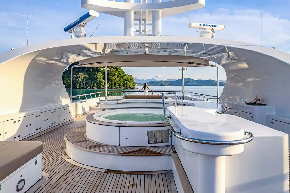Her sun deck has a generous sun pad lounging area and a jacuzzi with wrap-around bar forward, an extensive array of gym equipment in the shade of the antenna arch awning and a large area aft for sun bathing, which presents an al fresco dining option.