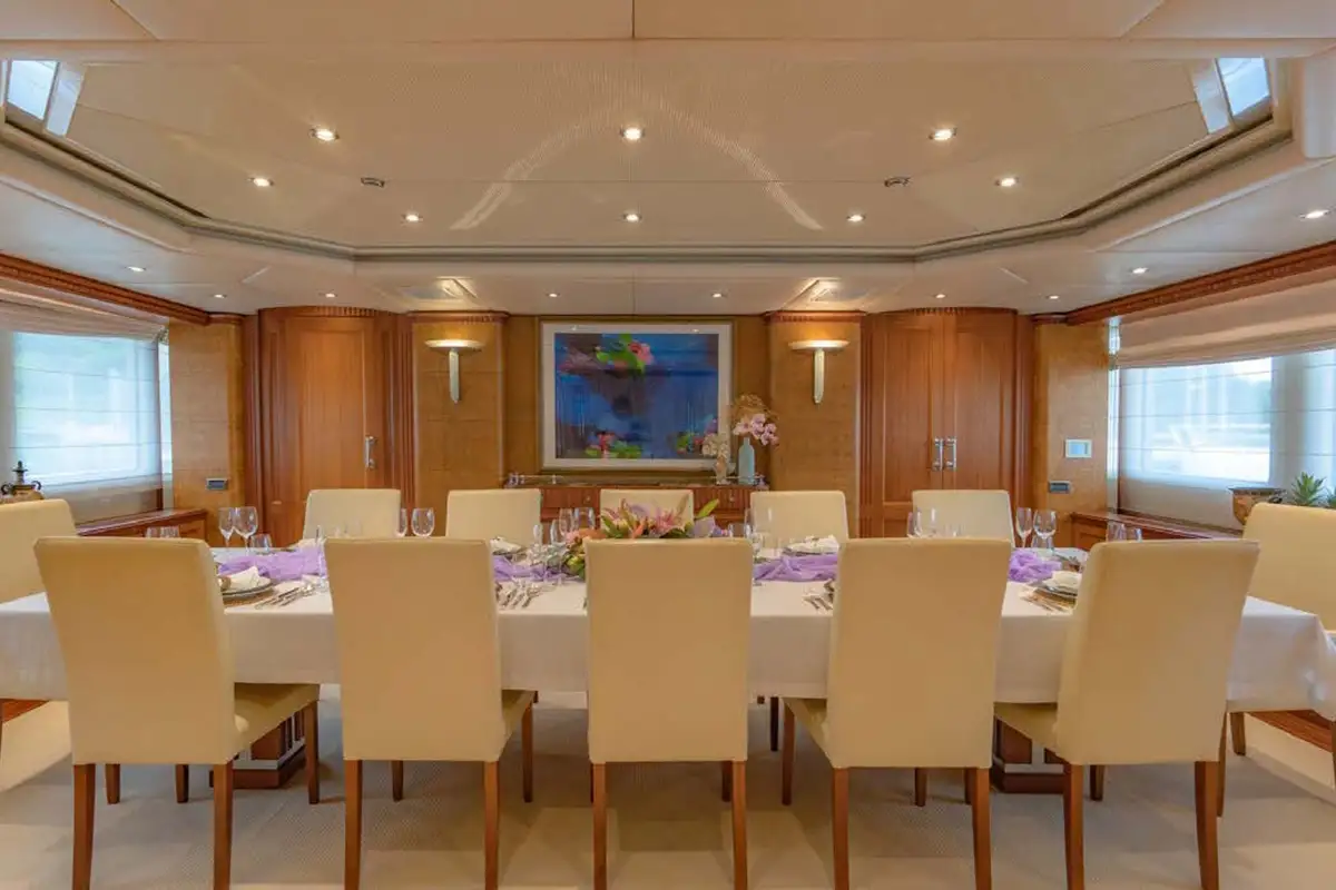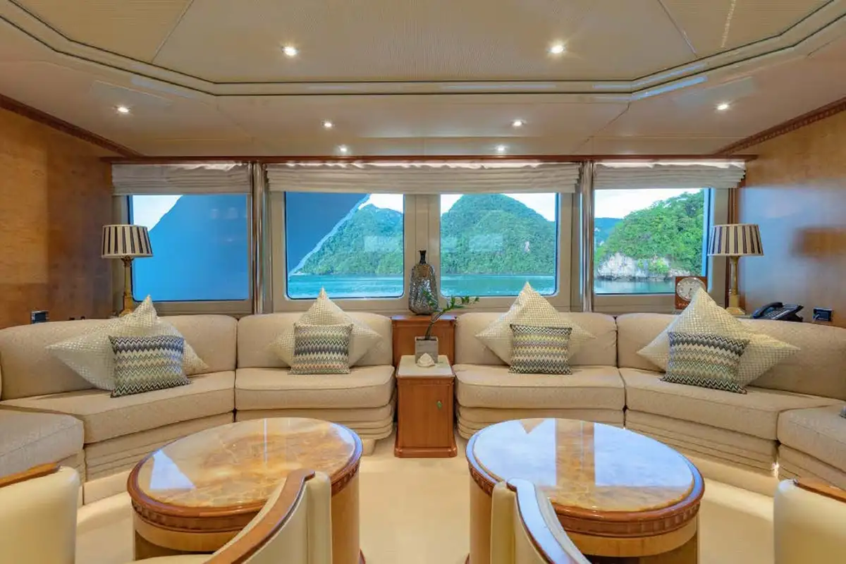 She accommodates up to 12 guests in six cabins. The full beam master cabin, forward on the main deck, has his and hers bathrooms, a walk-in wardrobe, sofa, vanity table and a separate office area. There is an equally large VIP cabin on the lower deck with his and hers bathrooms, a walk-in wardrobe and a lounge. Accommodation is completed by a double cabin on the main deck, two twin cabins on the lower deck, each with a pullman berth, and a single cabin on the upper deck. Guests are looked after by 11 crew and zero speed stabilisers ensure comfort at anchor.