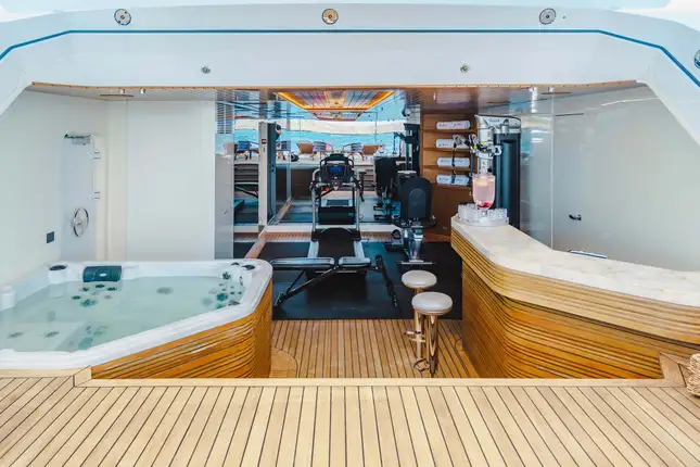 Enjoy a delicious lunch on the upper deck aft, shaded from the midday heat while you take in superb views of the surroundings from your elevated position. Then ascend to the sun deck where you can lounge in style on the selection of sun loungers and sun pads, or enjoy a refreshing dip in the waterfall jacuzzi while chatting with friends sitting at the nearby bar.