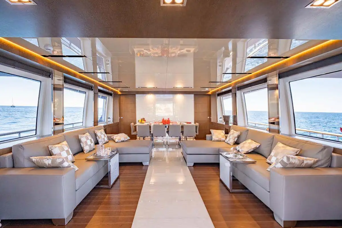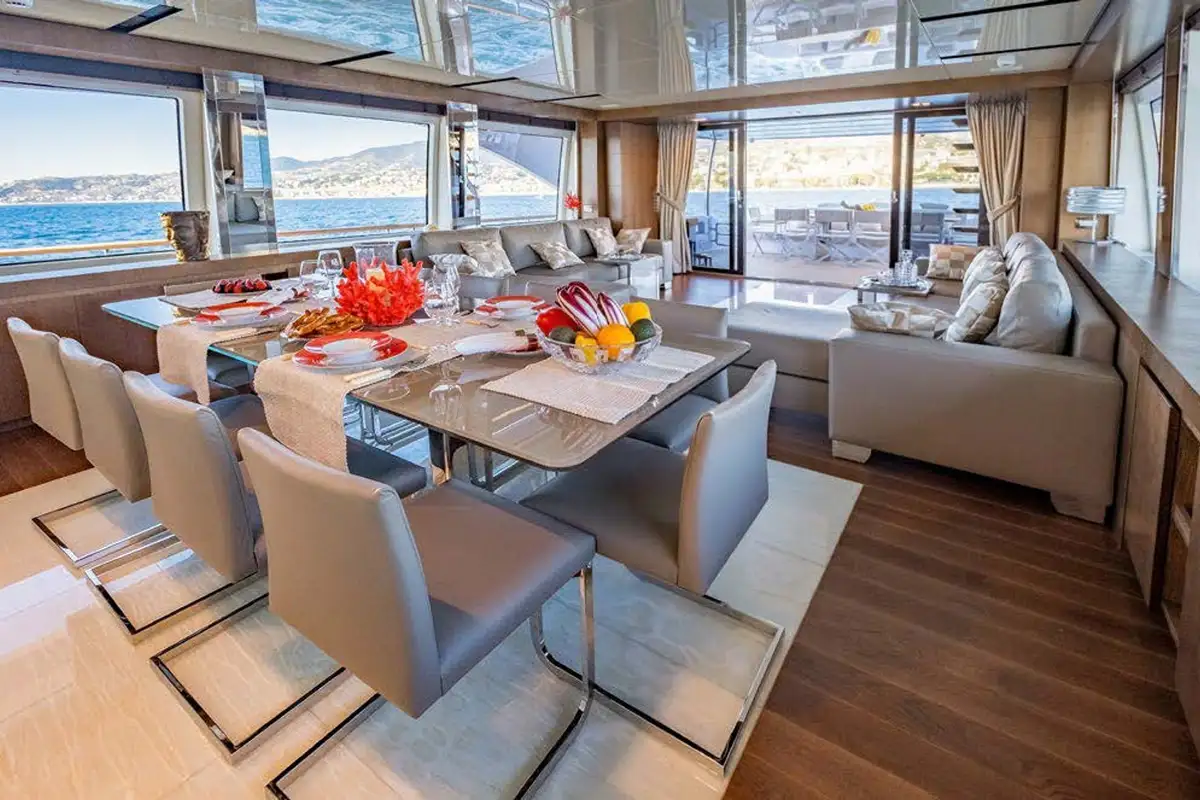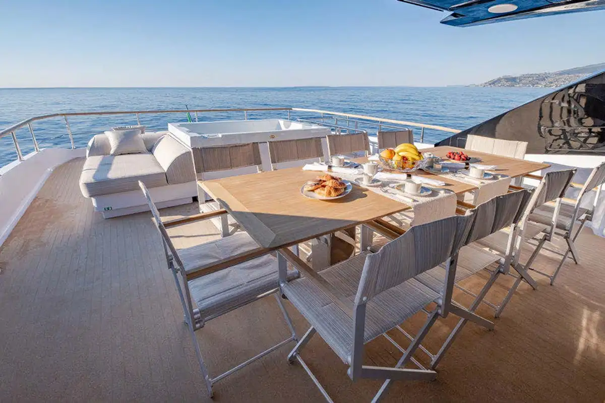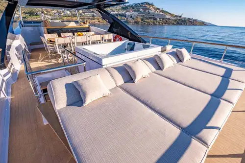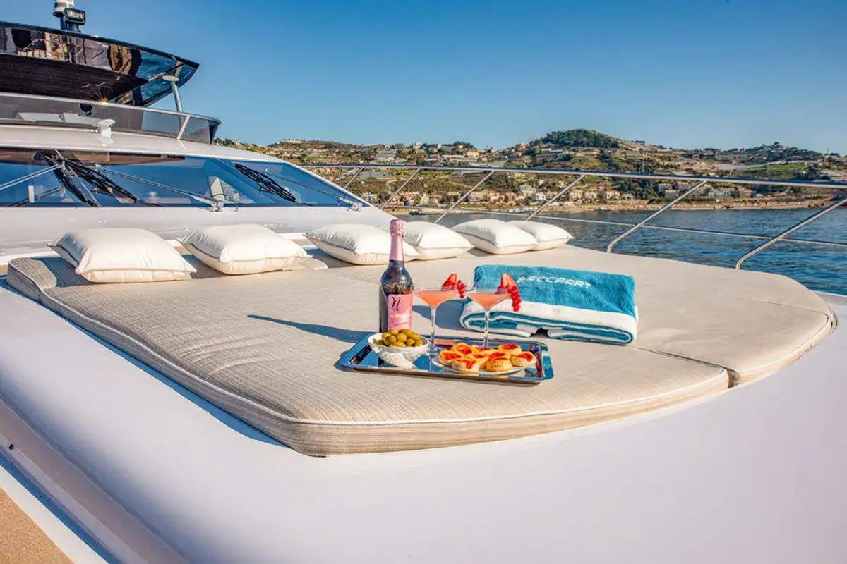 Every detail on board BACCARAT is crafted with elegance and ease in mind. Her thoughtfully designed outdoor spaces invite relaxation, whether you’re unwinding in the jacuzzi, soaking up the sun on the foredeck loungers, or enjoying a slow lunch on the aft deck. Inside, expect chic interiors, modern amenities, and a light, open feel throughout.