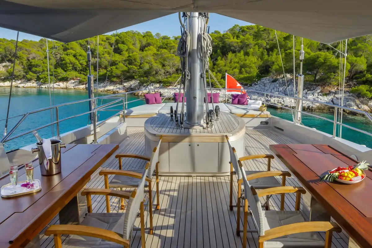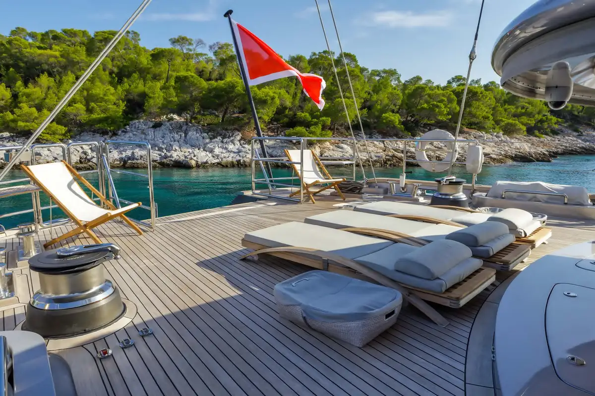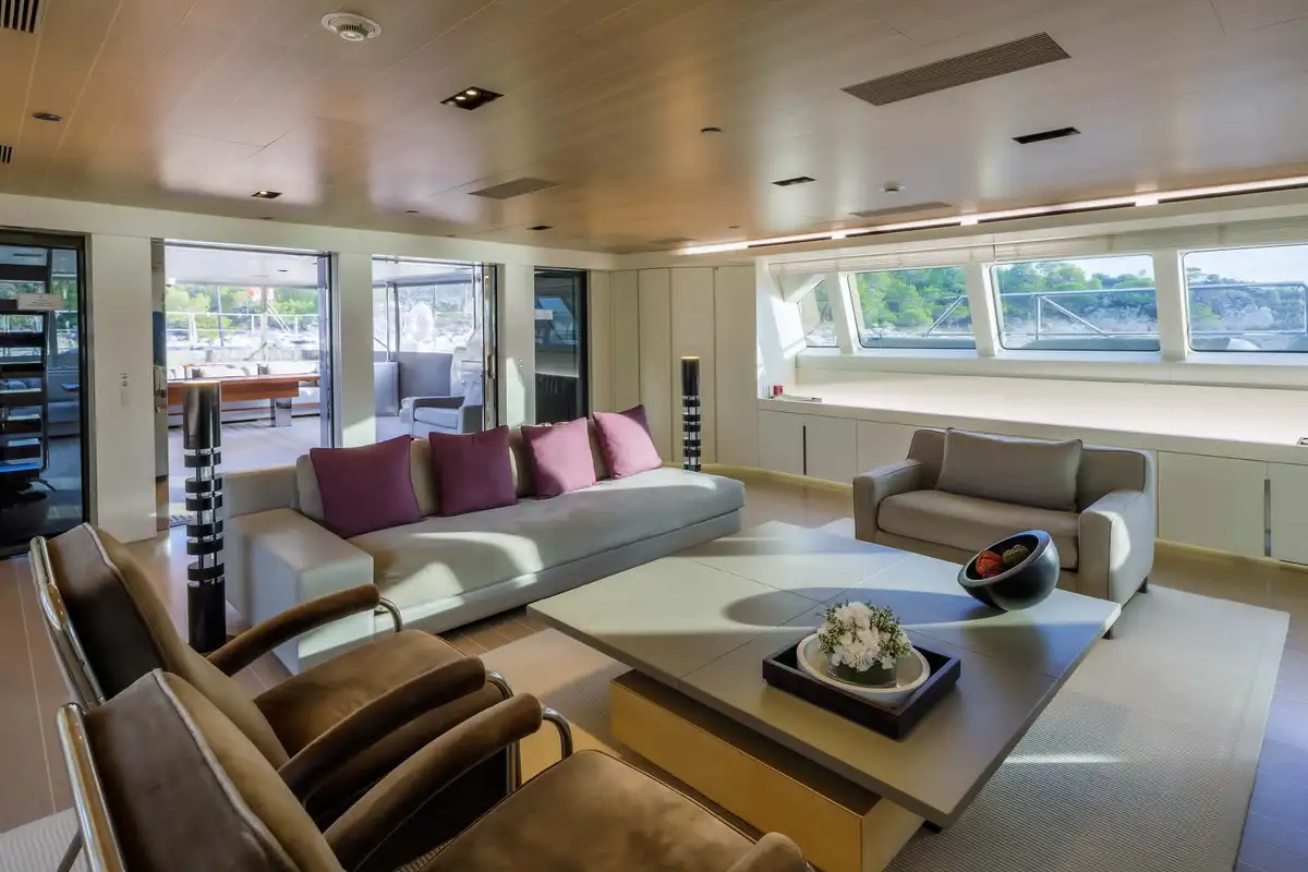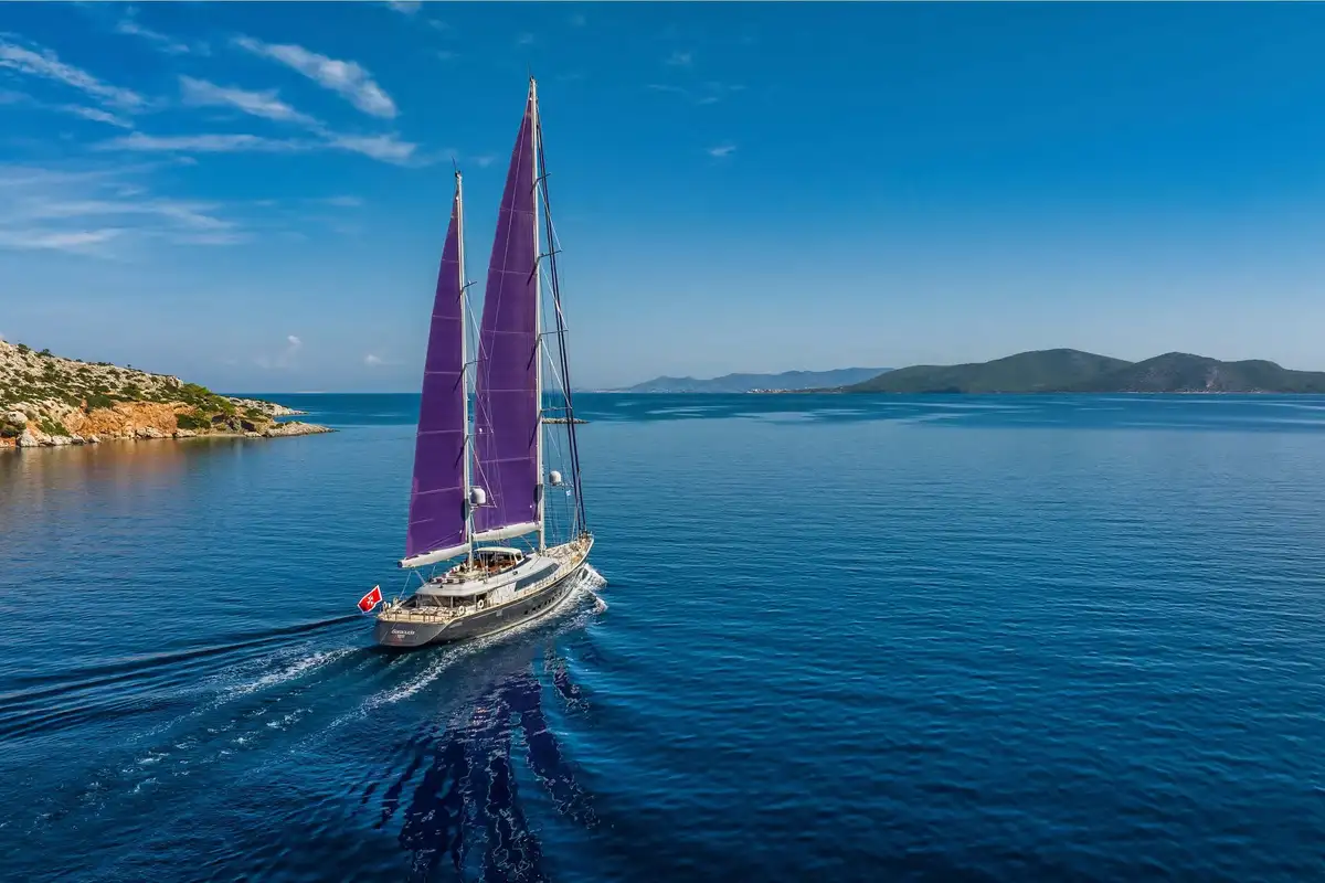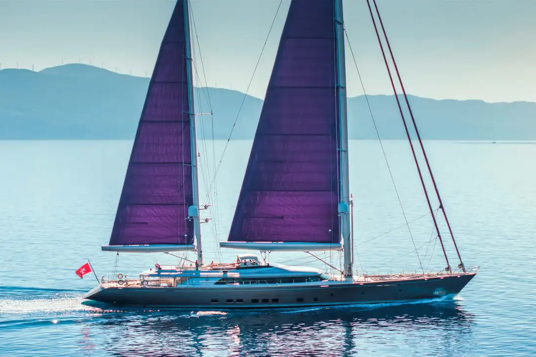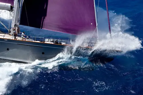 With her enormous, flaming purple sails fully hoisted and unfurled, BARACUDA VALLETTA has an exhilarating turn of speed and a powerful presence on the water. The impressively engineered integrated sailing system that controls her immense sail power is controlled with great precision, at the touch of a few buttons, from the twin helm stations on the elevated flybridge. To sail a boat like this, fully powered up and sending sheets of spray across the foredeck, is a unique sensation.