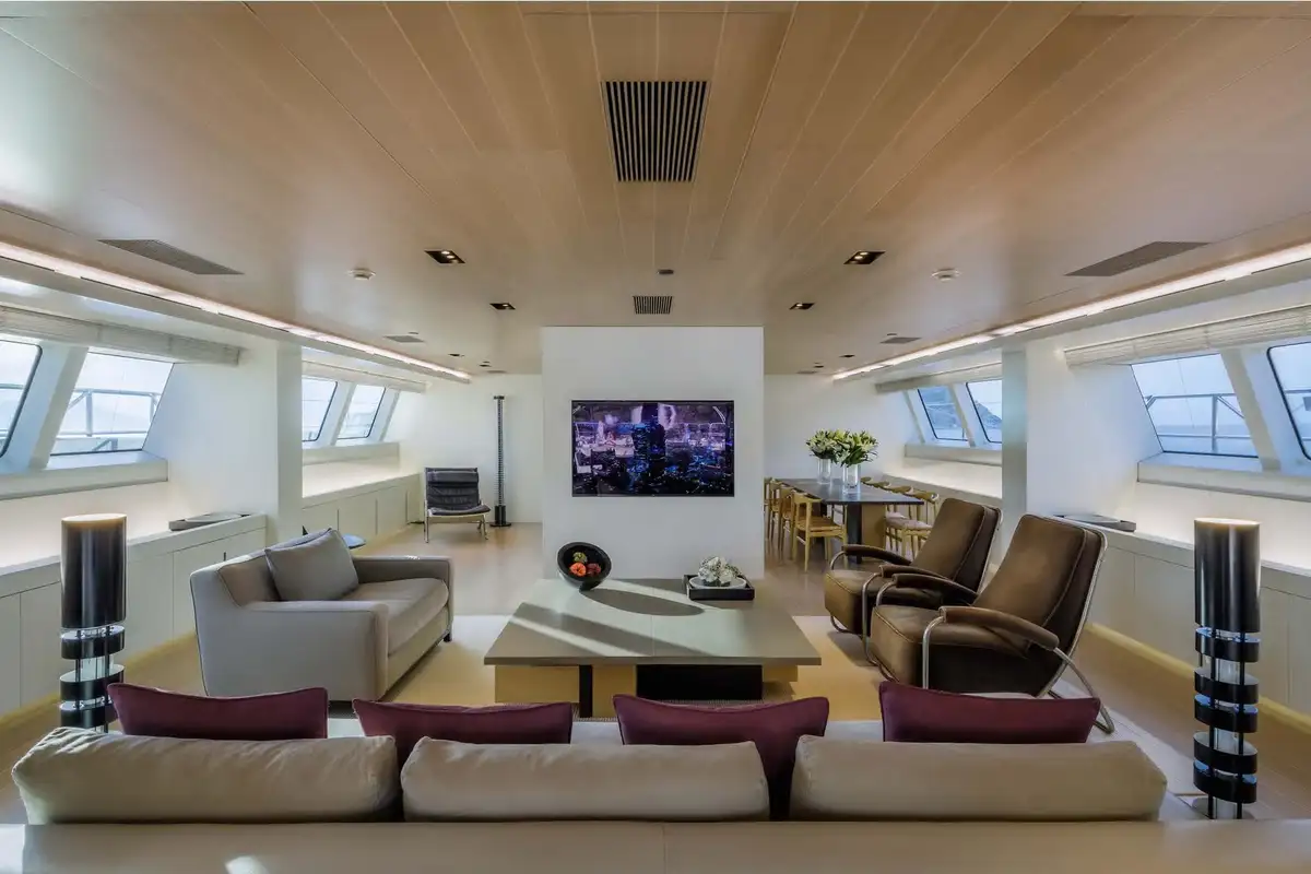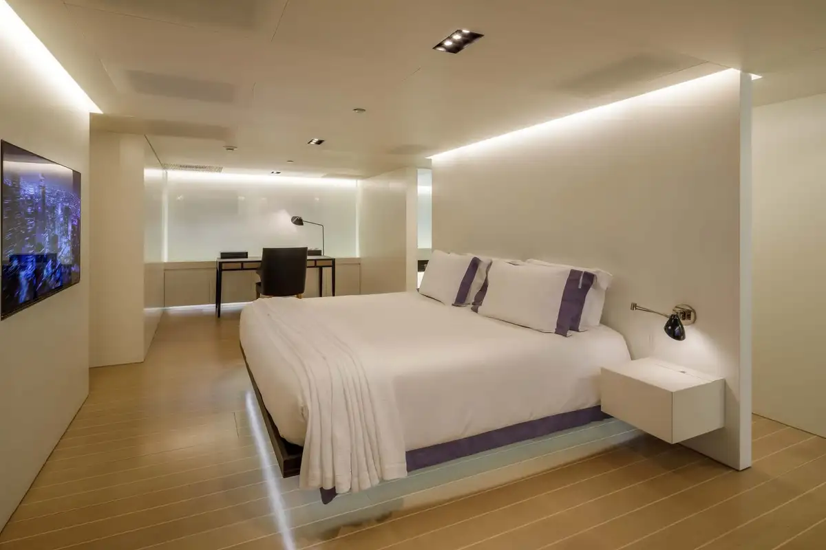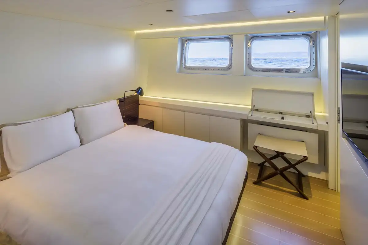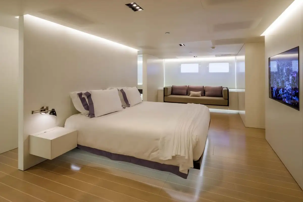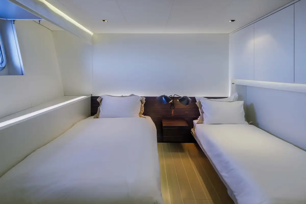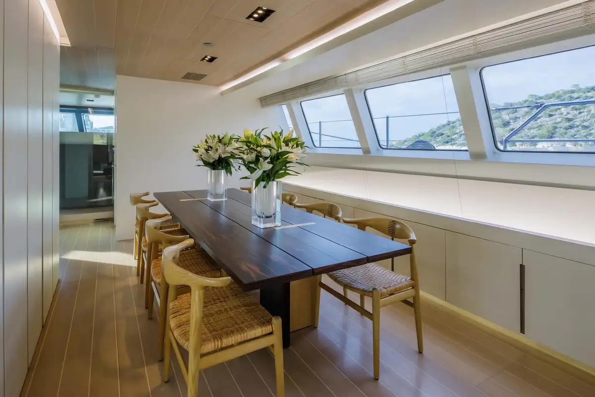 Every object, fitting and fixture within the guest accommodation has been carefully considered and curated, to stunning effect. But visual impact aside, this is also a remarkably warm, welcoming and comfortable yacht. Her extended windows provide ample natural lighting and uninterrupted panoramic views of the seascape. The master suite is a full-beam cabin with a real sense of space, plus its own private lounge and office areas.