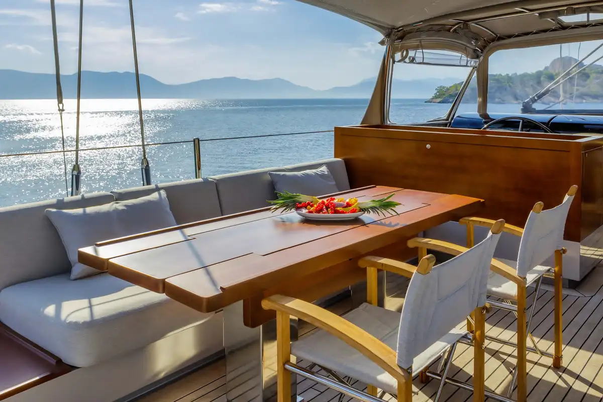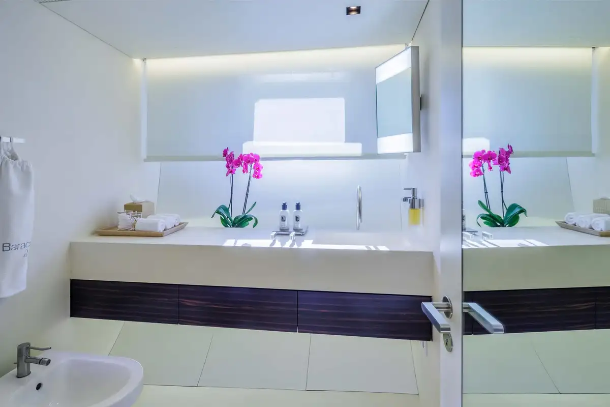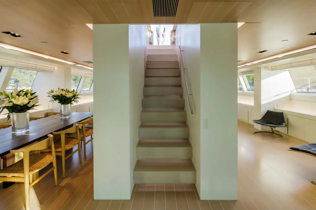 Her exceptionally spacious interior – which adds up to 410 gross tons – is a unique, original masterpiece of modern minimalist design by John Pawson, whose other notable projects include the brand new Design Museum in London. Avoiding the conventional practice of dividing a sailing yacht’s main social area with partition walls, BARACUDA VALLETTA has a spectacular open plan main deck saloon that flows almost seamlessly into her sunken aft cockpit, creating a 22-metre long inside-outside living space.