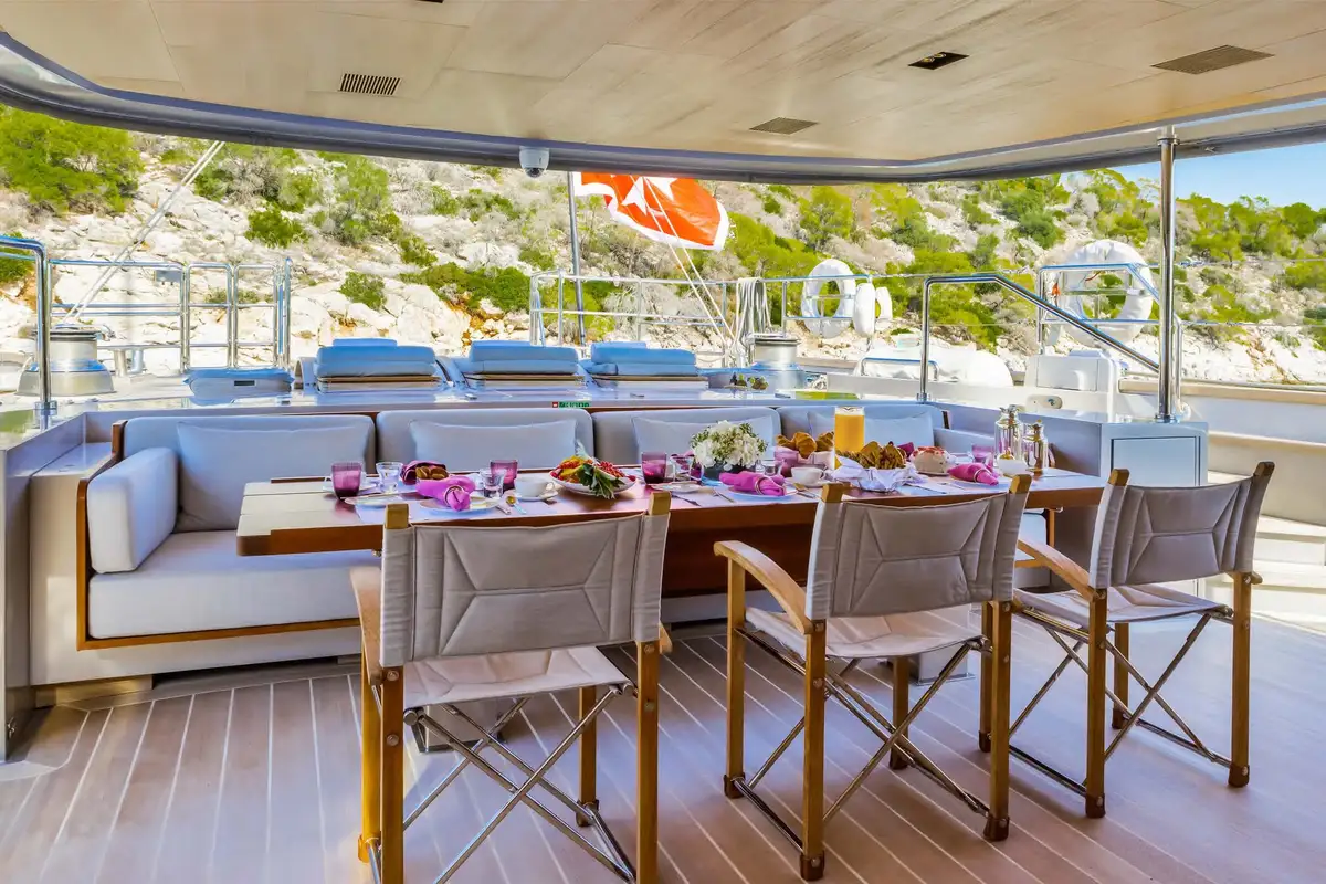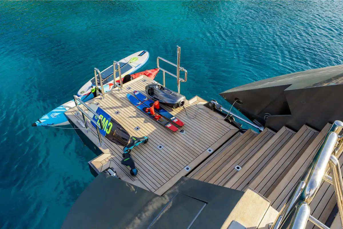 Her lifting keel opens up a huge choice of anchorages. Wherever you choose to take her, when the anchor goes down there’s a vast amount of deck space to enjoy, on several levels. The sundeck has dining, lounging and sunbathing areas with commanding views. The aft deck becomes another large open-air space with steps leading down to a big hydraulic bathing platform where her fleet of boats and toys awaits. From wakeboards and waterskis to canoes, paddleboards and a SeaBob, there’s plenty of fun to be had.