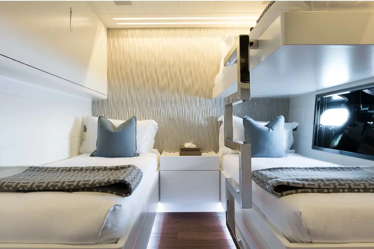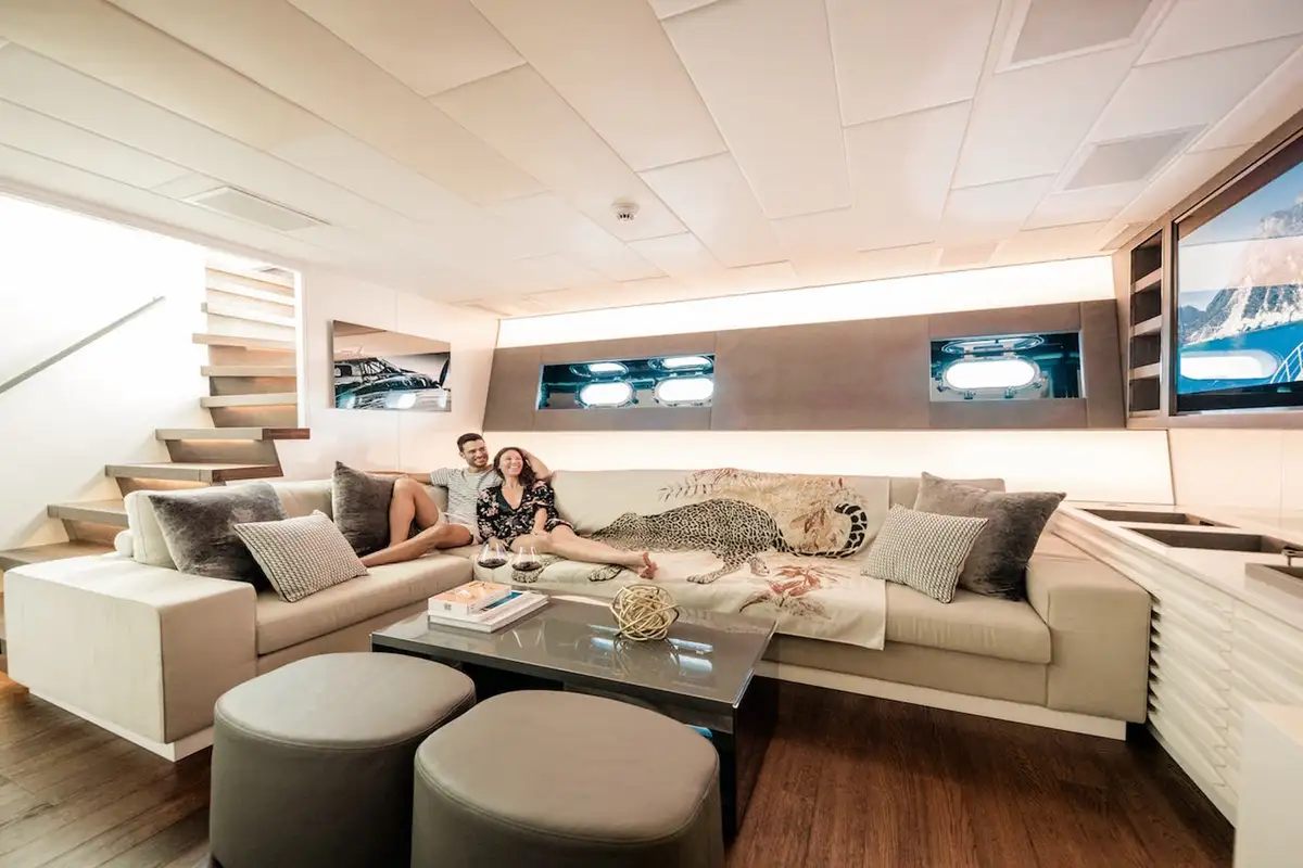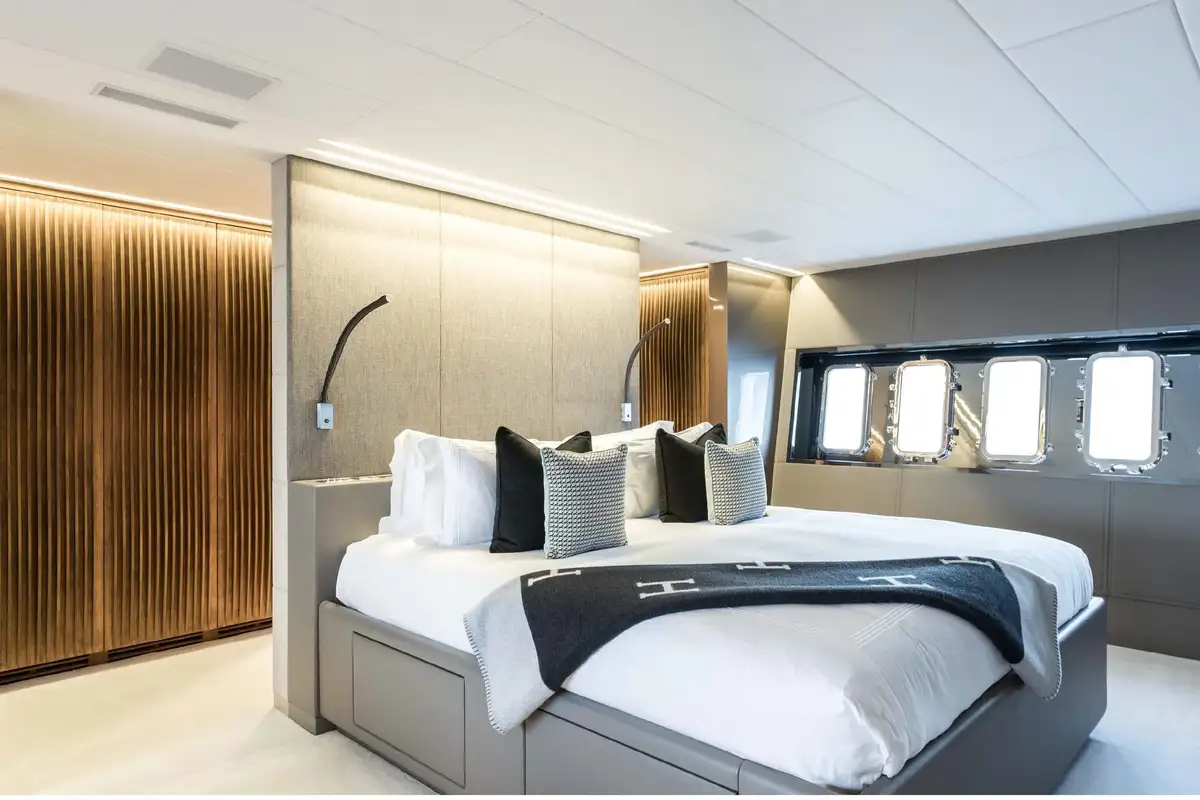 On the lower deck, sink into the inner sanctuary of the full-beam master cabin with its original artworks and high gloss wood veneers. Each of the four guest cabins provide warmth, ambience and solace for the perfect charter experience.