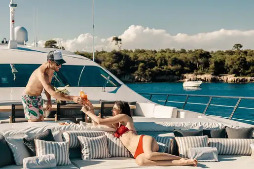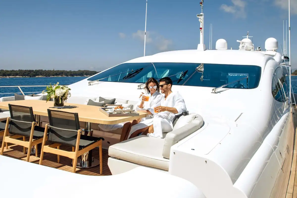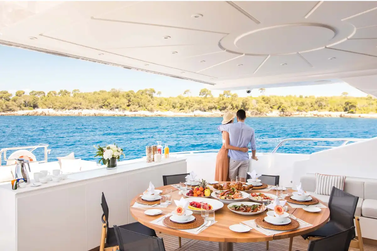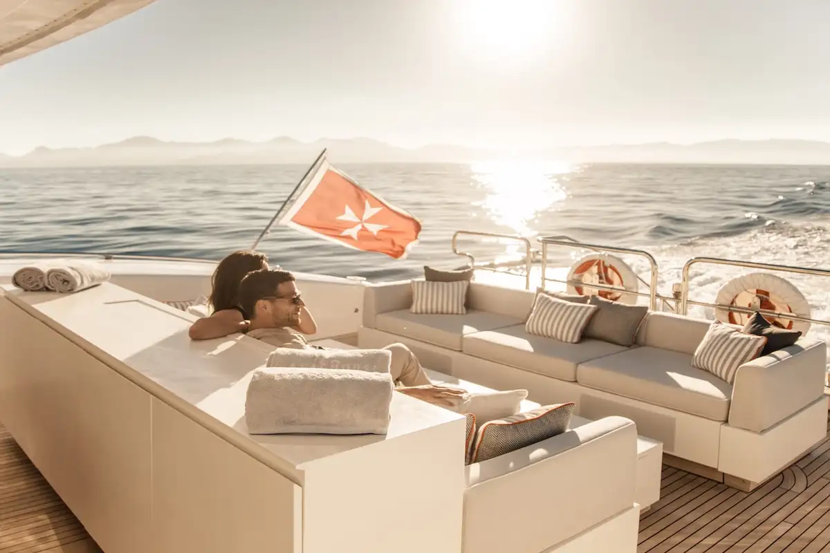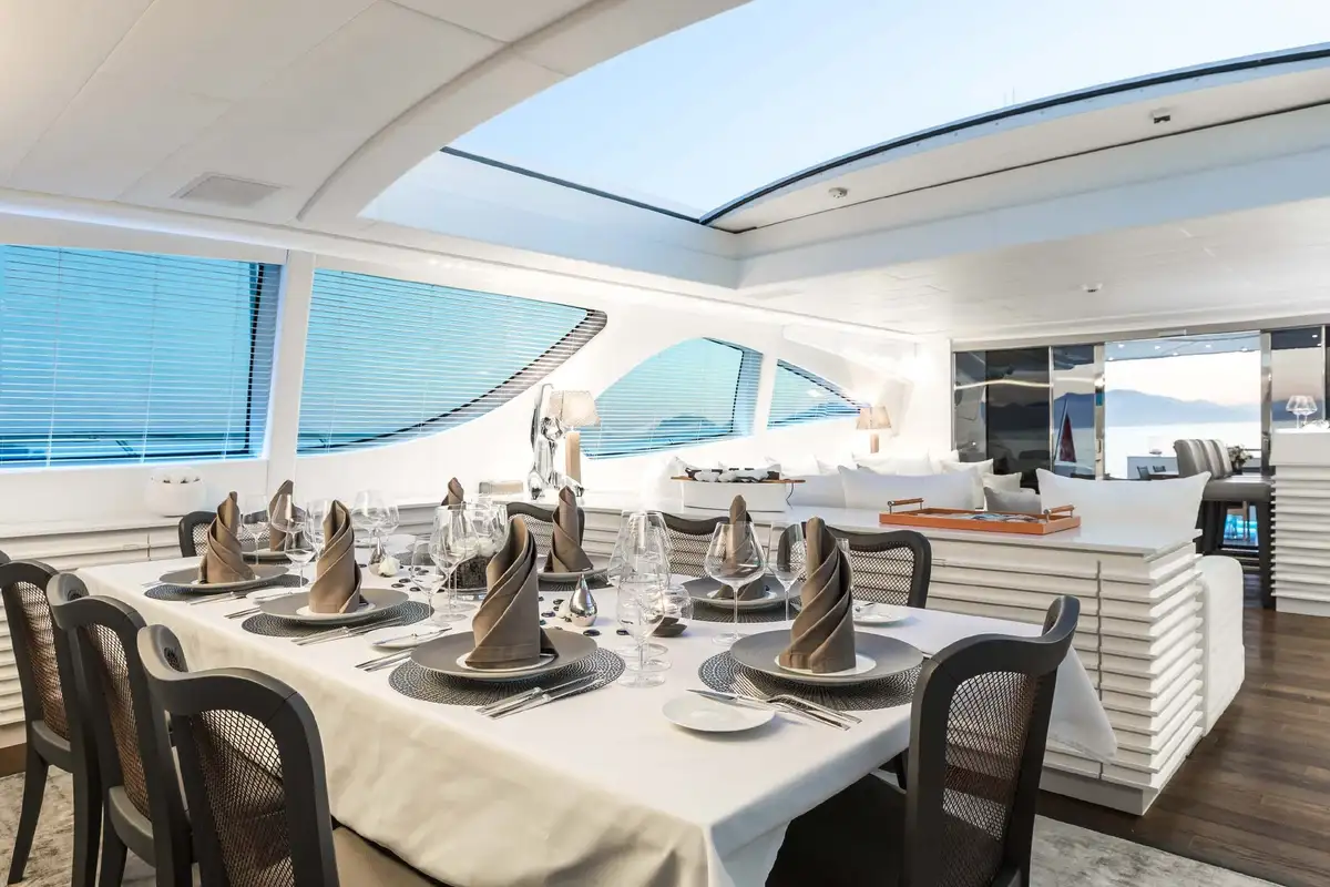 An upgraded hull and MTU 4000 engines deliver blistering top speeds of 41 knots. Zero speed stabilisers guarantee comfort in all weathers, allowing you to immerse yourself in the sleek exterior deck areas where outdoor relaxation rules. Sink into the sumptuous over-sized sun pads on the sun deck forward, which features an integrated, retractable awning for comfort all day long. Enjoy a long, lingering brunch around the sun deck dining table forward while you plan the day’s activities.