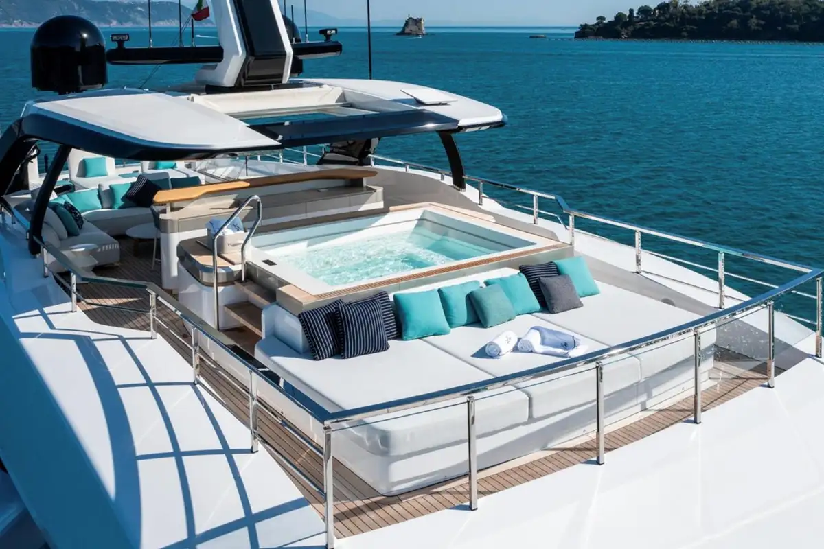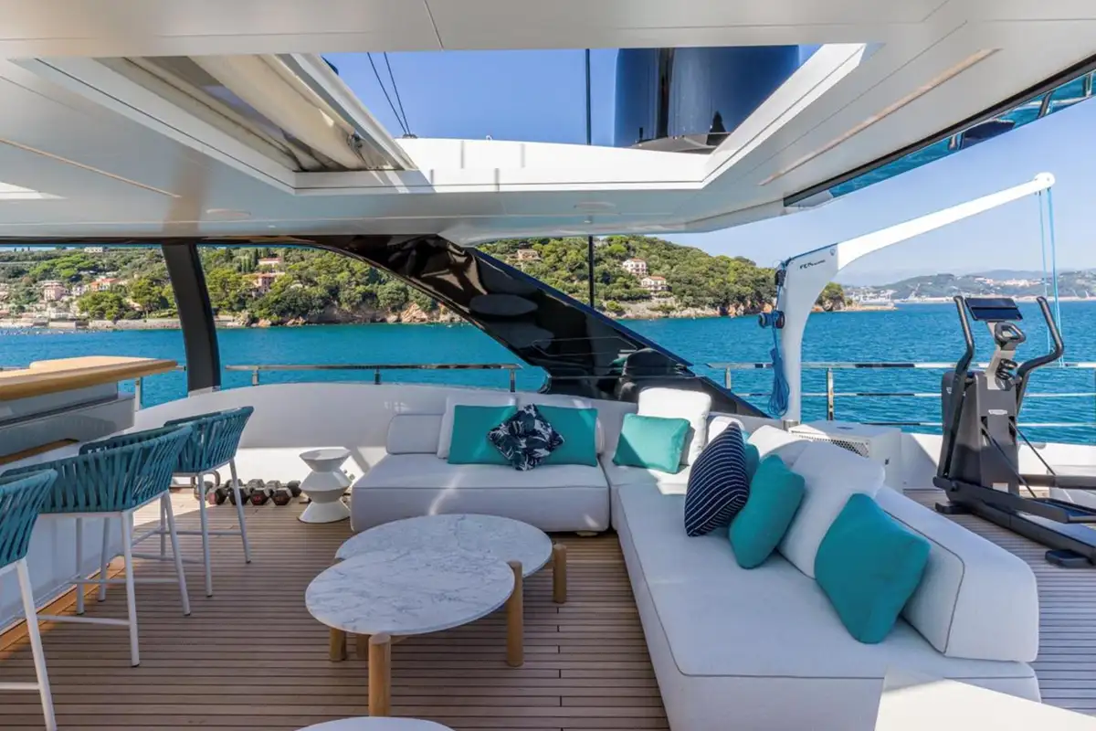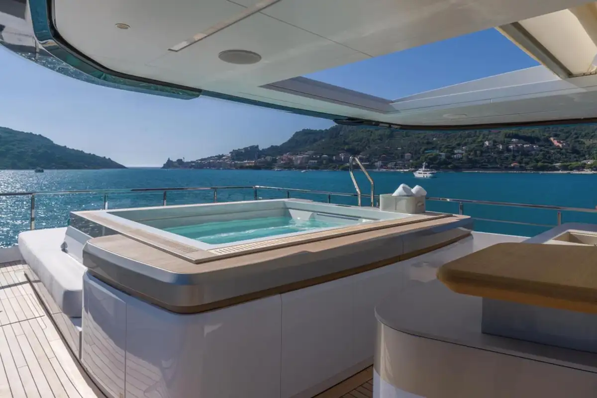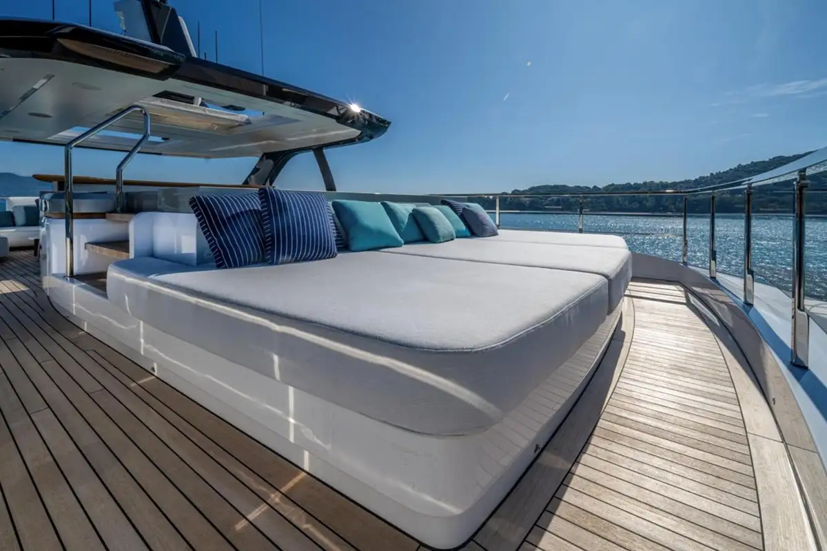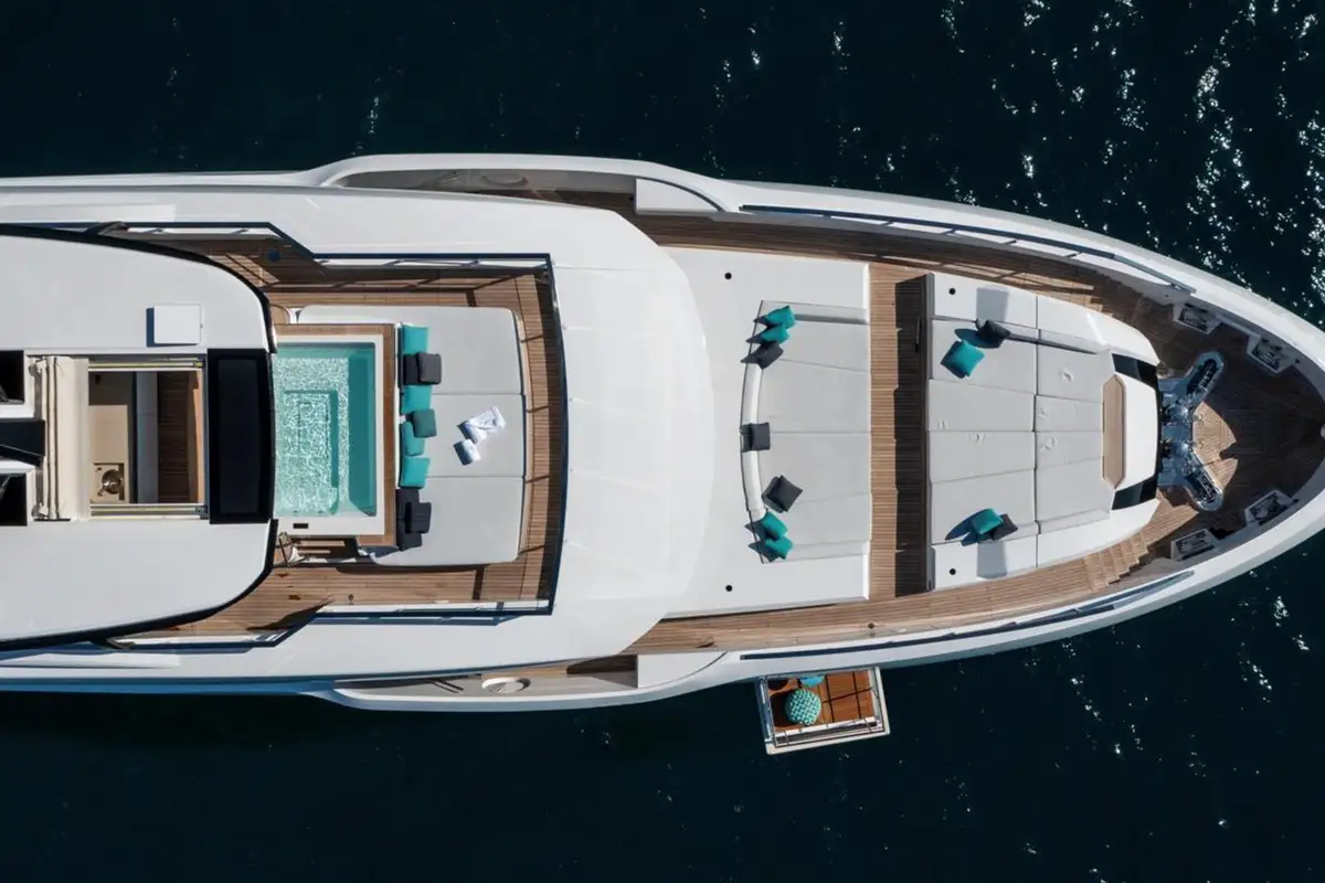 Back on board, when not in use, the pool floor can raise to create even more deck space; perhaps you’ll use it as a late-night dance floor, a space for sparring or yoga, or just to extend the stylish cockpit al fresco lounge area; the choice is yours.