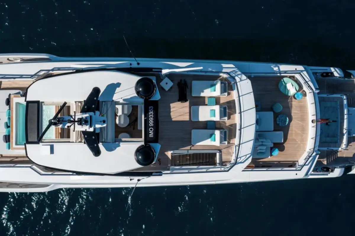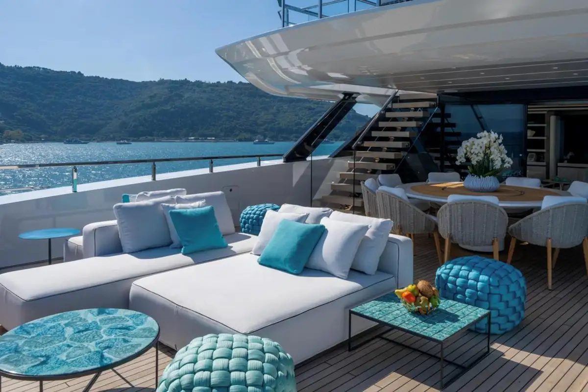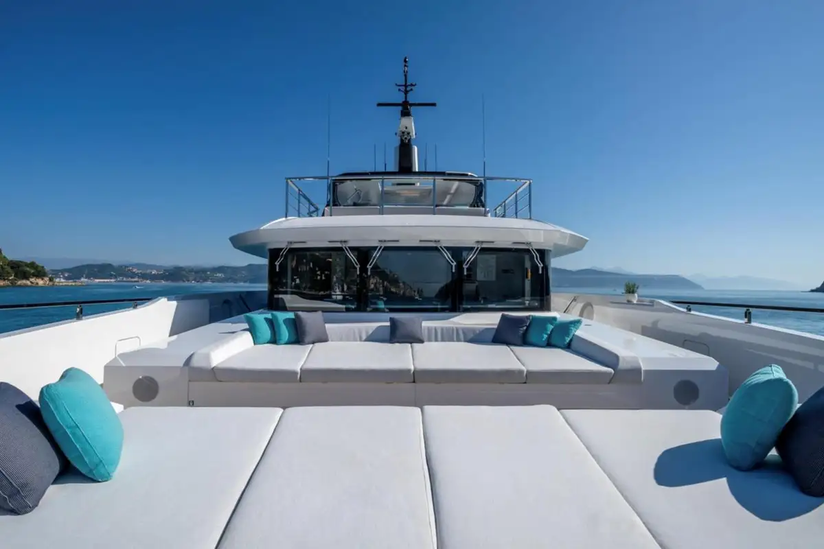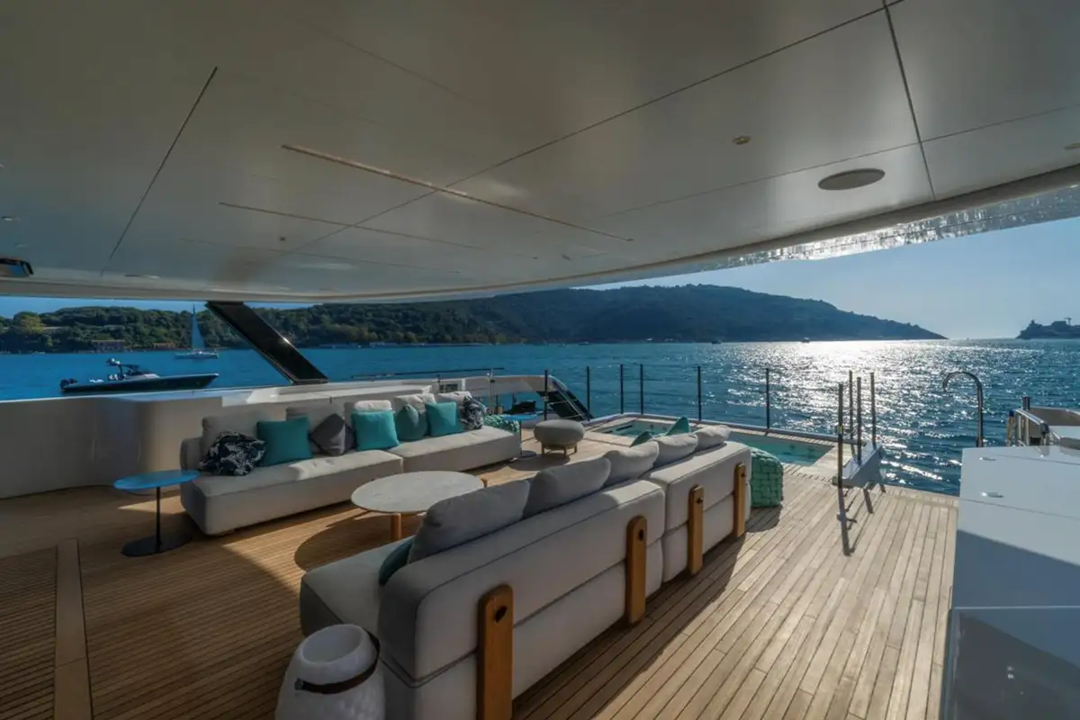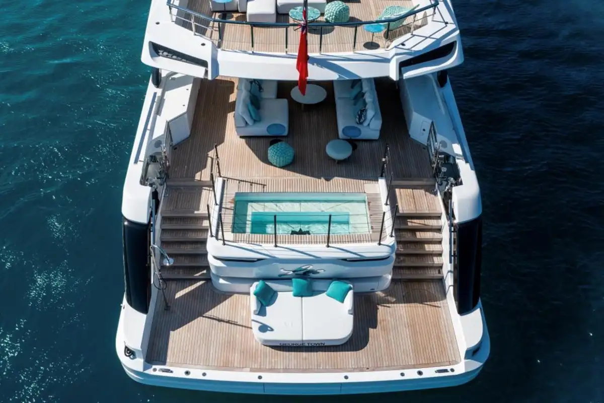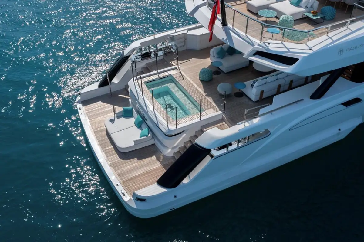 Back on board, when not in use, the pool floor can raise to create even more deck space; perhaps you’ll use it as a late-night dance floor, a space for sparring or yoga, or just to extend the stylish cockpit al fresco lounge area; the choice is yours.