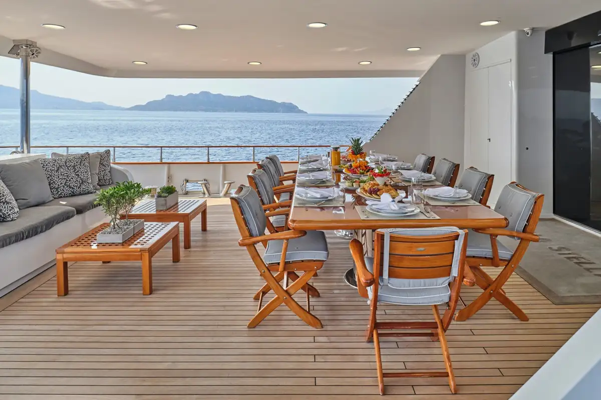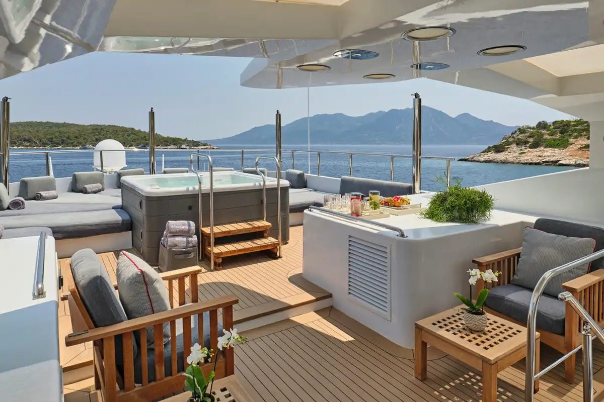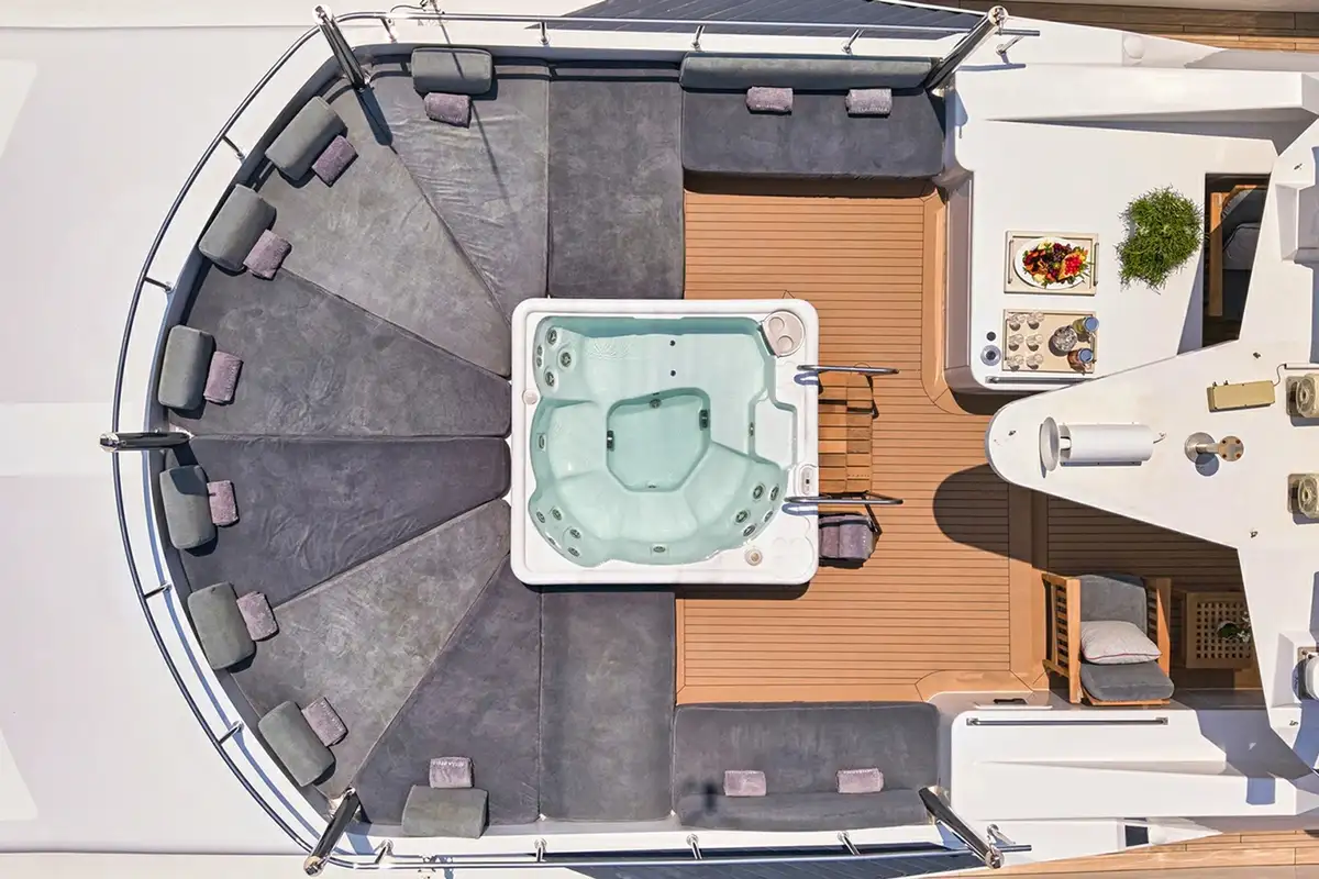 BELLA STELLA's exterior decks have also been refreshed and upgraded. The main deck aft has had a fixed sofa seating added tastefully decorated with same grey cushions and throw pillows to match and be in sync with the interior new design. Moreover, a brand new custom made dining area has been added on the main for up to 12 guests. A great private large jacuzzi deck offers perfect relaxation and views with large build-in fixed sun pad area and awning for shade upon request.