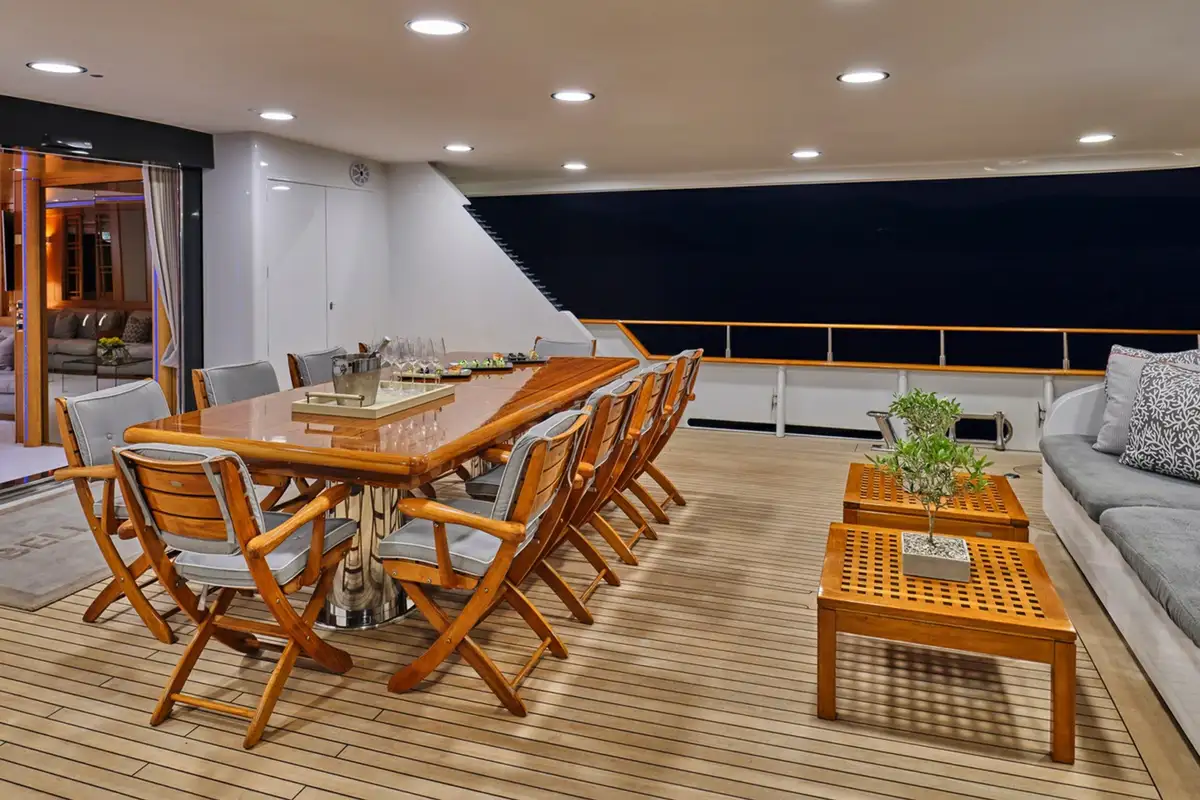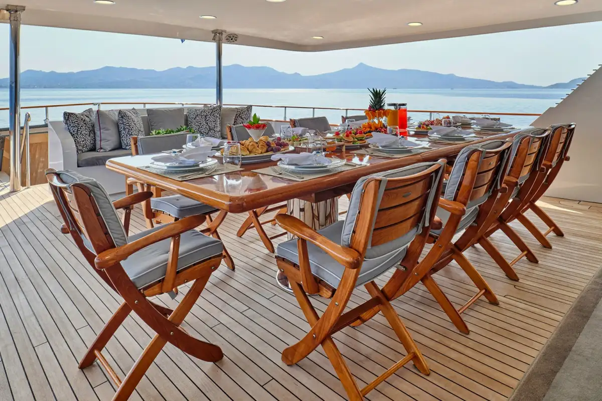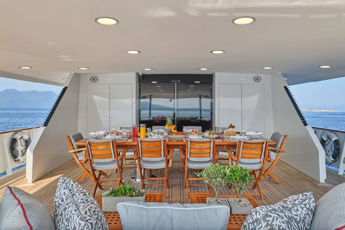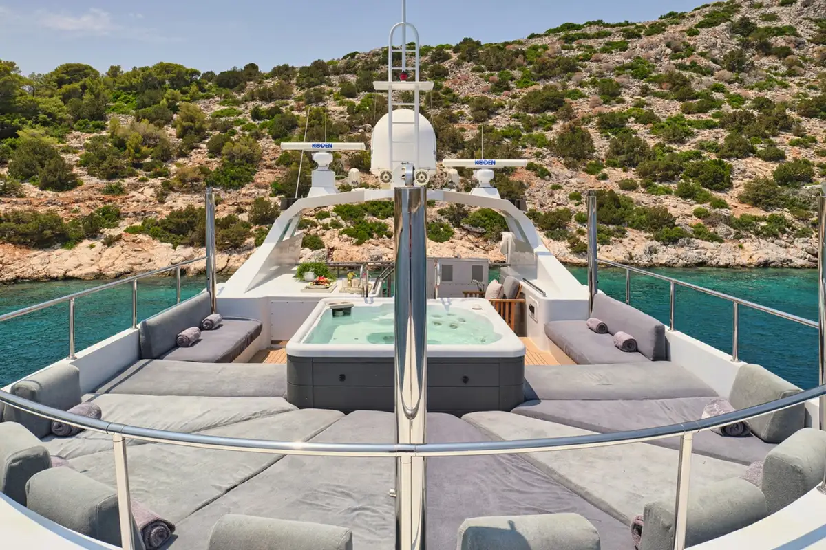 BELLA STELLA's exterior decks have also been refreshed and upgraded. The main deck aft has had a fixed sofa seating added tastefully decorated with same grey cushions and throw pillows to match and be in sync with the interior new design. Moreover, a brand new custom made dining area has been added on the main for up to 12 guests. A great private large jacuzzi deck offers perfect relaxation and views with large build-in fixed sun pad area and awning for shade upon request.