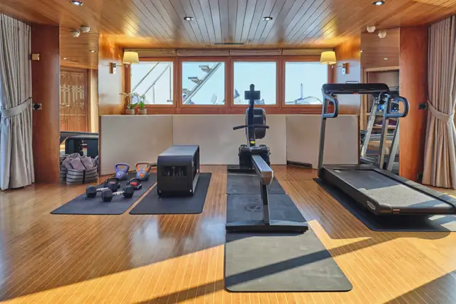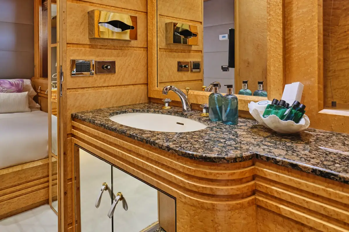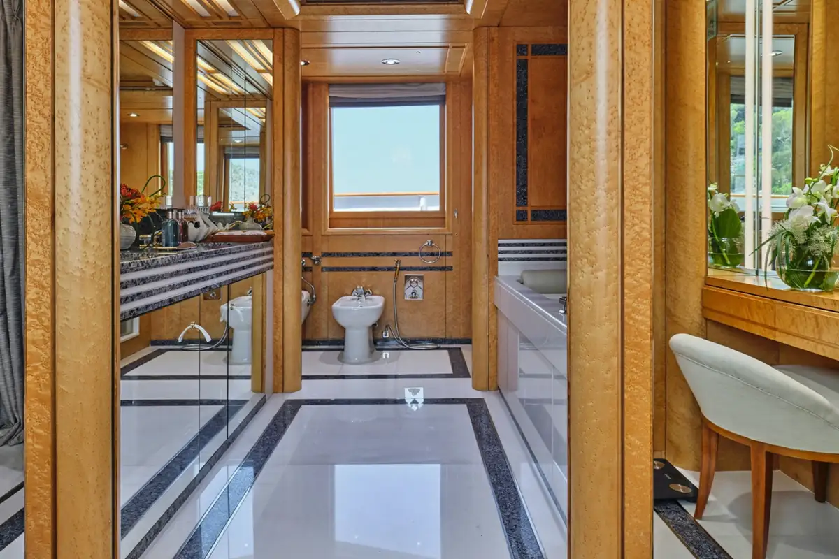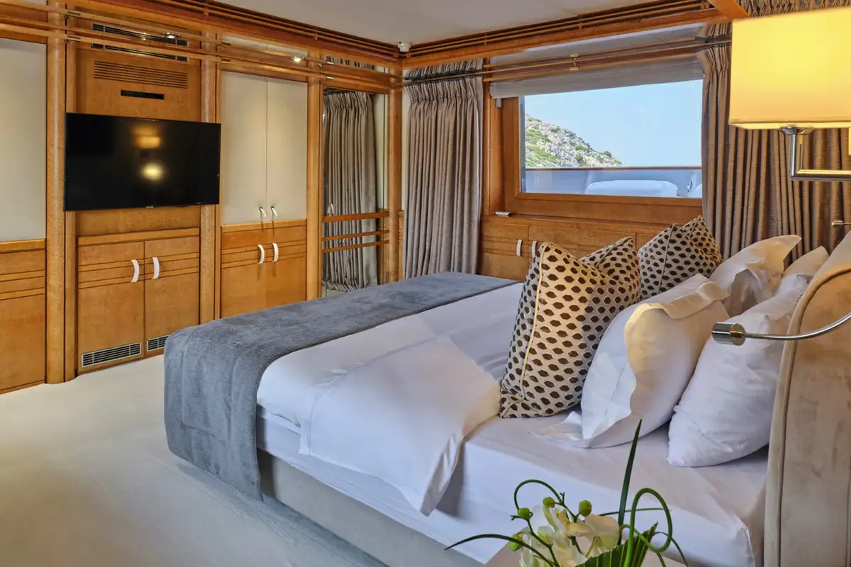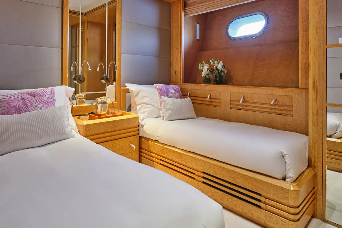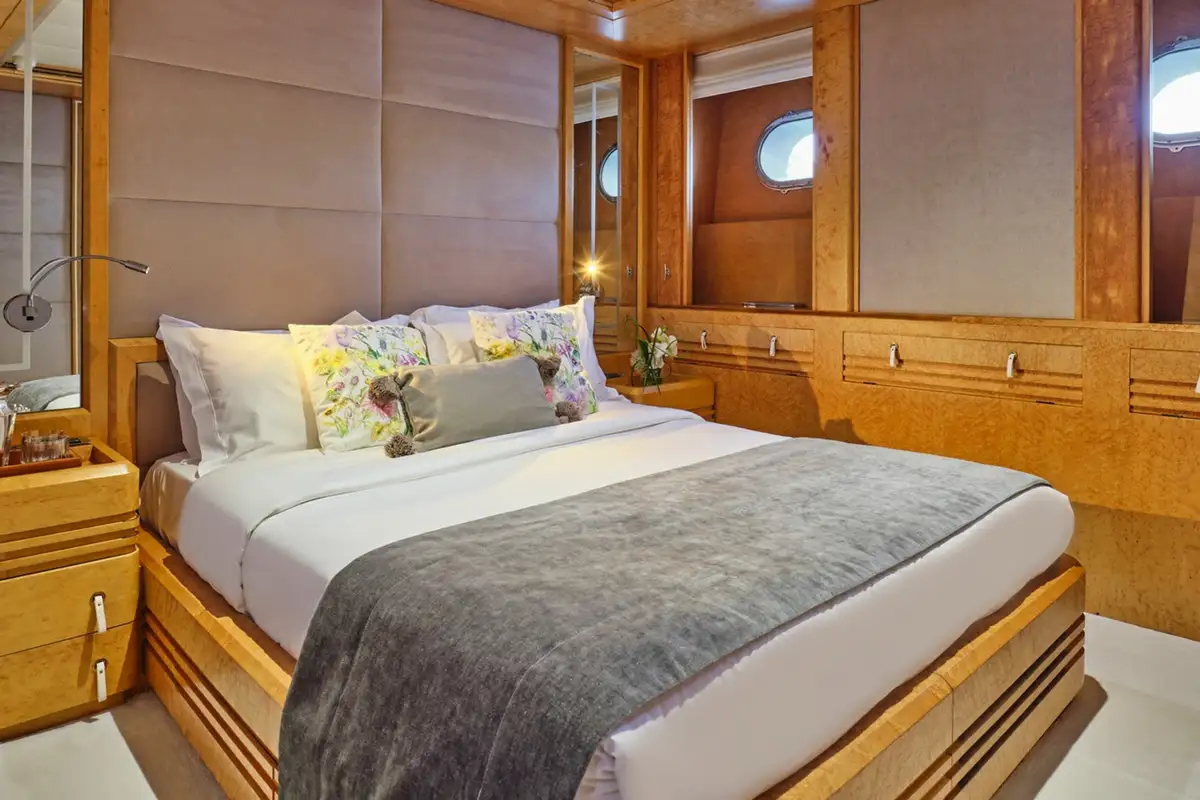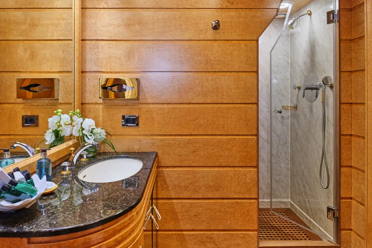 The very comfortable and accommodating seven guest cabin layout for up to 12 guests remains unique in her category and not easily surpassed by any other yachts in the area. The full beam master cabin is located on main deck with a sofa area and a full beam bathroom with a bathtub and a shower room as well as a vanity desk. She has six spacious and fully renewed cabins located on lower deck, four double and two twins.