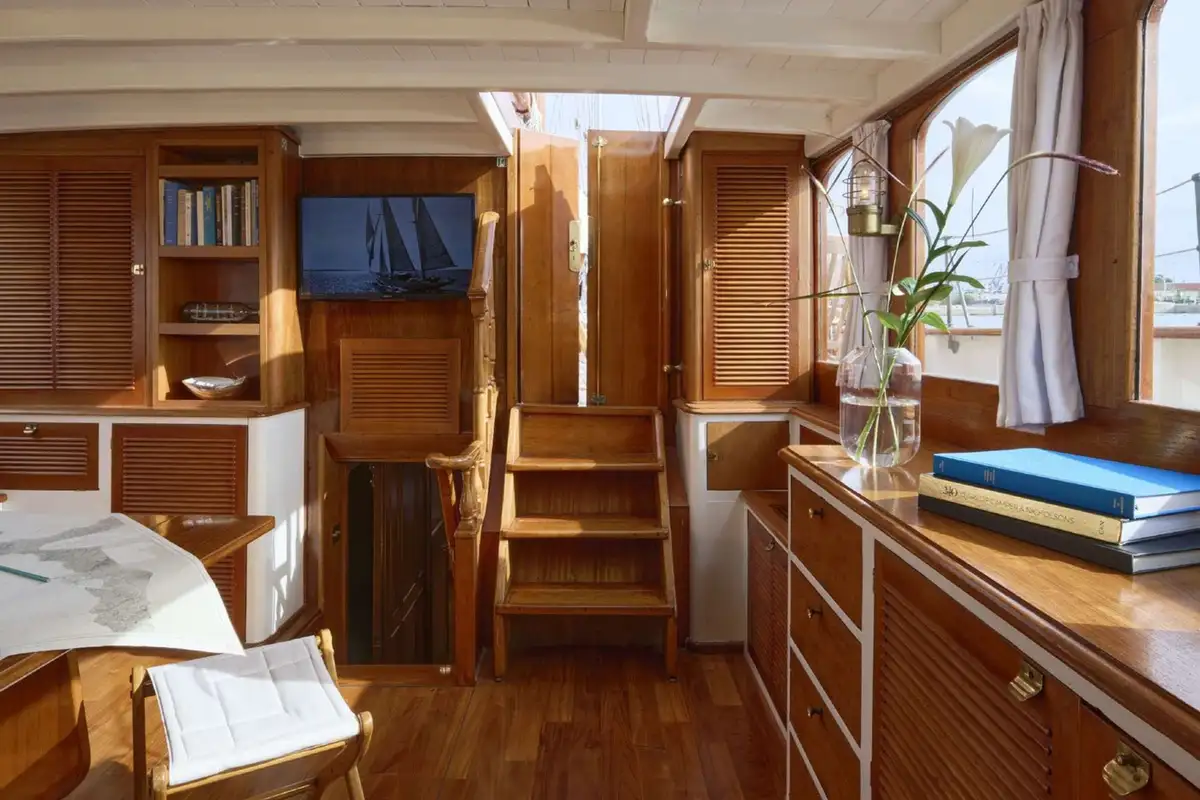 This truly beautiful yacht will turn heads in whichever harbour or bay you arrive in. A genuine sailing yacht, she’ll carry you from port to anchorage and enthral you and your guests with her bygone charm, style and the rush of water past her teak sidedecks.
