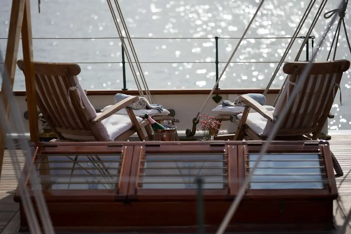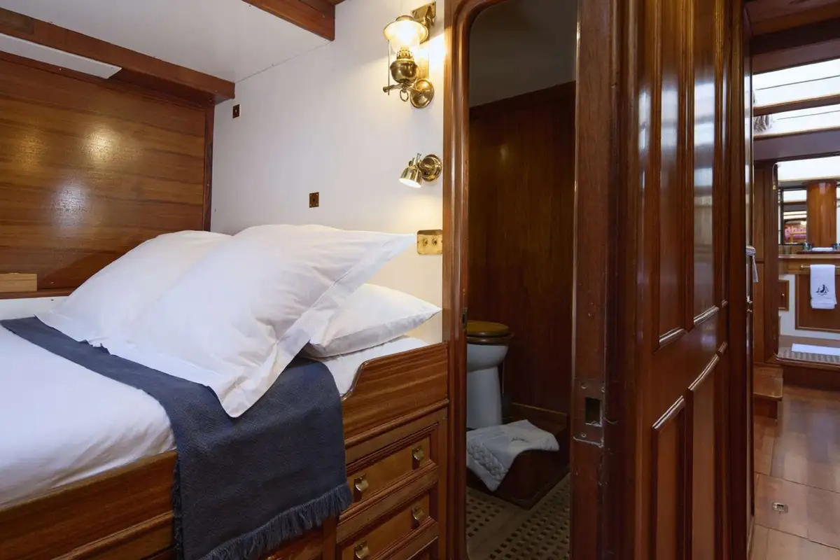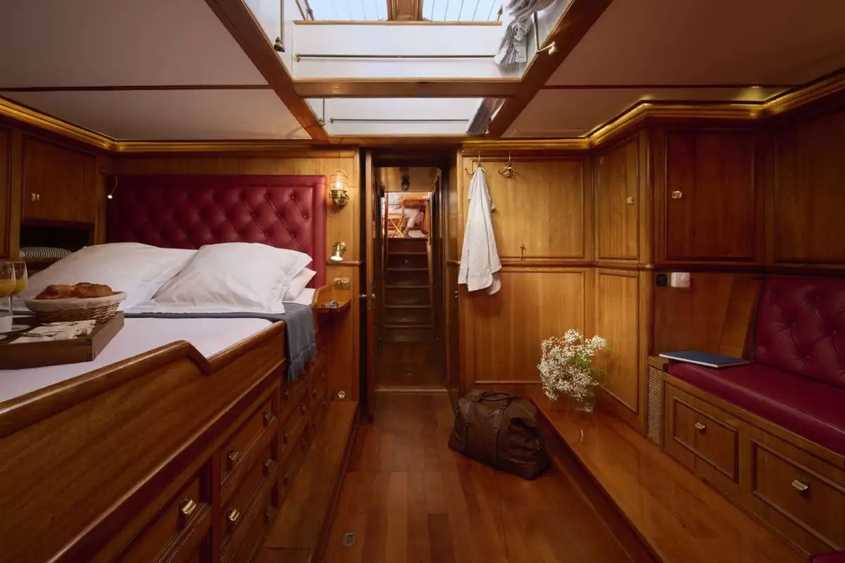 Dine on deck beneath the towering main mast (and the stars), enjoy cocktails watching the sunset from any part of her 33.25m (109.1ft) teak decks, then retire to the raised lounge to extend your evening without losing touch with your surroundings.