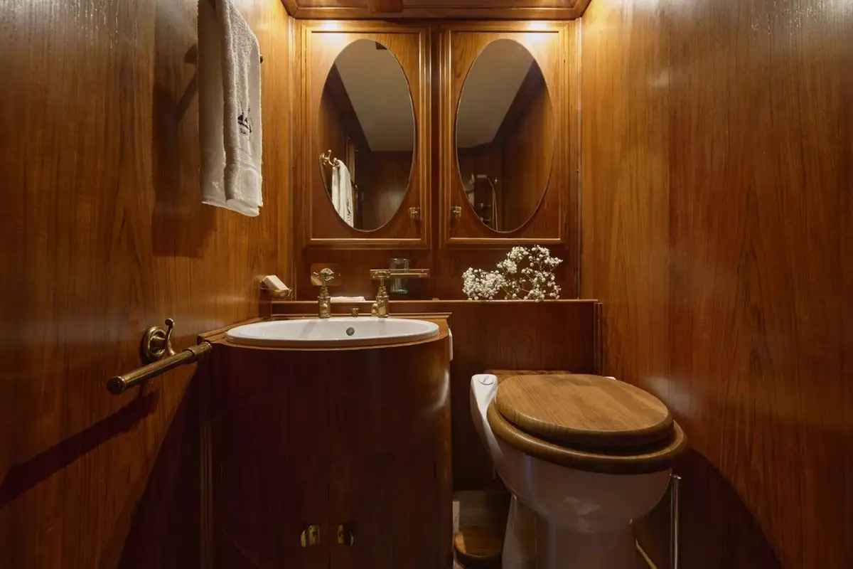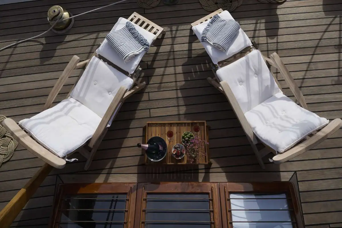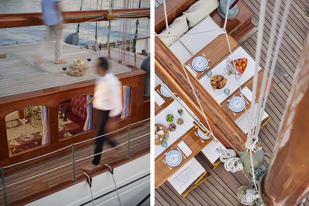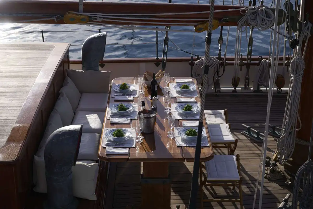 Dine on deck beneath the towering main mast (and the stars), enjoy cocktails watching the sunset from any part of her 33.25m (109.1ft) teak decks, then retire to the raised lounge to extend your evening without losing touch with your surroundings.