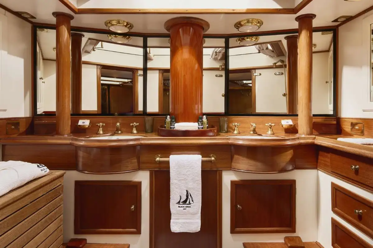 As classic charter experiences go, few yachts can impress like the gaff-rigged ketch BLACK SWAN 40m (131ft) . From the board of Charles E Nicholson, built by Camper and Nicholson in 1899, BLACK SWAN has evolved, been refitted and upgraded, is beautifully maintained, and will melt any sailor’s heart. Originally launched as a gaff rig yawl, 125+ years later, she has many stories about her past. Throughout BLACK SWAN, leather, oak, Oregon pine, bronze, brass and teak transport you back to the cherished early 1900s era of large yacht racing. A stroll along her inviting deck will reveal many skylights that allow light and fresh air to cascade into the interior of this gorgeous yacht.