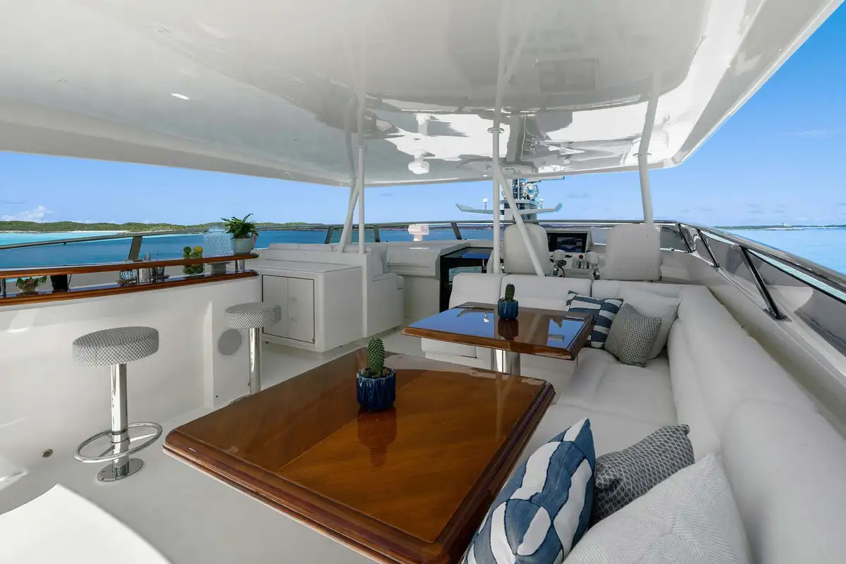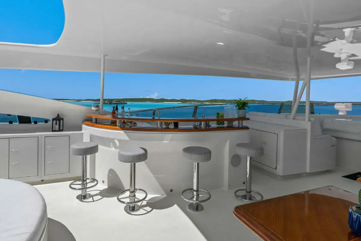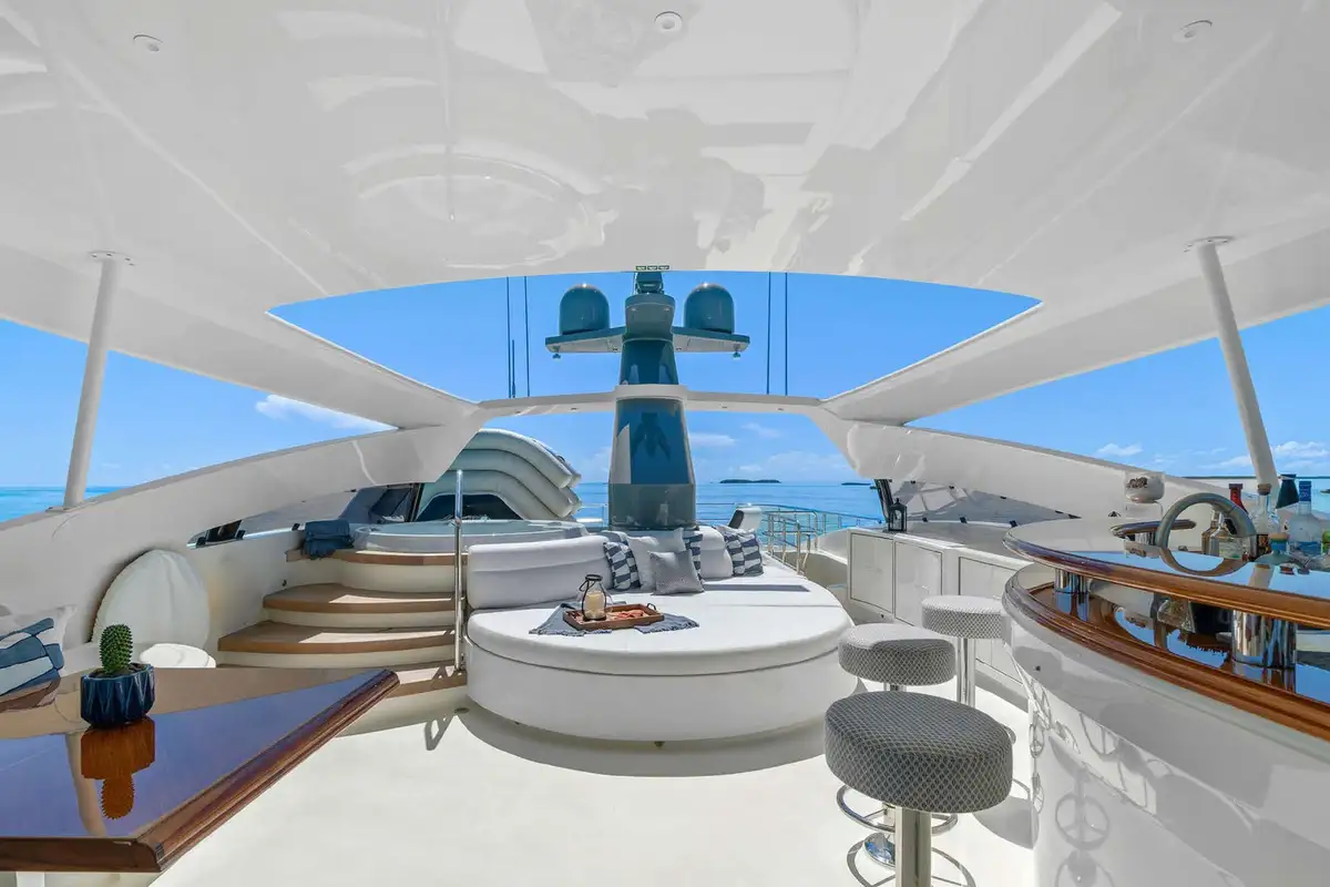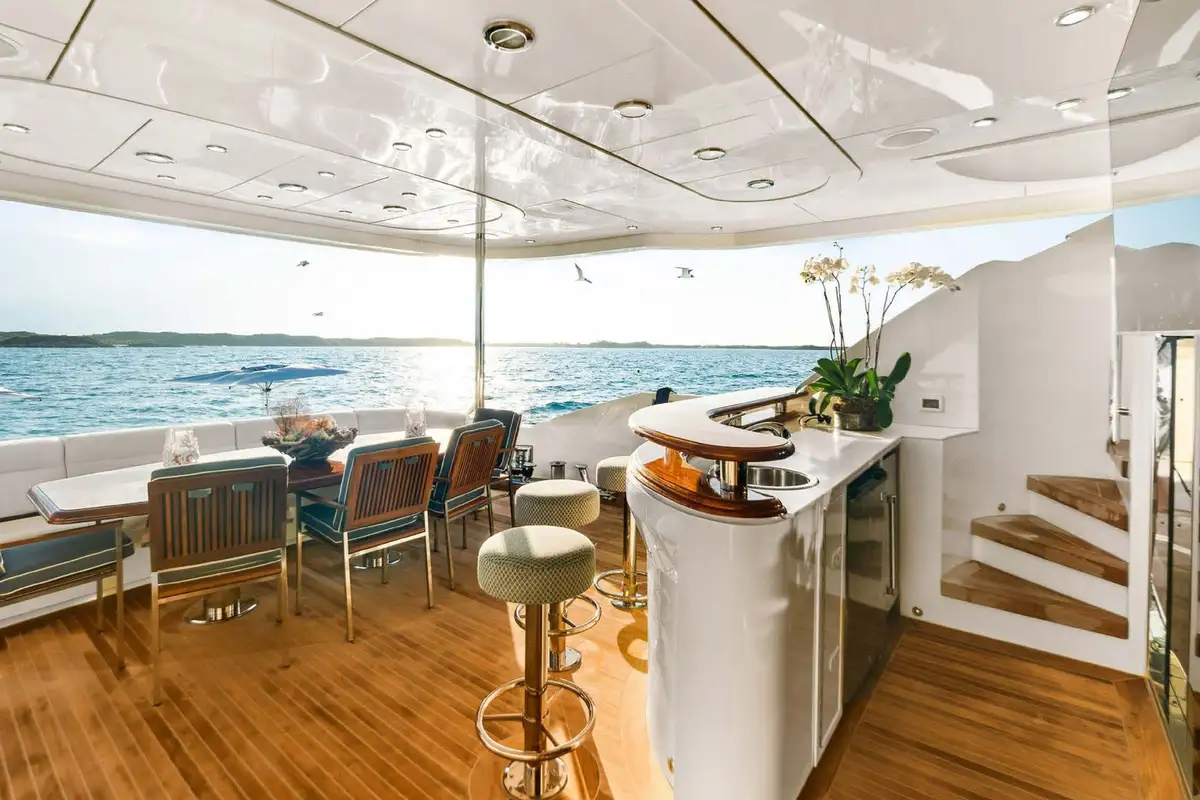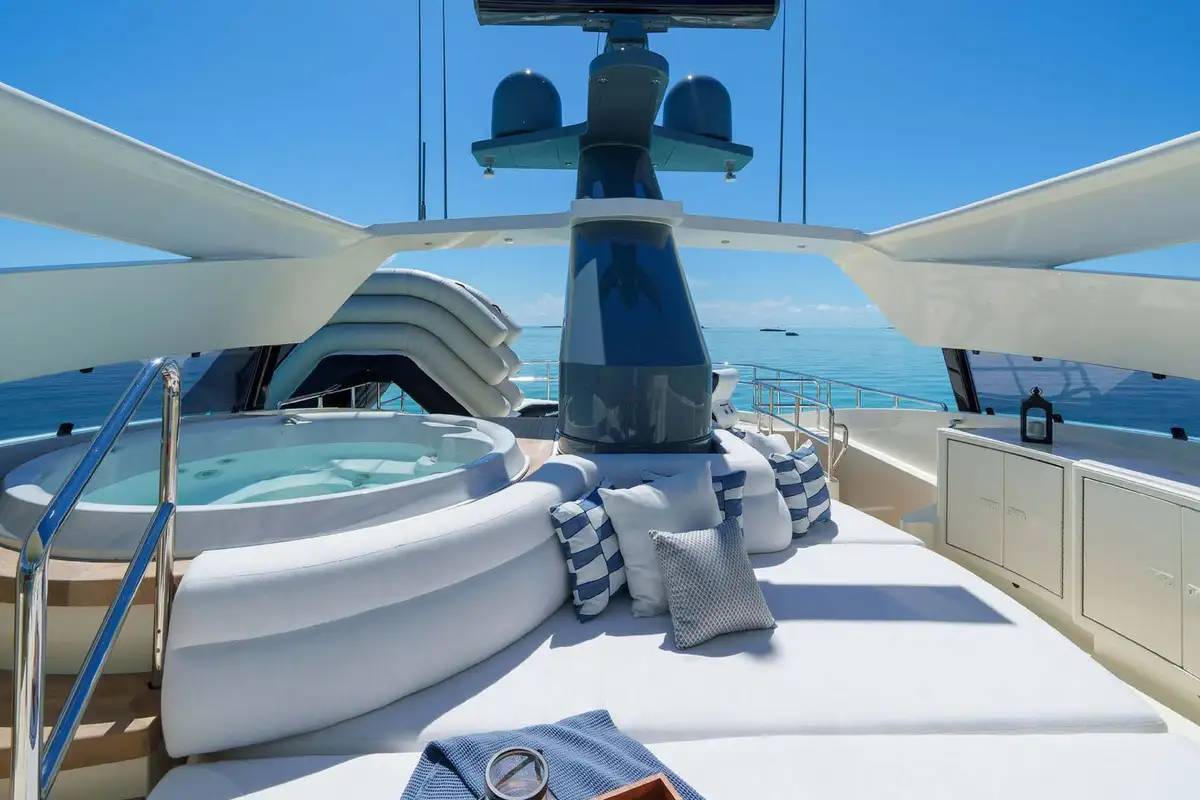 One of her stand-out features is the hardtop sun deck with amole living and lounging space in both full sun and cool shade. There’s a flybridge helm up front with observation seats for guests, and a lounge-dining area amidships with sociable seating opposite a sit-up bar. Further aft is a jacuzzi pool and a broad expanse of sunpads, and beyond it, facing astern, is an open deck with sun loungers. With a wide variety of places to sit or recline in groups or alone, it’s a versatile living space with broad appeal.
