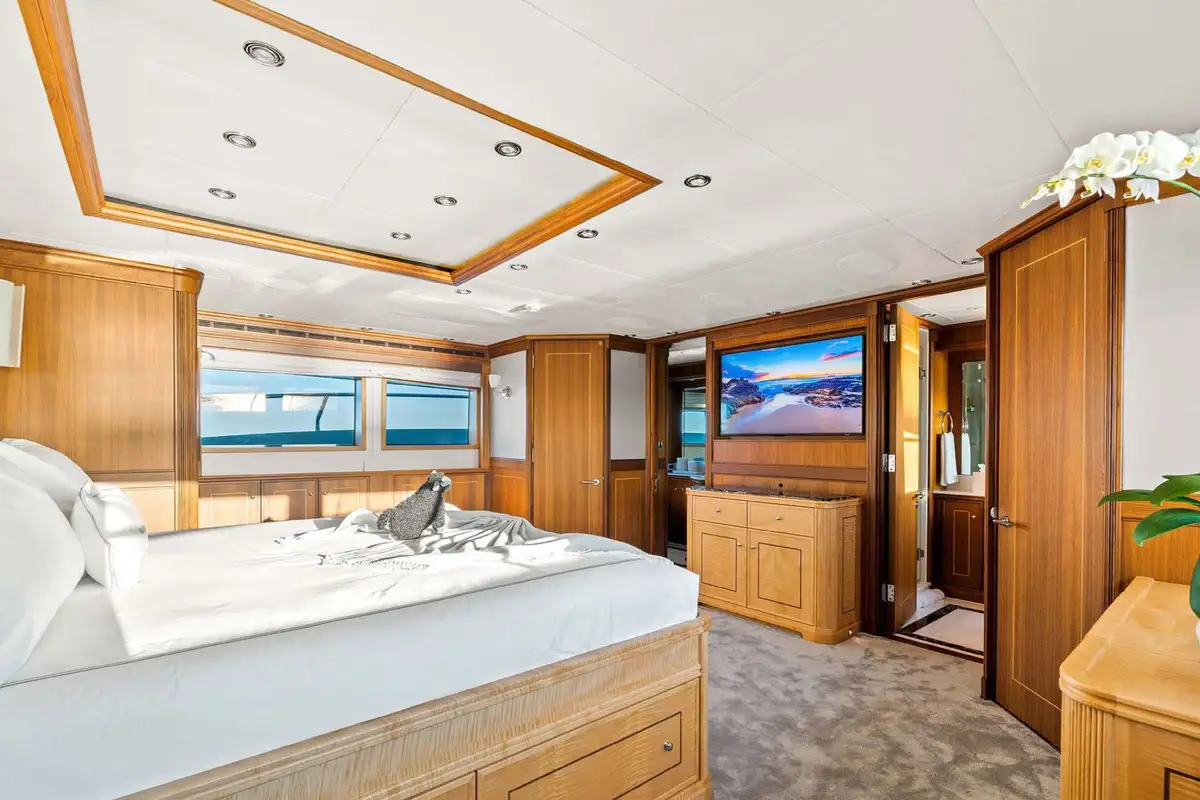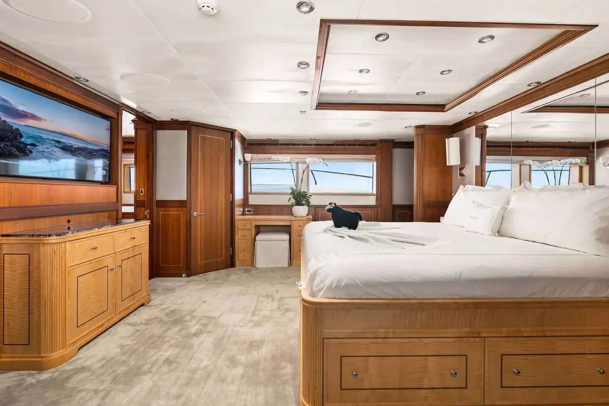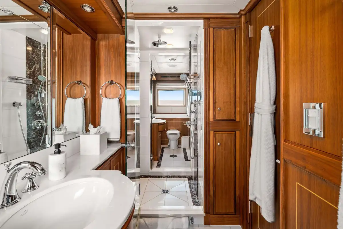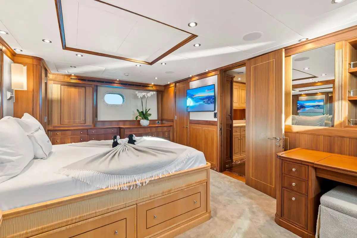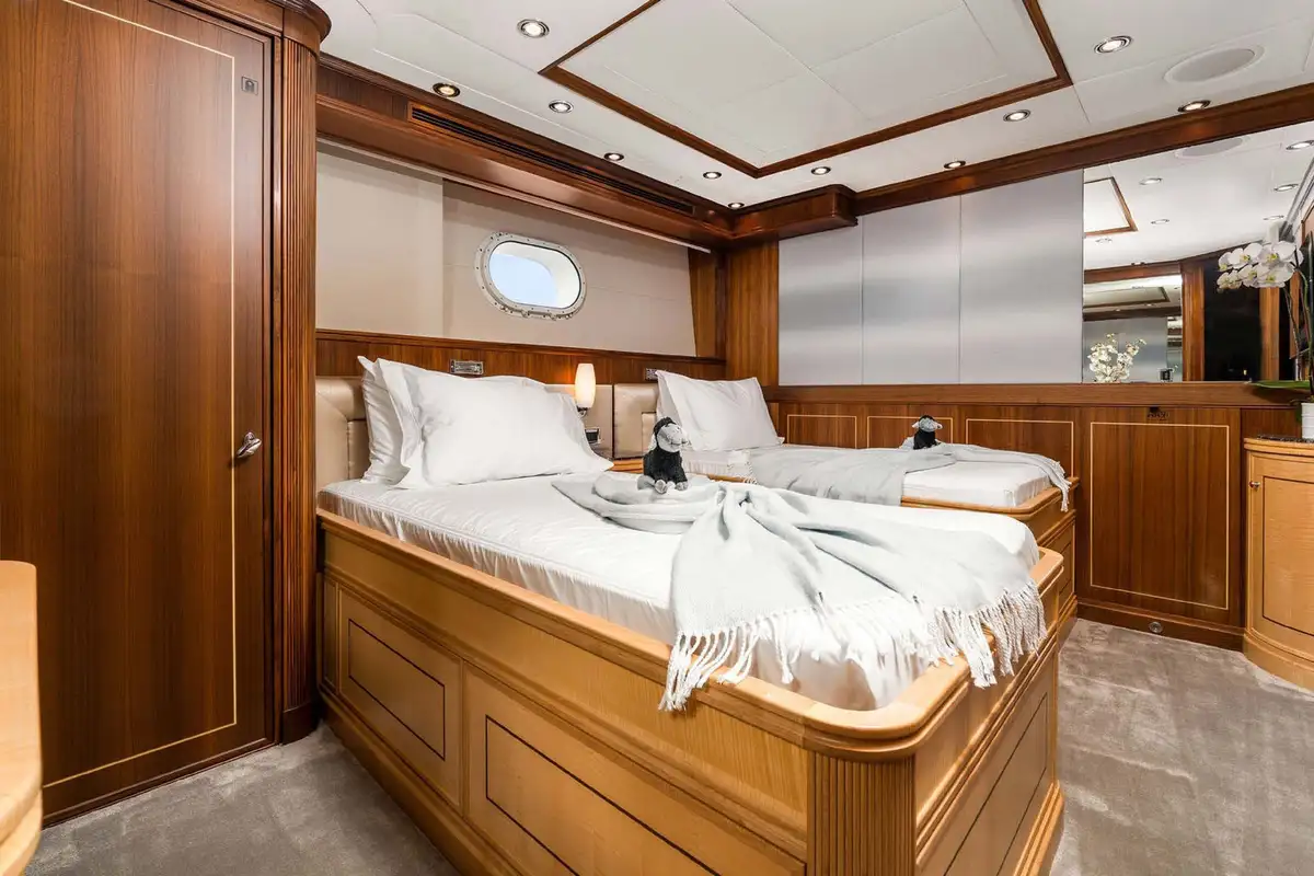 Her main deck lounge is a bright, luxurious living room with separate lounge and dining areas – and great sea views wherever you sit. Also on the main deck level is the master suite, with a king size bed in the full-beam main cabin plus a desk and an opulent en suite bathroom.