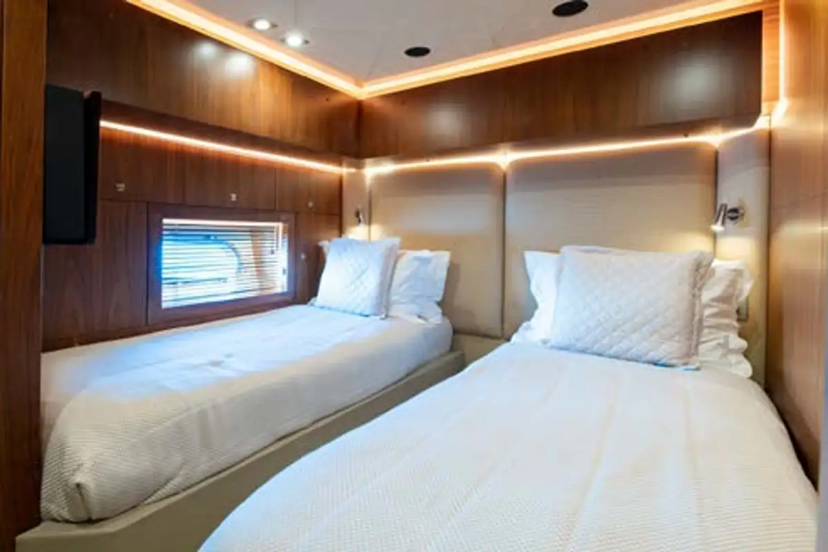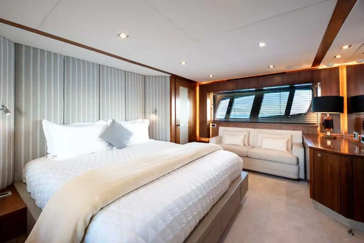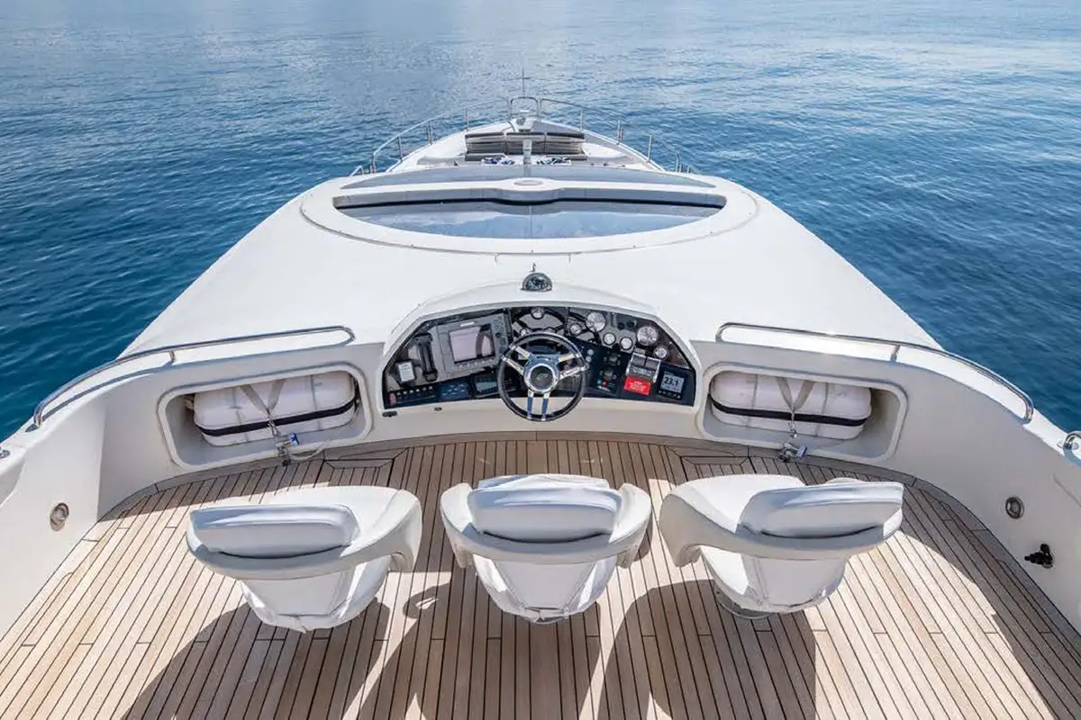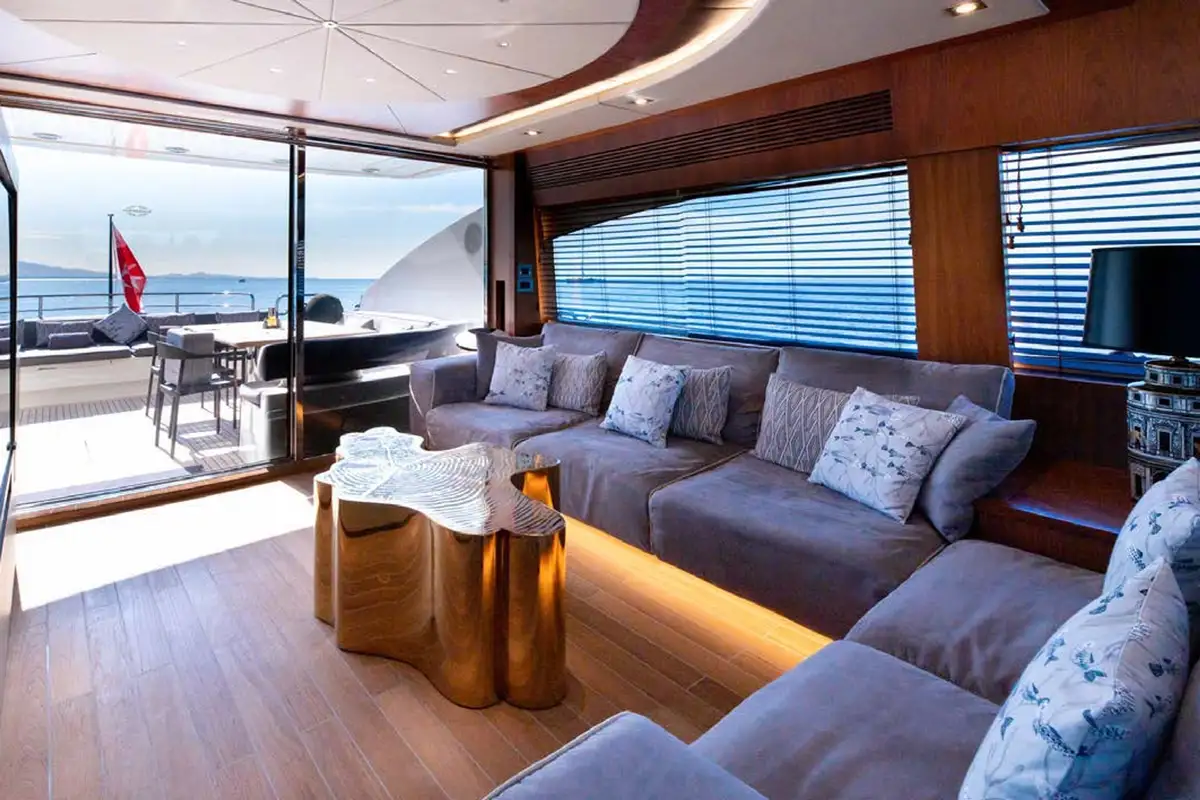 The flybridge is a true highlight, offering an elevated open-air retreat fitted with soft sunpads, relaxed seating and panoramic views. Whether guests prefer to unwind in the sunshine or enjoy a sunset cocktail, this flexible space caters to both indulgence and convivial gatherings. Teak decking and contemporary furnishings complete the look, ensuring comfort without compromising on aesthetics.