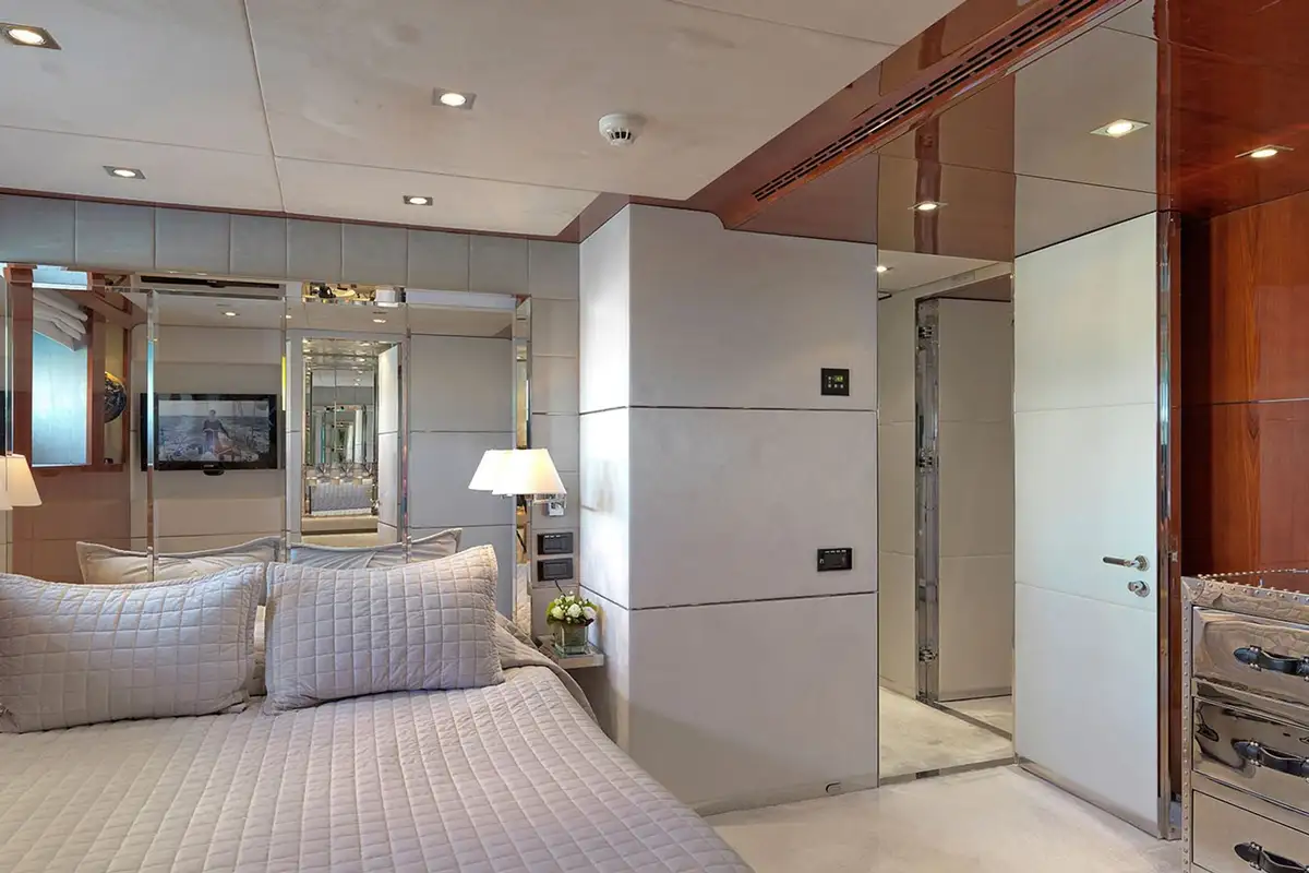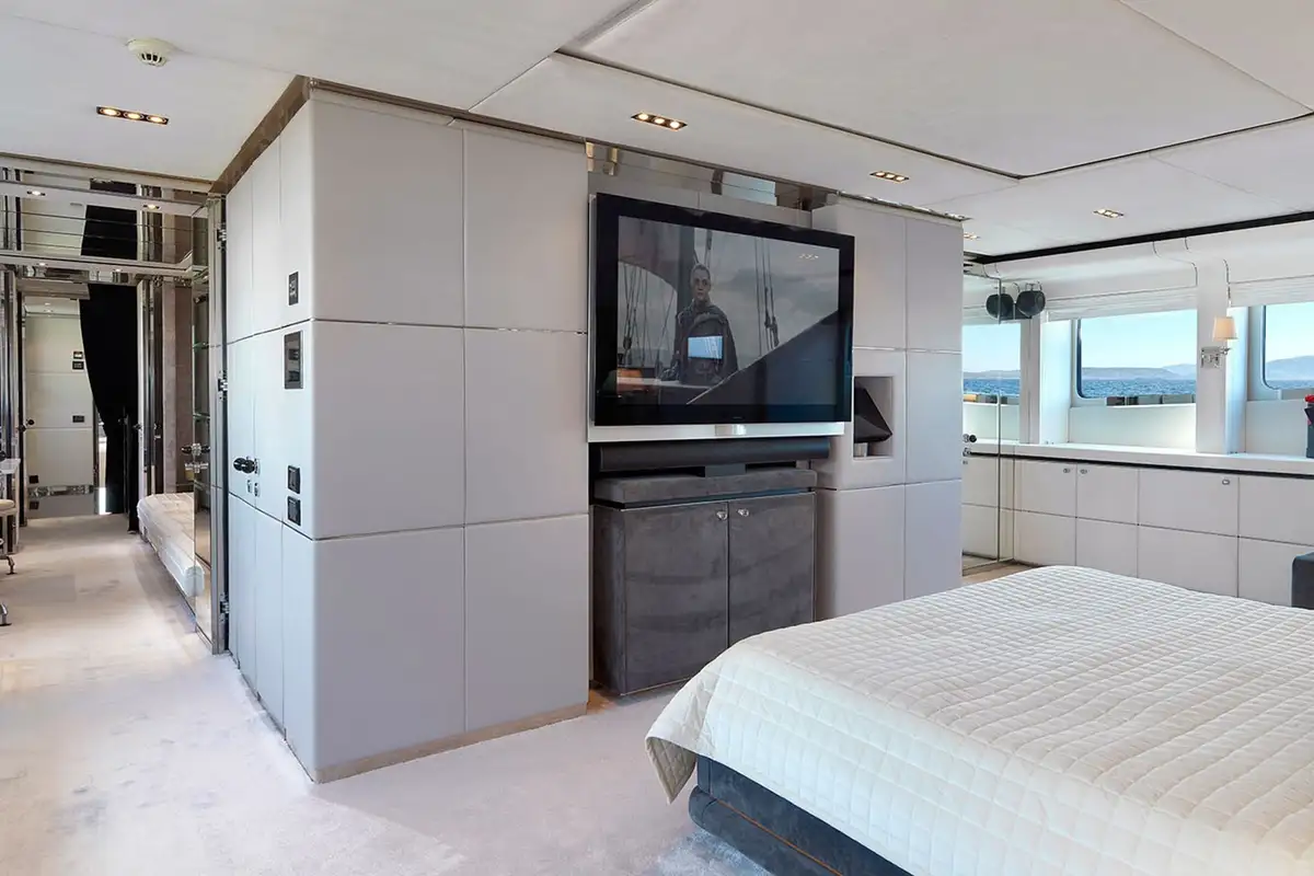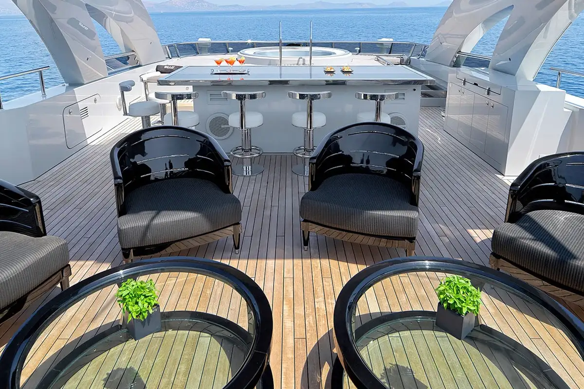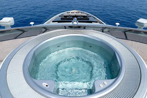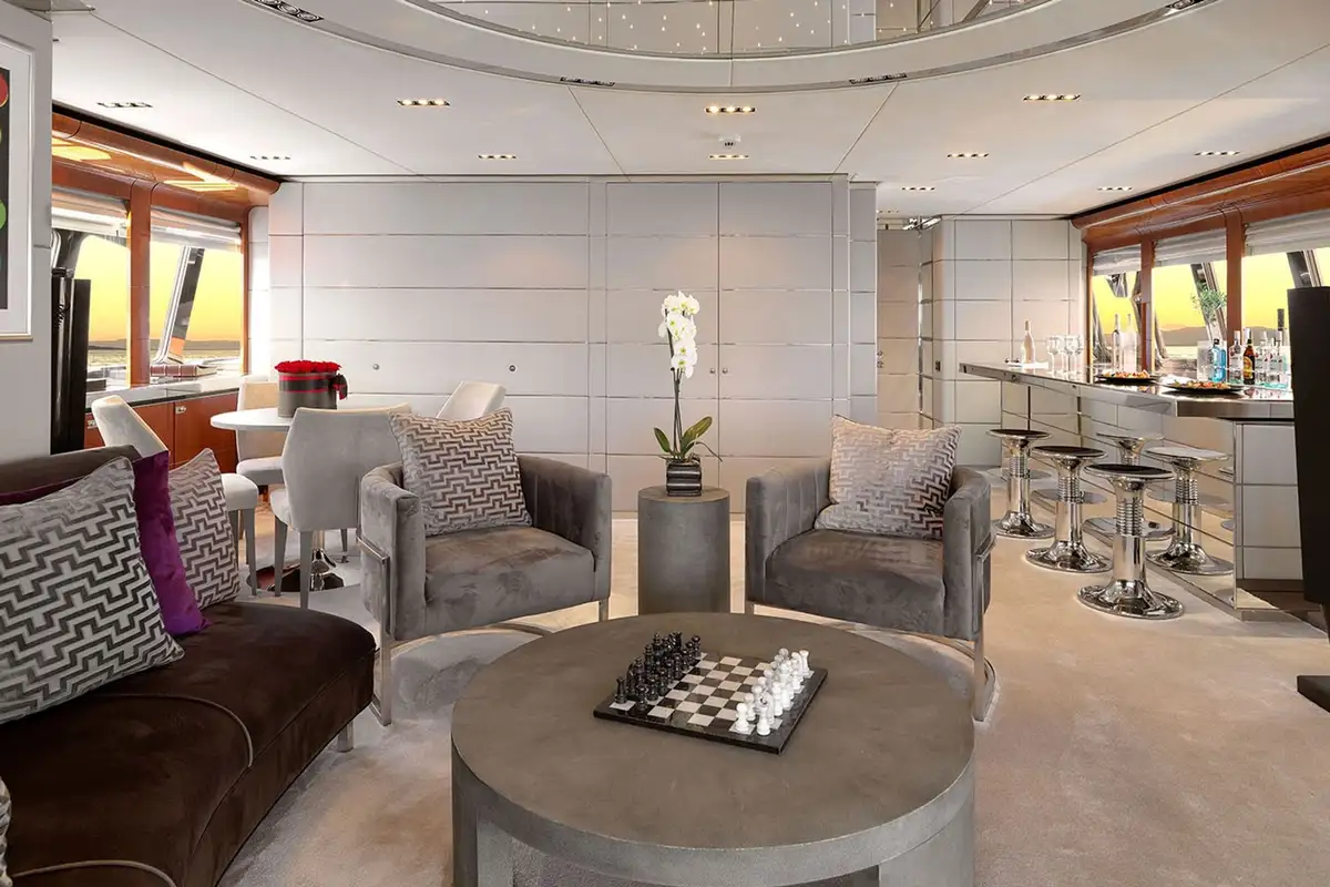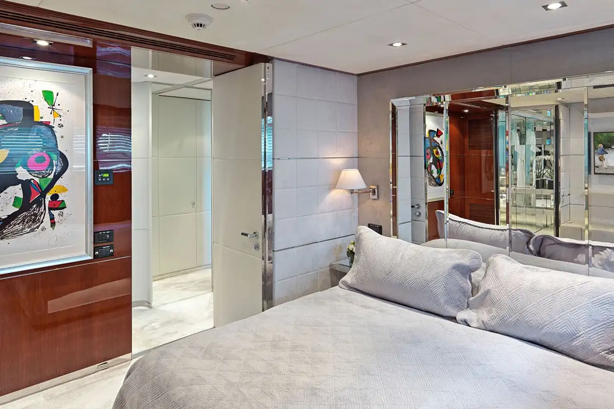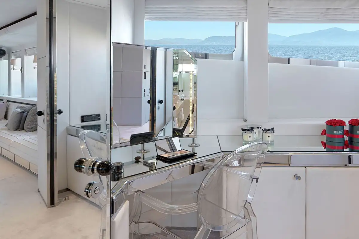 The sundeck is a notable highlight with its six-seat cocktail bar, sociable lounge, jacuzzi pool and sunbeds. There’s also a stylish foredeck lounge with more sofas and sunbeds, two outside aft decks, a two-person sauna and a garage full of tenders and toys. These include a 12-metre chase boat, a super fast jet powerboat, high-spec SeaDoo watercraft, a SeaBob underwater scooter, inflatable tows, paddleboards and more. There’s also a full set of gym equipment on board.