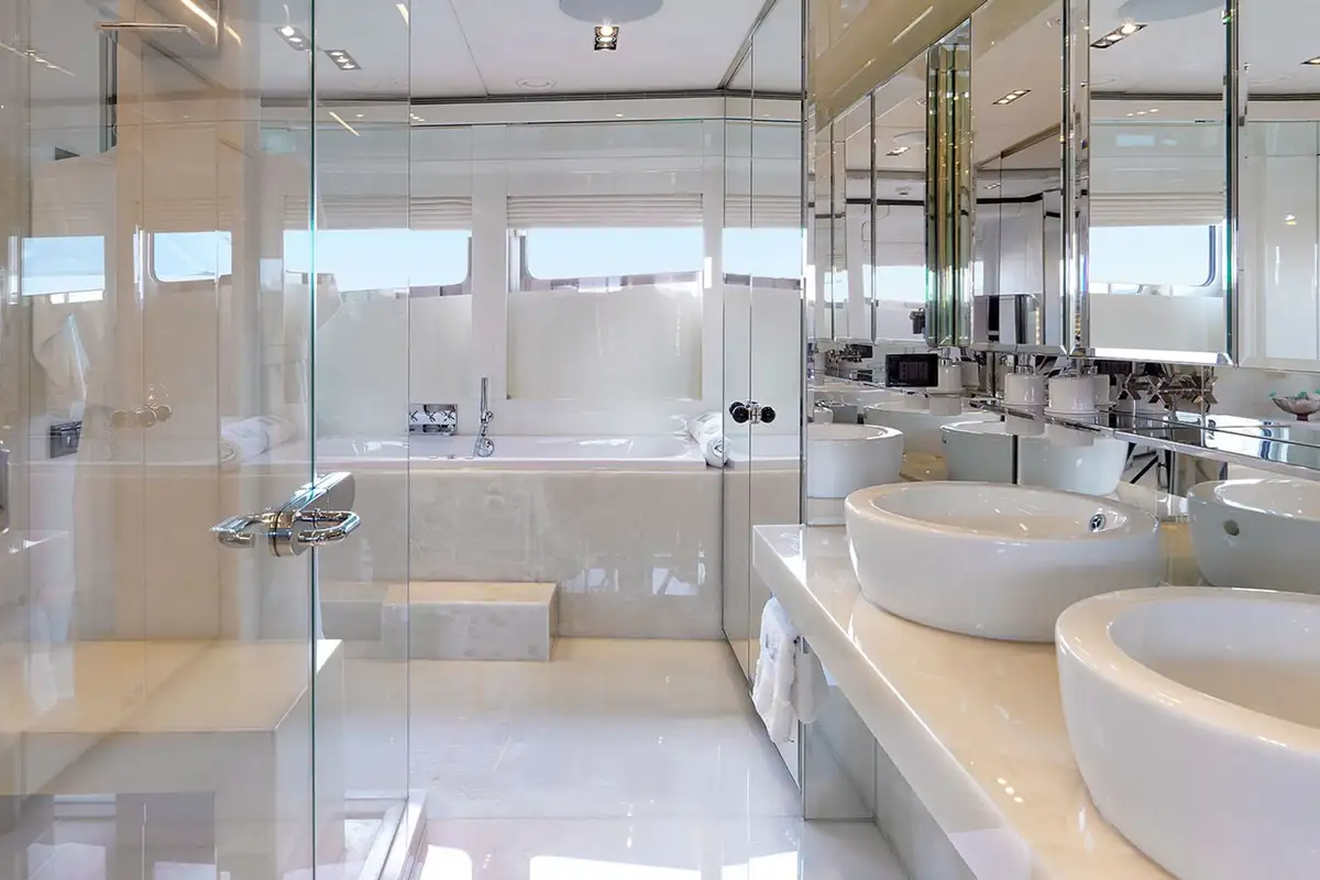 Up front on the main deck, the master suite is bright and inviting with a clean, contemporary feel. There’s a sofa on one side of the main cabin and the en suite bathroom has a bathtub as well as a large, separate shower and a beautiful marble finish. The sky lounge converts from a living and games room with a cocktail bar into a king size suite with elevated sea views, and the lower deck cabins – three doubles and a twin – are all bright and nicely finished, each with its own private en suite bathroom.