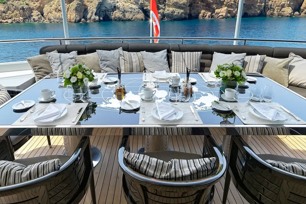 Designed for up to 12 overnight guests in seven beautifully finished cabins with service from a crew of nine, her versatile accommodation layout includes an upper deck lounge that converts into a second master suite. She is also ideal for hosting large daytime or evening events with up to 24 guests on board.