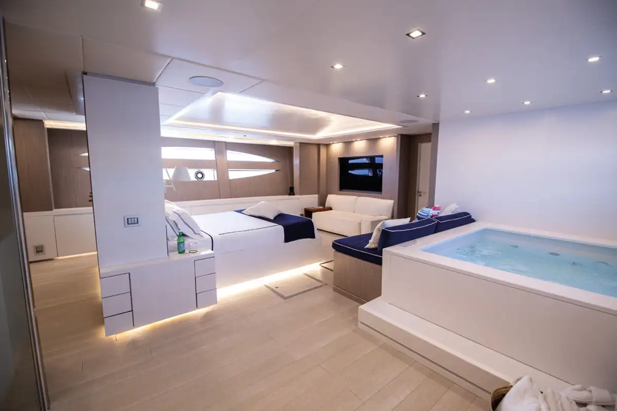 A charter on BLUE DEVIL is just about speed. You get to enjoy a level of indulgence that even your guests don’t. The full-beam master suite on the lower deck is light, modern and spacious. It also has a jacuzzi in the suite. Not a bathtub with jets, a jacuzzi. If that were not enough to tempt you, as well as the king-sized berth and lounge area, you also get a private steam room in your suite.