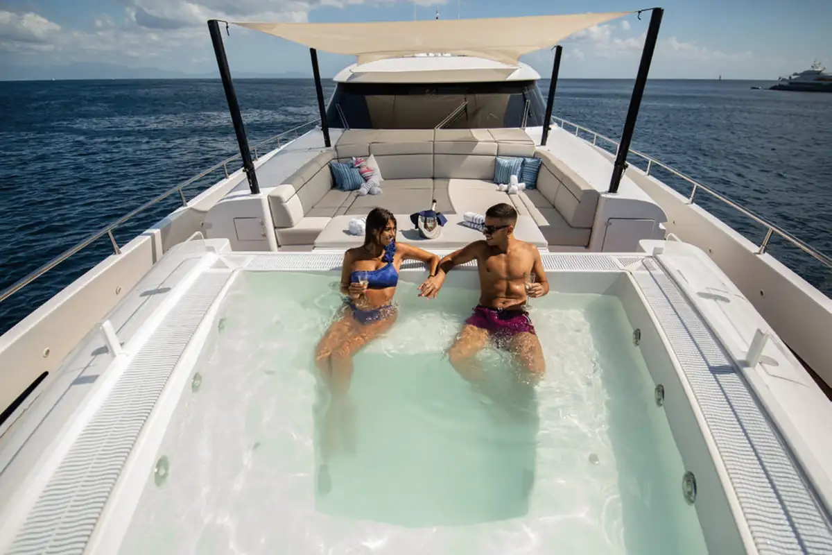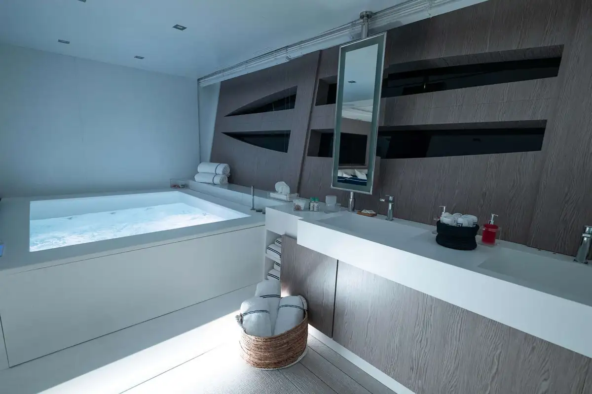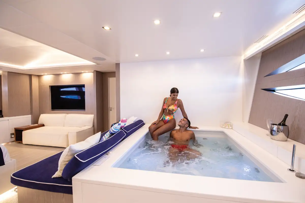 On the foredeck, you can take in unspoilt views of the magnificent location the captain has picked for you. You’ll also find the stunning al fresco lounge area with a second jacuzzi and vast sunpads. This area can also be shaded for more comfort in the afternoon. Likewise, the sunpads to the rear of the cockpit and the al fresco dining area can also be covered.