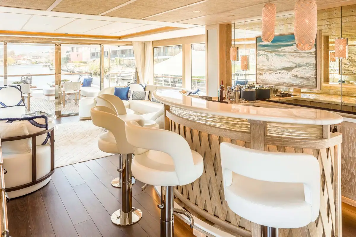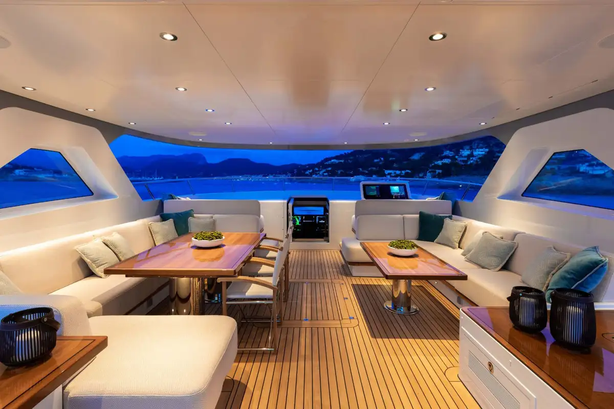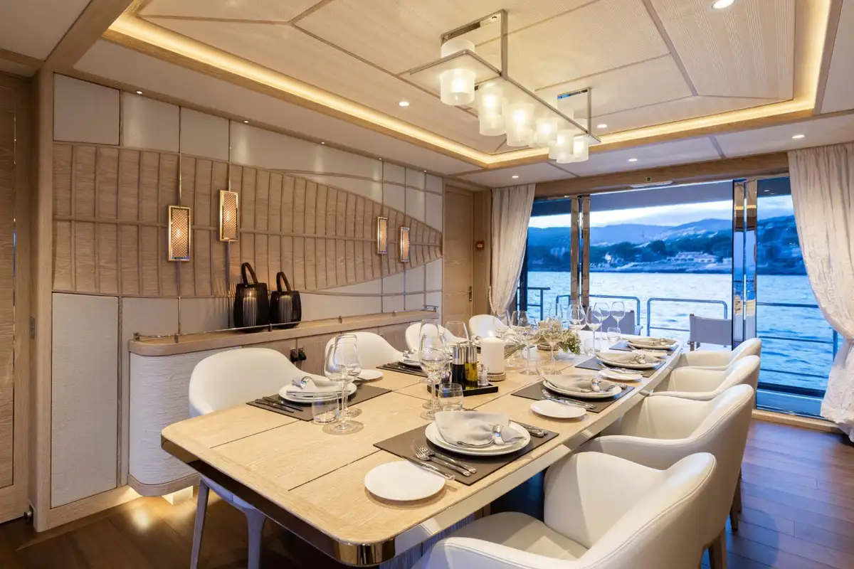Cocktails and hors d’oeuvres are served in the stunning lounge where CALYPSO I’s award-winning interior transports you to an understated yet elegant paradise. Think exclusive beach club vibes, where butter-soft leathers and chic light wood meet oversized cream sofas and a polished marble bar. A short walk aft deck leads you to a gastronomic feast, where you can reflect on the day’s fun and dream up tomorrow’s adventures.