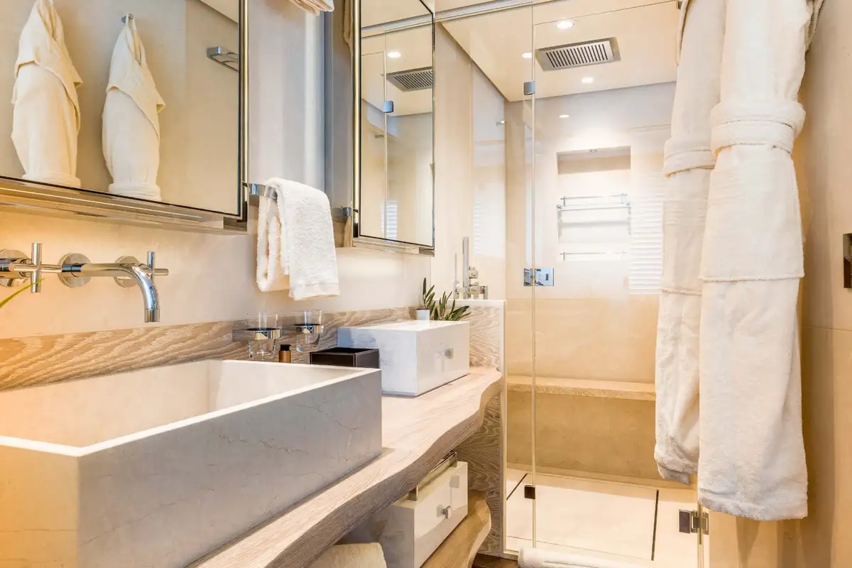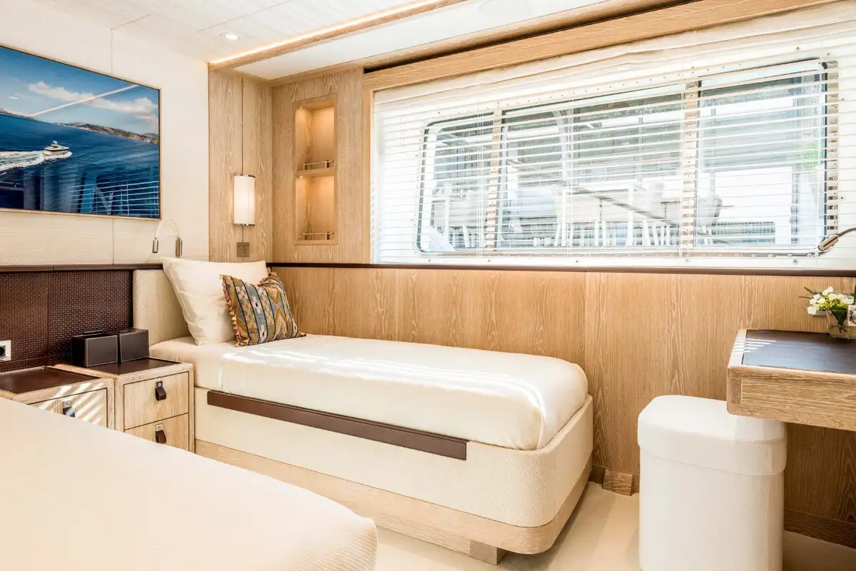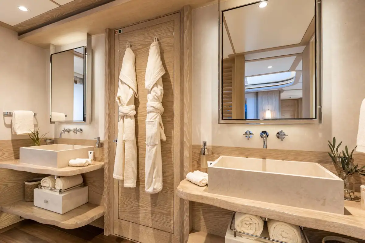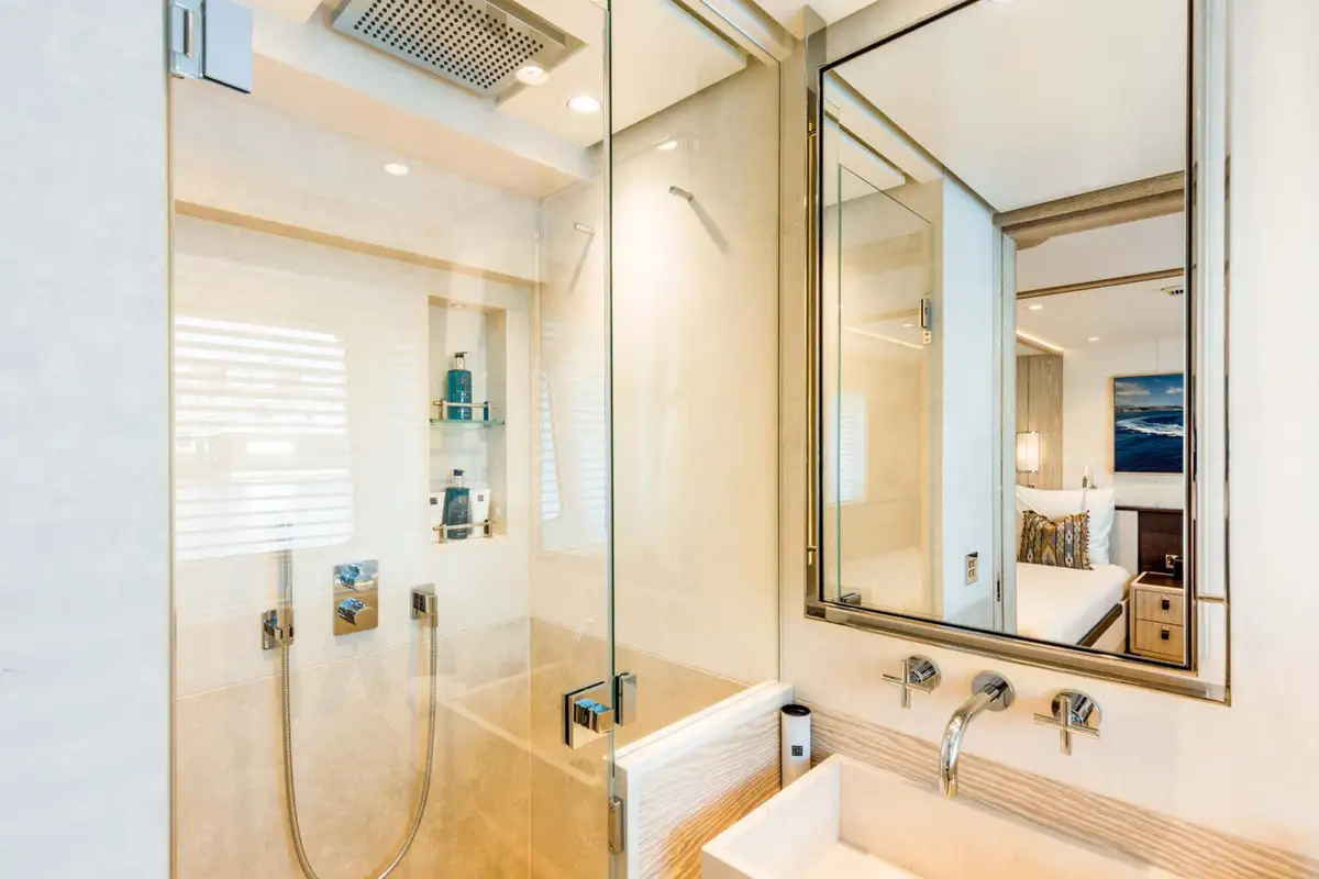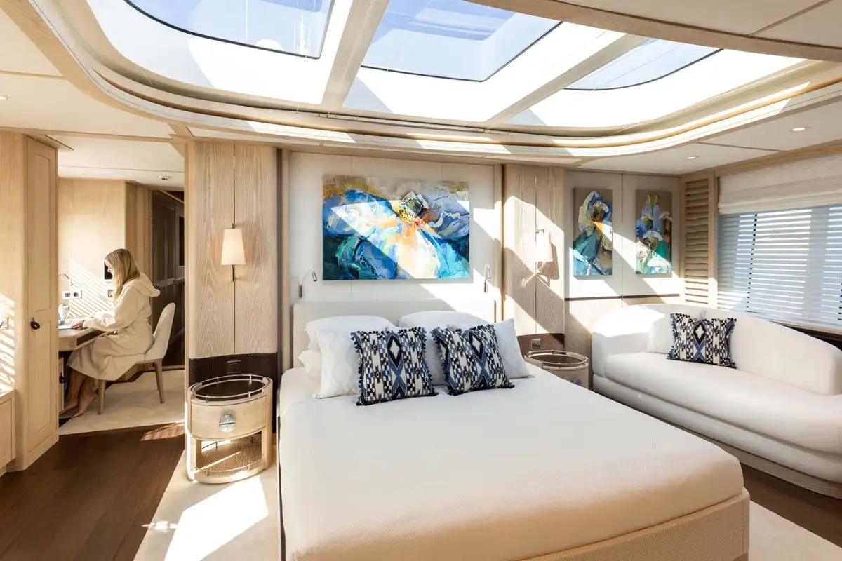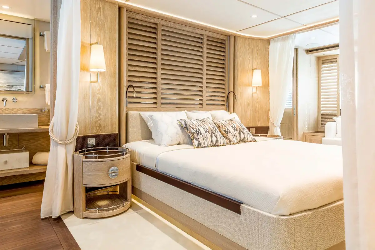 CALYPSO I's accommodation is ideal for family groups of up to 10 or four couples including a full beam owner’s suite on the main deck with a spectacular skylight, his and hers bathroom and direct access to a private seating area on the bow. Three further guest cabins on the lower deck include a full beam VIP cabin and two double cabins that convert to twin cabins, and additional capacity from pullman beds.